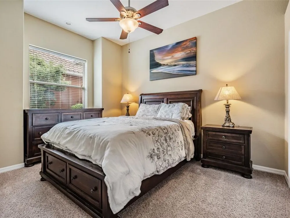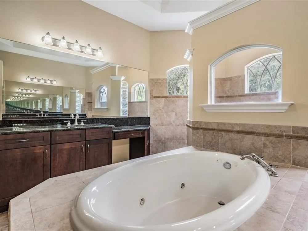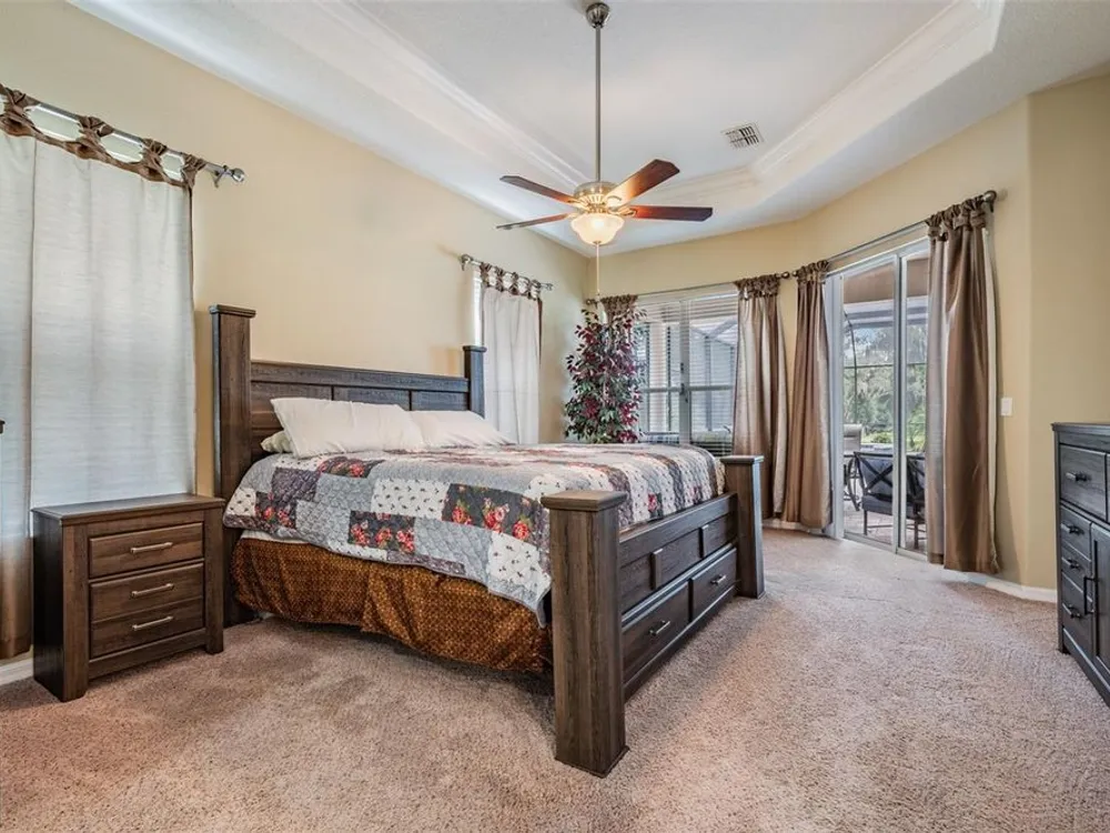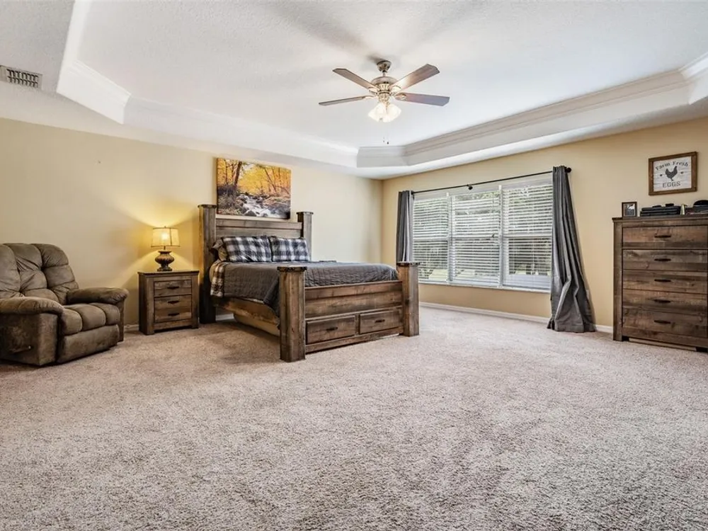 - Ceiling Fan(s), Crown Molding, Eat-in Kitchen, High Ceilings, Main Level Primary, Split Bedrooms, Stone Counters, Thermostat, Tray Ceiling(s), Walk-In Closet(s)