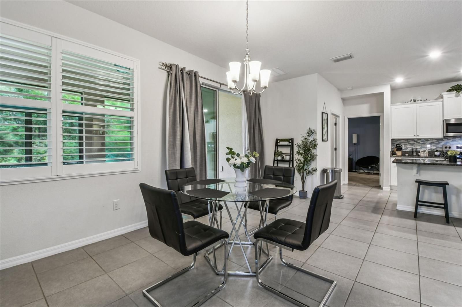 Welcome to Eastpointe at Lake Jovita, a gated community of 76 homes offering low-maintenance living with no CDD fees and lawn care included through the HOA. This 2020-built home features a contemporary open layout designed to bring in natural light, complemented by plantation shutters on every window. The kitchen includes granite countertops, stainless steel appliances, a center island with seating, and clear views into the dining and living areas.A set of sliding doors opens to a covered, screened lanai with no rear neighbors, creating a private outdoor space. The home’s location near the community entrance and adjacent to a maintained green space provides added separation, with only one neighboring home to one side.The primary suite is situated at the rear of the home and includes two walk-in closets and a bathroom with dual sinks and granite counters. A guest bedroom and full guest bathroom are positioned near the front entry. The additional flex room offers the versatility to be used as an office, den, or potential third bedroom, depending on the buyer’s needs.Lake Jovita provides several community features such as parks, playgrounds, dog park, pickleball courts, and basketball courts. Additional amenities, including golf, fitness, tennis, and dining, may be accessed through an optional membership with Lake Jovita. Conveniently located near I-75, this home offers access to nearby shopping, medical services, and regional travel routes. Measurements and community details should be verified by the buyer. Samsung BIG SCREEN T,V along with SOUND SYSTEM WILL STAY-