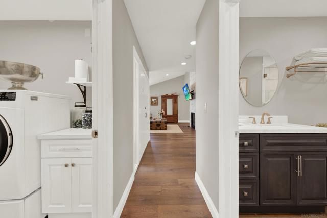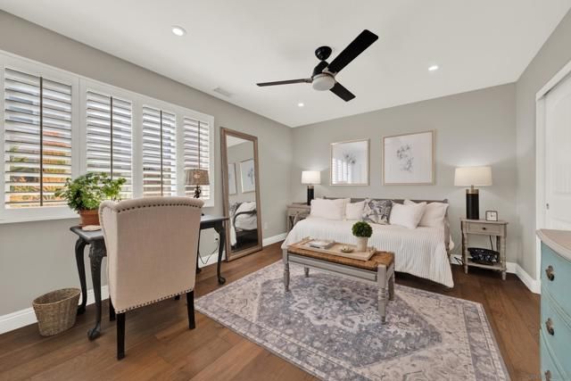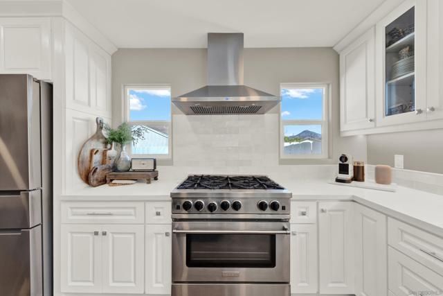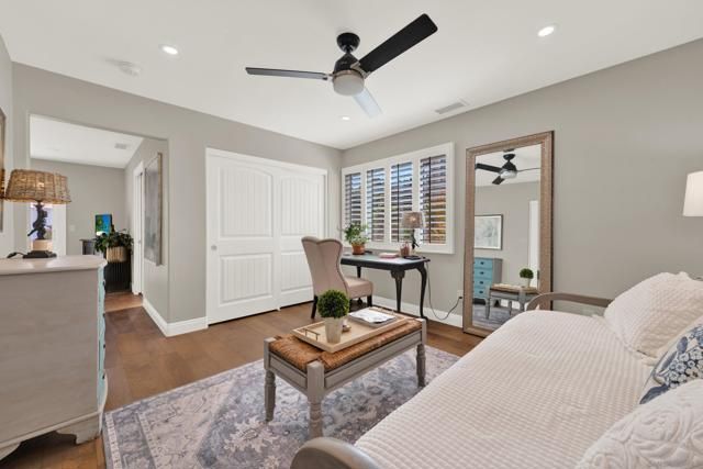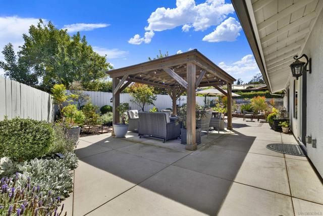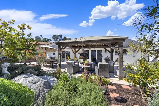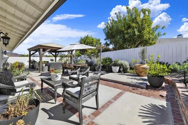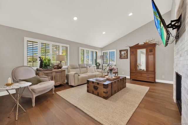 Welcome to this impeccably maintained, designer-inspired residence in the highly sought-after 55+ community of Seven Oaks. Every inch of this home has been thoughtfully curated and meticulously cared for, offering a truly “dialed-in” living experience. The heart of the home is the stunning, fully remodeled kitchen, featuring striking stone countertops with natural crystal detailing, soft-close cabinetry, stainless steel appliances, glass door kitchen cabinets, custom pull-out storage cabinets, oversized matte blue kitchen island, and exceptional functionality. Step inside to discover engineered wood flooring flowing seamlessly throughout, complemented by plantation shutters and a light-filled, open ambiance. Both bathrooms have been beautifully remodeled with spa-like walk-in showers, glass-doors, stone-like finishes, and newer showerheads/fixtures and finishes. The home continues to impress with a dual-sided fireplace from the family room to the dining room. Major upgrades provide peace of mind, including a newer roof, updated HVAC system, 200 AMP electrical panel, attic fan, dual-pane vinyl windows throughout, and newer rain gutters. The home also features a unique skip trowel texture throughout, enhancing its refined aesthetic. Outdoor spaces are equally inviting, with paver-lined driveway and walkways, a full exterior sprinkler system, a gorgeous wood gazebo/pergola, complete with outdoor solar lighting, and a private setting to enjoy picturesque mountain views. A storage shed adds additional convenience. Freshly repainted inside and out, this home is truly move-in ready and showcases pride of ownership at every turn. Experience elevated living in one of North County’s most desirable active communities—where comfort, style, and quality come together effortlessly.