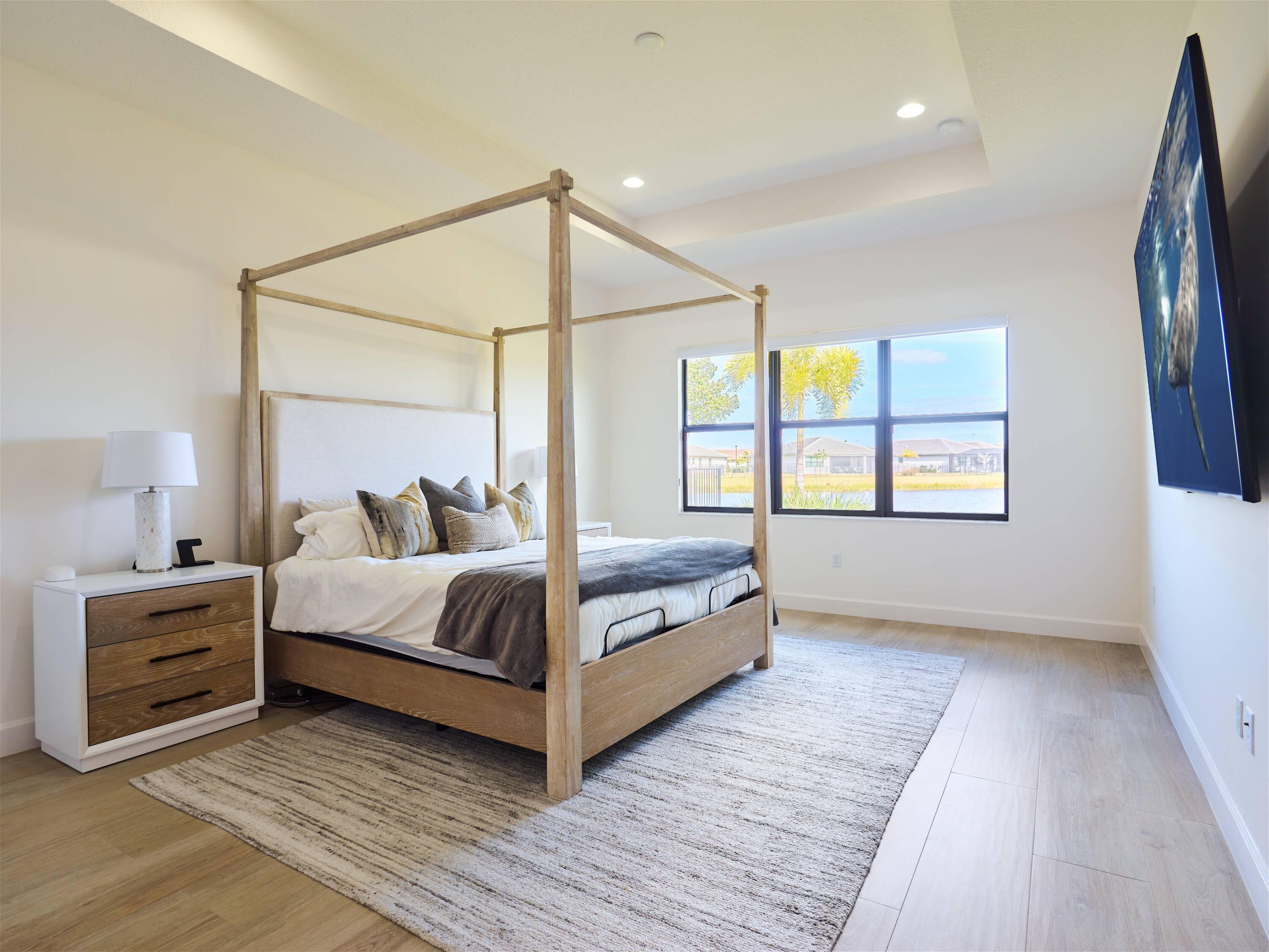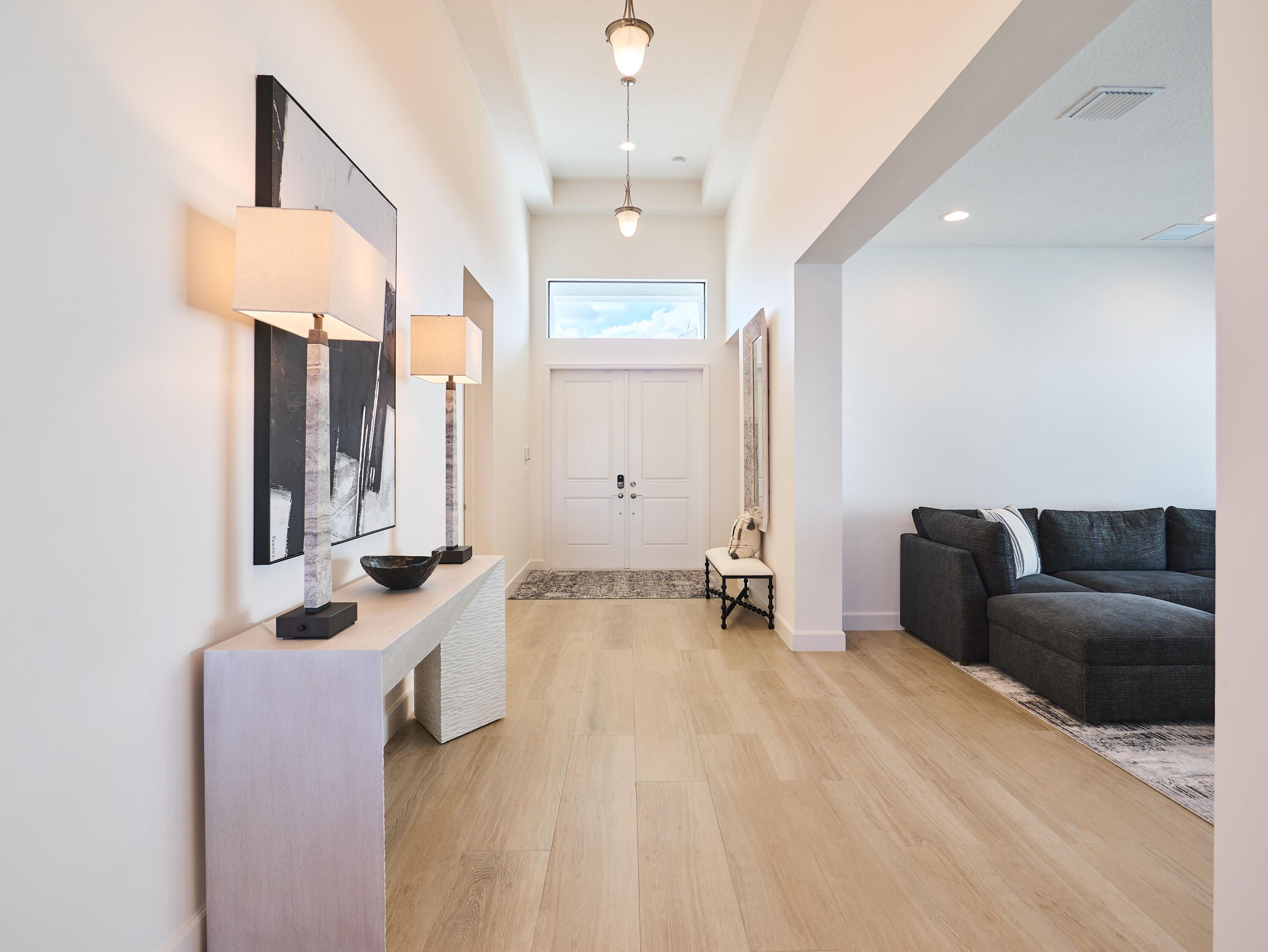 Experience the pinnacle of luxury living in this pristine Trivoli model, situated on a rare, oversized end lot with breathtaking long water views in Valencia Walk at Riverland. Built in 2023, this fabulous home features 3 spacious bedrooms, 4 full bathrooms, a versatile club room (potential 4th bedroom), and a dedicated den, all showcasing stylish wide-plank tile flooring throughout. Step inside to an expansive open-concept layout bathed in natural light, featuring high coffered ceilings with abundant recessed lighting. The gourmet kitchen is a chef's delight, boasting GE stainless steel appliances, sleek white cabinetry with soft-close doors, stunning quartz countertops, a natural gas stove with range hood, and a massive center island. The primary suite offers serene lake views and a a luxurious en-suite bathroom with dual quartz vanities, ceiling-high mirrors, a spa-like tub, and an oversized shower with floor-to-ceiling tile. Two generous guest suites, each with their own en-suite bathroom and walk-in closet, provide ample space and privacy for visitors. Premium upgrades include wide plank-tile flooring, custom master closets, a built-out laundry room, and professional epoxy garage flooring. Step outside to the large covered and screened patio to take in beautiful sunrises over the longest part of the lake, with plenty of room on the premium lot for a future pool. Located just steps from the clubhouse, residents of Riverland enjoy an unparalleled lifestyle within a 4,000-acre master-planned community. Enjoy access to a 16-acre Sports & Racquet Club, a 51,000 sq ft Wellness & Fitness Center, a 5-acre Arts & Culture Center, and future Town Center, making this an exceptional place to call home.
