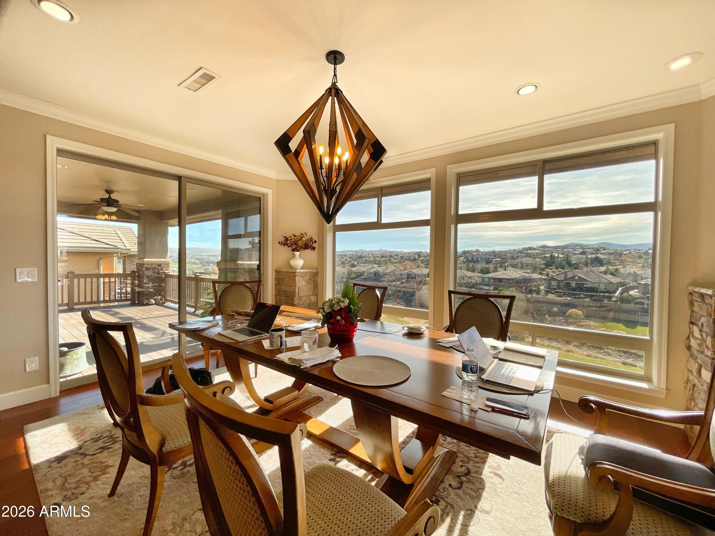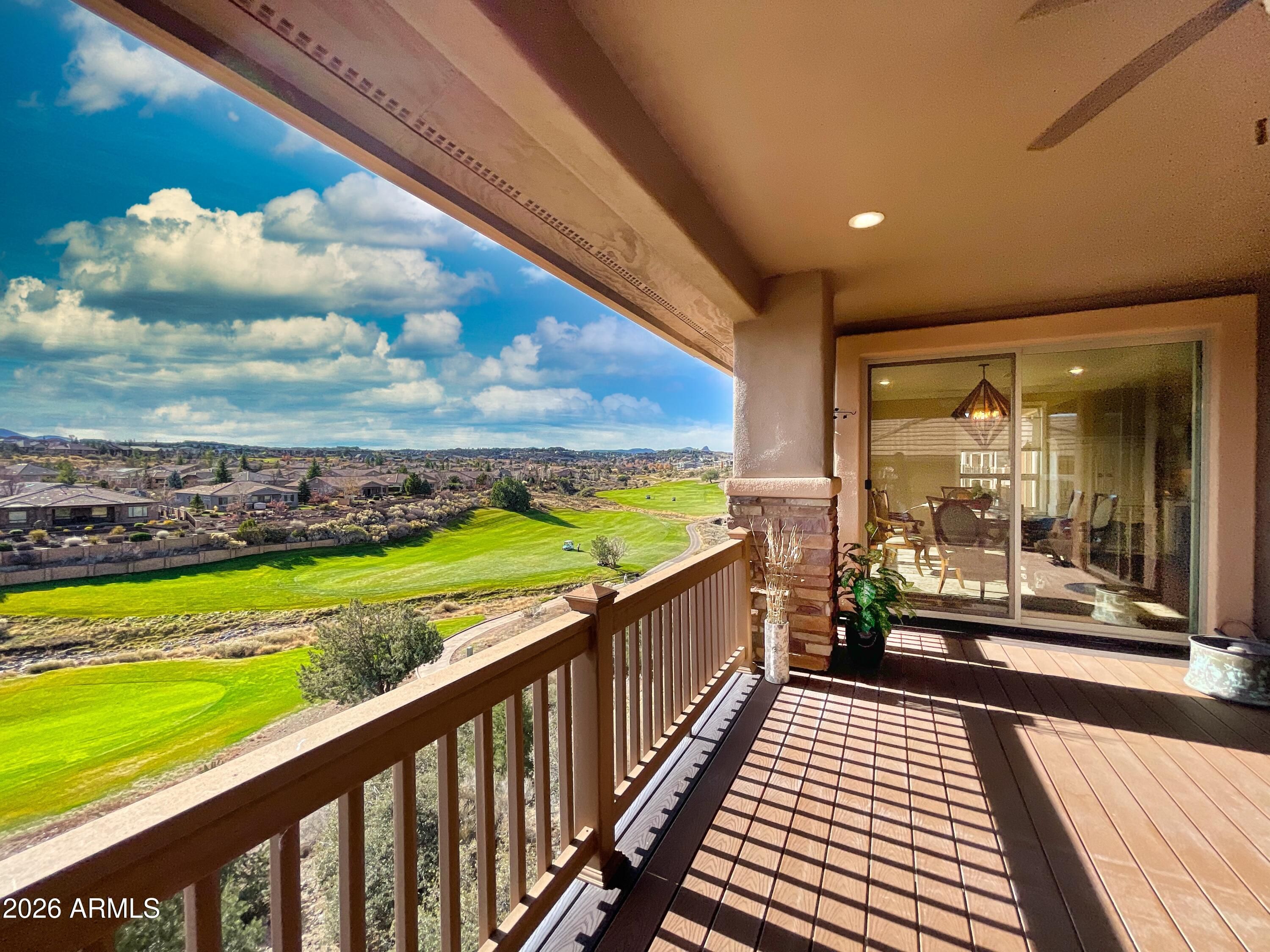 Welcome to an exceptional home in the gated, Prescott Lakes Ctry Club community of Solstice Ridge, perfectly positioned high above the 8th hole for PANORAMIC GOLF COURSE VIEWS with rare safety from stray shots. Awesome views in all directions and from multiple decks & patios. This beautifully designed home features an ELEVATOR to both levels, a chef's kitchen with oversized granite island, Thermador appliances, custom cabinetry, wine storage, and designer lighting. The primary suite offers a fireplace, soaking tub, walk-in shower, and private deck with views. Downstairs includes a spacious entertainment level with CUSTOM BAR, media lounge, ensuite, fitness area and outdoor access. Additional upgrades include a HIGH END solar system producing appox. 32+ kWh daily. -- Ample storage off lower level and in easy-access attic space above garage -- 3 total fireplaces, natural gas, wall-switched with heat-a-lator blowers -- Open concept in upper level public areas, 9' ceilings with crown molding -- Lower level with 10' ceilings -- Ceiling fans in most rooms -- Whole house exhaust fan for summer evenings -- Desert landscaping with automatic irrigation system (shrubs, etc.) plumbed independently from house. Rear lot line borders golf course. -- HOA name: Prescott Lakes Community Association -- Builder: Pasadena Custom Homes -- Monthly fees include social membership to the Club at Prescott Lakes, includes gym, pools, and restaurant. Golf available (various plans) at 18-hole Hale Irwin Signature golf course. Personal golf carts permitted. -- 400-amp electrical service ideal for EVs, hot water recirculation for instant hot water, UV-protected south-facing windows, and spa-ready deck with 220V. The oversized epoxy-finished garage fits THREE CARS plus a pickup and golf cart. A rare combination of luxury, efficiency, and lifestyle in one of Prescott's most desirable communities.