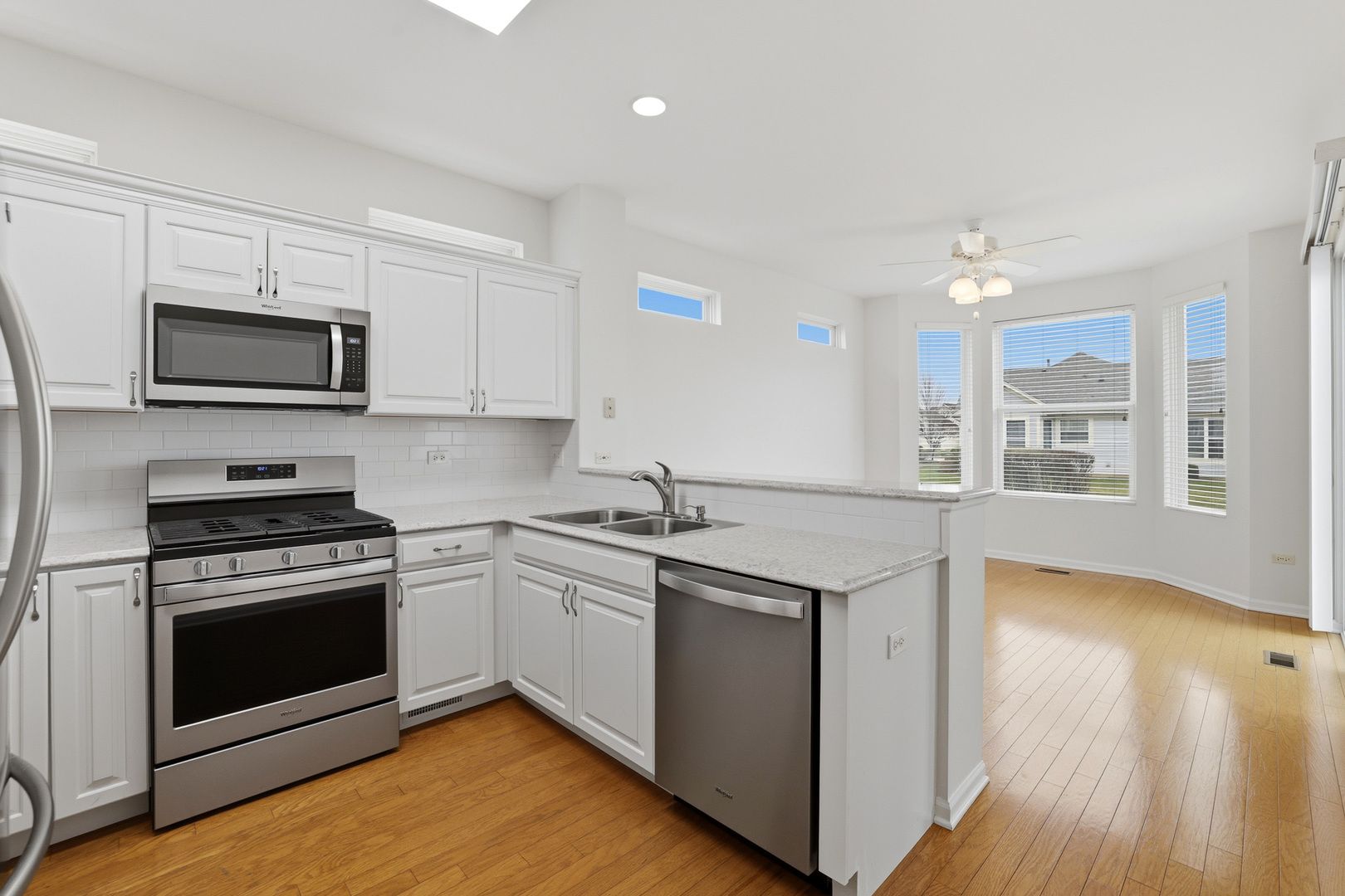 Beautifully Updated Escanaba model perfectly situated about a mile from the amazing Prairie Lodge. This move-in ready 2 bedroom, 2 bath home offers easy single-story living with modern updates throughout. The Newly polished hardwood floors flow from the foyer thru the hallway and into the kitchen/breakfast area, creating a cozy and inviting feel. The kitchen greets you with BRAND NEW White Cabinets and Quartz Countertops; and SS appliances that are just a few years old. The breakfast area features a bay window letting in plenty of sunshine. The living room boasts NEW carpeting and a large window continuing the light and bright feel of the home. The primary and 2nd bedrooms also feature NEW Carpeting and both baths have been updated with NEW Luxury Vinyl Plank flooring. A lovely yard with a lawn irrigation system and a great patio to enjoy the summer. Additional updates include a NEW Furnace and Air Conditioner for added peace of mind. New paint in the living room, kitchen and foyer. The roof was new in 2017 and last, but not least, NEW Ceiling fans have been installed in the kitchen, living room and bedrooms. Come and enjoy all the amenities that Sun City has to offer! A gorgeous clubhouse, indoor and outdoor pools, fitness centers, tennis & pickleball courts, Wood shop, numerous activities and so much more!