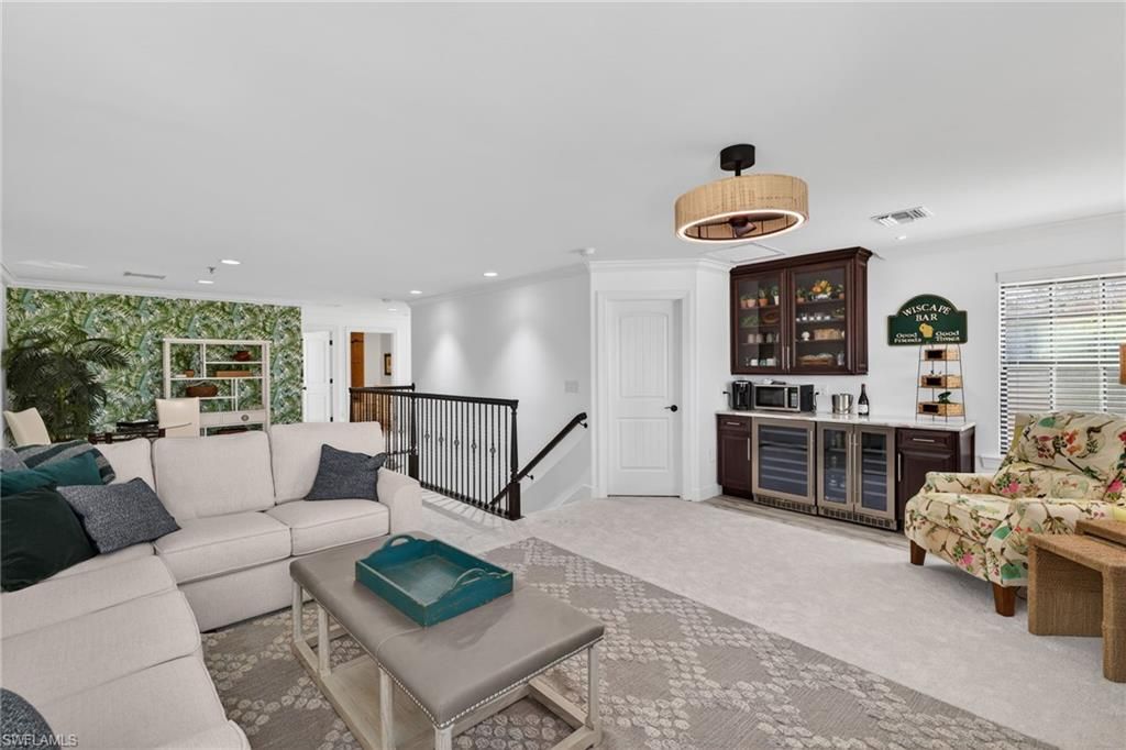 Experience elevated living in this Stonewater two story floor plan, with the option to secure immediate golf membership access to The Plantation Golf and Country Club. This 3,969 sq ft residence, built in 2017, offers four bedrooms plus a bonus room, four and a half baths including a pool bath, and a three car garage.The main level features three en suite bedrooms including the primary suite, a bonus room with French doors, an electric fireplace with recessed Frame TV, and wood look plank tile flooring. The kitchen is designed for both style and function with an oversized island, instant hot faucet, upgraded appliances, and a large walk in pantry with built in shelving and an electrical outlet.The primary suite provides a serene retreat with a custom walk in closet, double vanity, and an oversized walk in shower.The second level offers a private sanctuary complete with a spacious loft, a built in bar with beverage refrigerator, an oversized walk in storage closet, new carpet, and an additional en suite bedroom.Outdoor living is elevated by a saltwater pool with multiple water features and adjustable lighting, a sun shelf with umbrella holder, a climate controlled pool bath, a pool storage closet, a new pool pump, upgraded Pentair app enabled controls, landscape lighting, and lanai cage lighting. From the covered lanai, enjoy tranquil views of the community lake and its illuminated water fountain—an elegant backdrop for both daytime relaxation and evening entertaining.Hurricane protection includes remote operated shutters on all upstairs windows and the lanai, along with manual shutters on the first floor windows.Recent upgrades include two new air conditioners with app based controls (2024), a Halo whole home water purification system, and a new water heater (2025).Additional enhancements include upgraded garage flooring and cabinetry, professional exterior paint (2025), plantation shutters, an Arlo camera doorbell, and a central vacuum system.Somerset at The Plantation offers an exceptional amenity package including pickleball, tennis, two pools, sauna, massage and facial rooms, a fitness center, bocce ball, a library, and numerous social clubs. HOA services include Hotwire internet and cable, irrigation, lawn mowing, fertilization, landscape trimming, and mulching. Optional golf and social memberships are available at The Plantation Golf & Country Club, featuring an 18 hole Hurdzan Fry championship course, driving range, putting green, and on site dining.This home is ideally located near I 75, shopping, dining, RSW airport, and Gulf beaches.