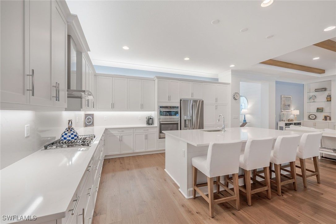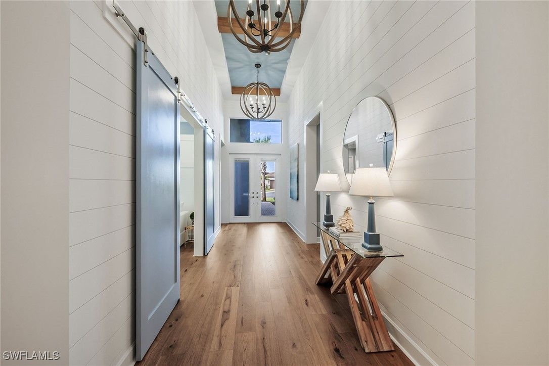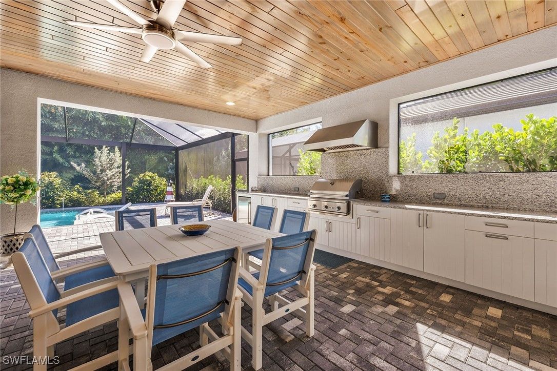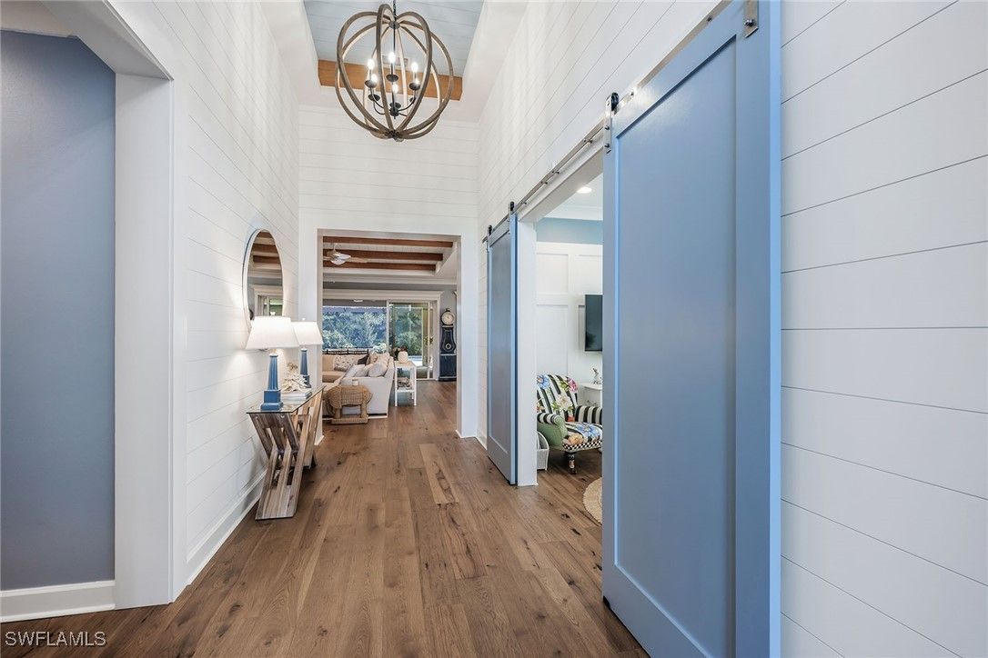 Serena & Lily–inspired Captiva model home in Valencia Trails featuring extensive high-end upgrades throughout. On a prestigious, high-end cul-de-sac, this residence offers the ultimate blend of privacy and architectural sophistication. Enjoy exceptional indoor-outdoor living with a beautiful great room, kitchen with a large island and sliding glass doors that lead to a 1,200-plus-square-foot lanai. The extended lanai features a Southern Yellow Pine plank ceiling, custom outdoor kitchen, fireplace, and picture frame screen showcasing professionally designed landscape. This beautifully designed residence offers four bedrooms with en-suite baths, plus an additional half bath for guests. The fourth bedroom includes a custom Murphy bed with built-in bookshelves, making it ideal as a home office or guest suite. Custom shiplap, beam ceilings and crown molding add timeless coastal character throughout the home. Additional upgrades include engineered pecan wood flooring throughout, three-car garage, a whole-house generator, Storm Smart hurricane shutters and custom-designed primary suite closets. Resort-style living awaits at Valencia Trails, where a state-of-the-art clubhouse anchors the community with a modern fitness center, on-site restaurant and poolside bar. Resort pools, including a resistance pool, along with all racquet sports. Additional amenities include a full-service spa, private theater, billiards and card rooms, cooking classes, and dog parks for large and small breeds.