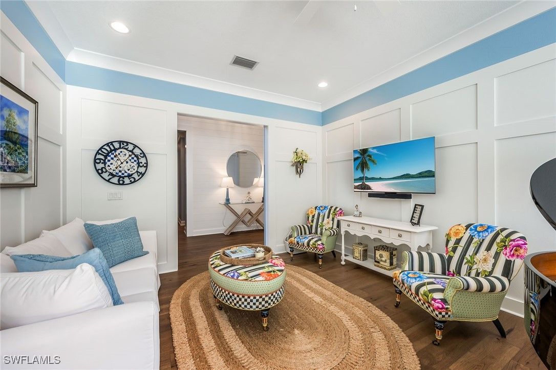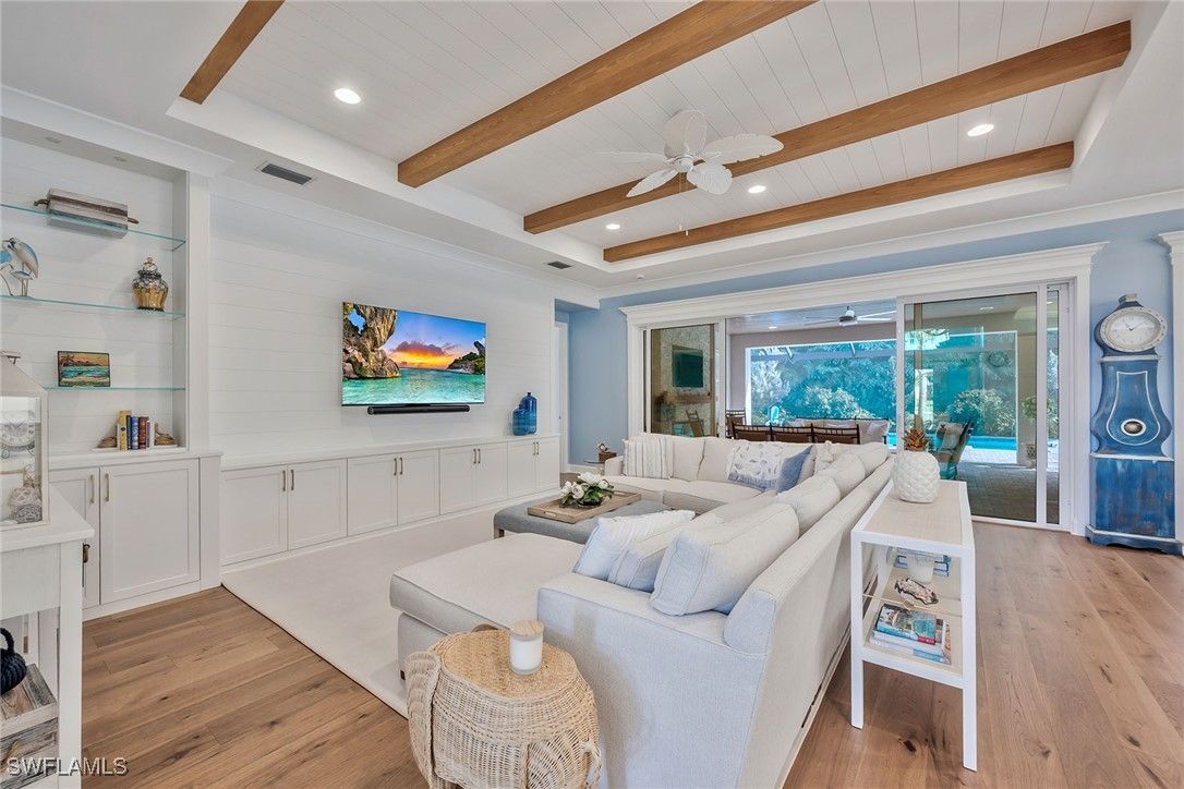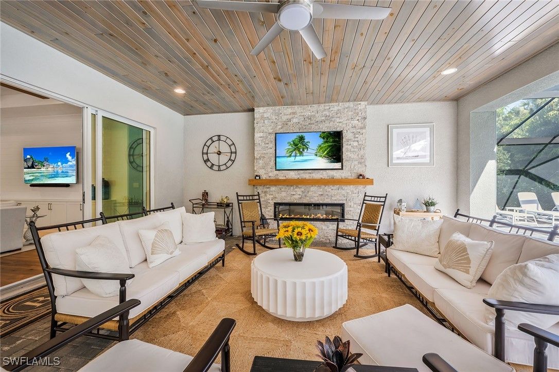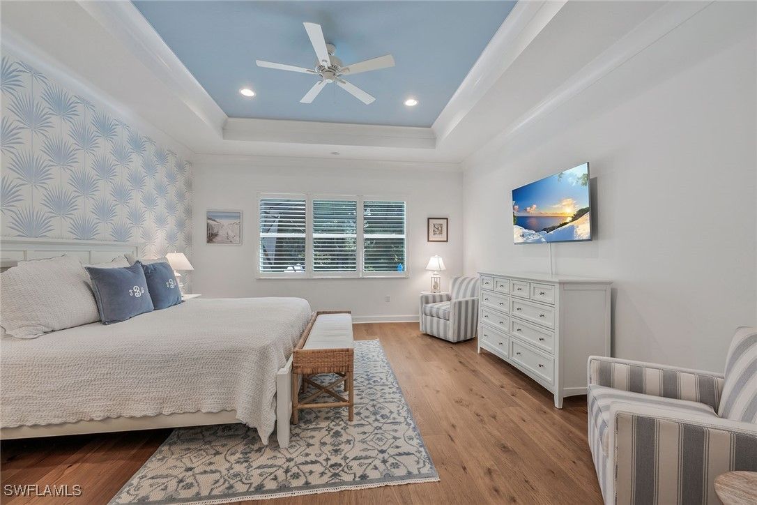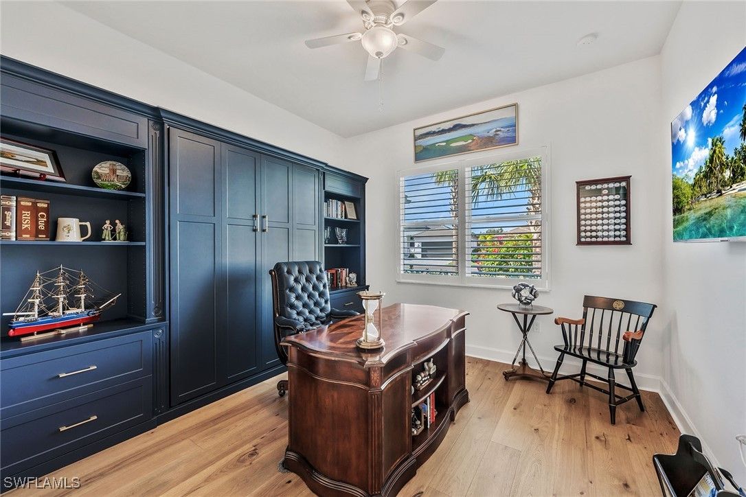 Serena & Lily–inspired Captiva model home in Valencia Trails featuring extensive high-end upgrades throughout. On a prestigious, high-end cul-de-sac, this residence offers the ultimate blend of privacy and architectural sophistication. Enjoy exceptional indoor-outdoor living with a beautiful great room, kitchen with a large island and sliding glass doors that lead to a 1,200-plus-square-foot lanai. The extended lanai features a Southern Yellow Pine plank ceiling, custom outdoor kitchen, fireplace, and picture frame screen showcasing professionally designed landscape. This beautifully designed residence offers four bedrooms with en-suite baths, plus an additional half bath for guests. The fourth bedroom includes a custom Murphy bed with built-in bookshelves, making it ideal as a home office or guest suite. Custom shiplap, beam ceilings and crown molding add timeless coastal character throughout the home. Additional upgrades include engineered pecan wood flooring throughout, three-car garage, a whole-house generator, Storm Smart hurricane shutters and custom-designed primary suite closets. Resort-style living awaits at Valencia Trails, where a state-of-the-art clubhouse anchors the community with a modern fitness center, on-site restaurant and poolside bar. Resort pools, including a resistance pool, along with all racquet sports. Additional amenities include a full-service spa, private theater, billiards and card rooms, cooking classes, and dog parks for large and small breeds.