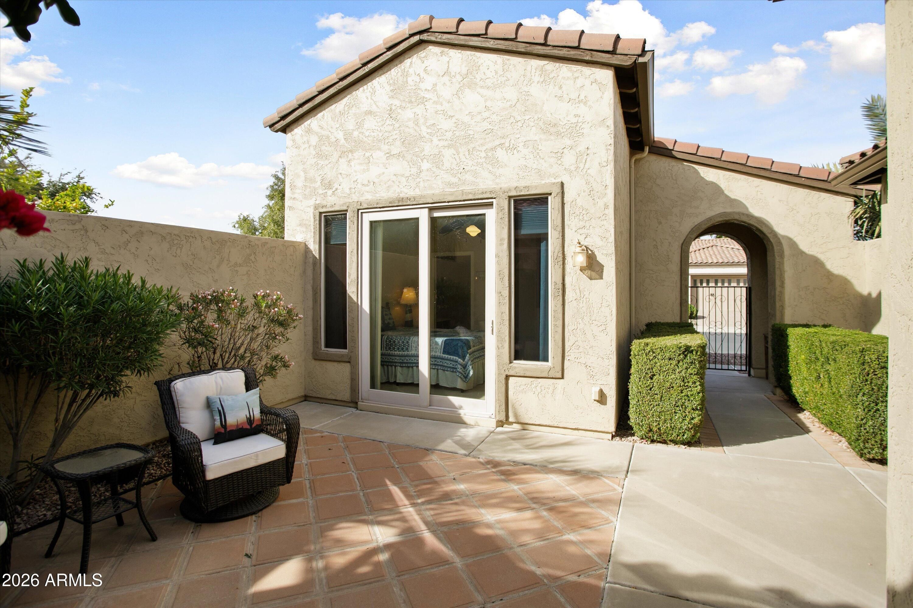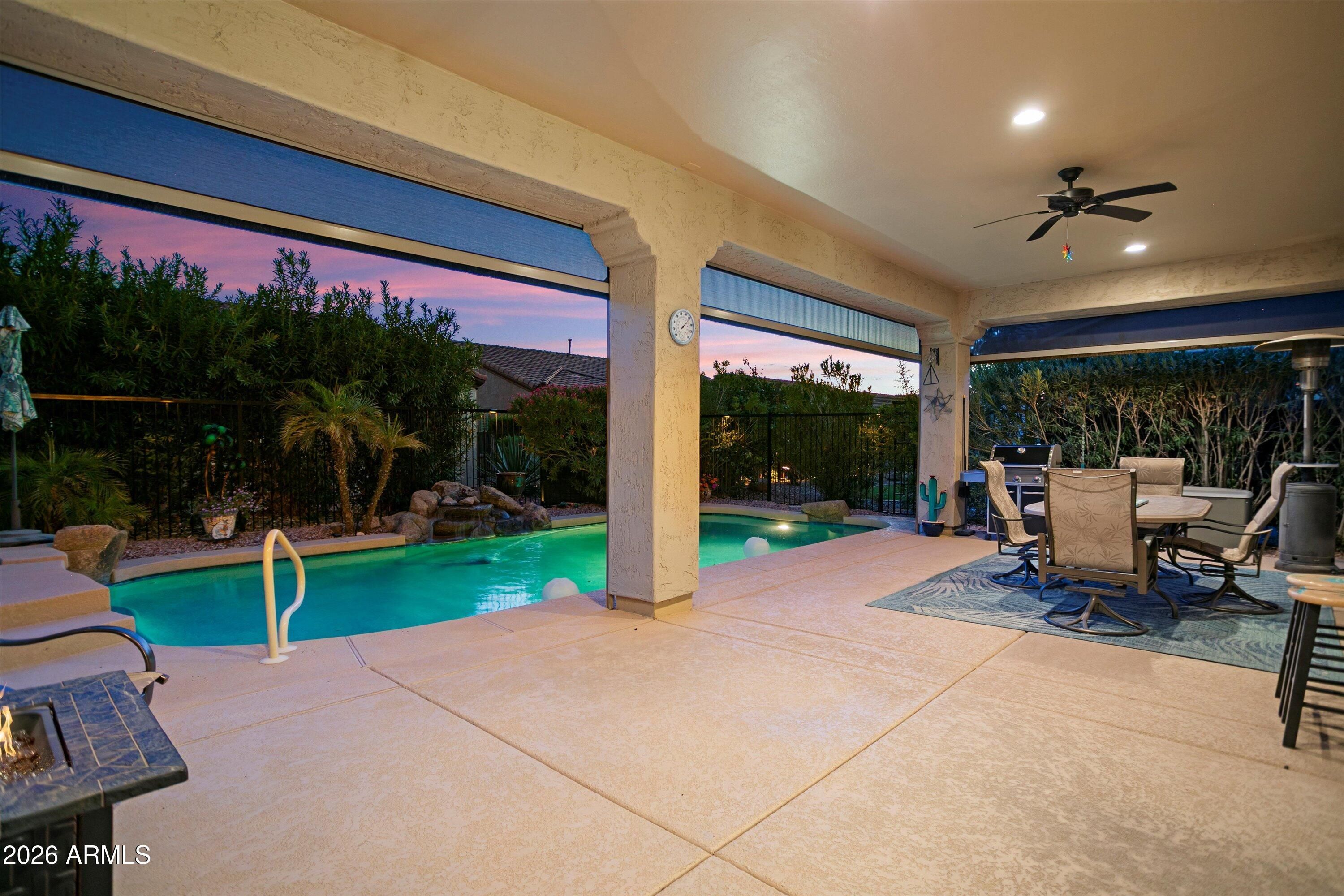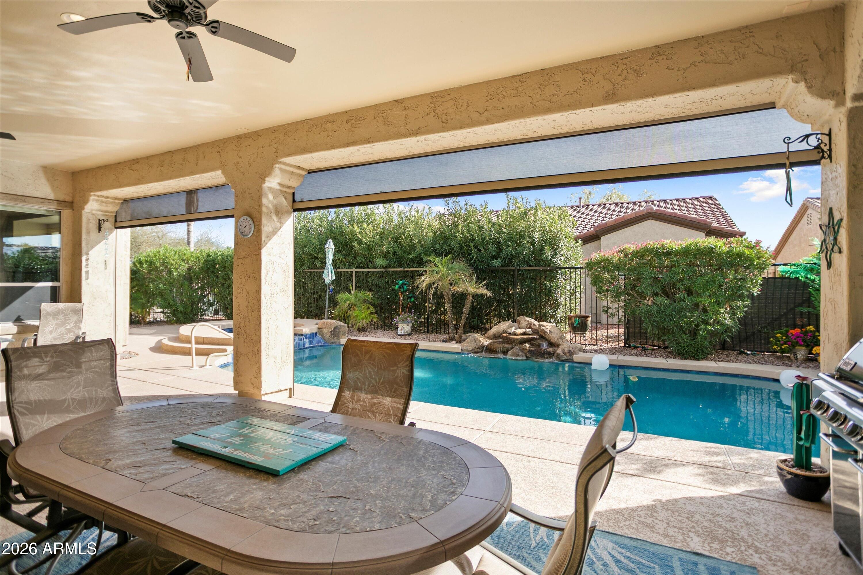BEAUTIFUL HOME FRESHLY PAINTED IN 2025. 3 BED 3 BATH. PRIVATE GATED ENCLOSED FRONT COURTYARD. THE BACKYARD IS A TRUE RETREAT FEATURING A HEATED POOL WITH AN ELEVATED SEPARATELY HEATED SPA AND WATERFALL, PERFECT FOR YEAR-ROUND ENJOYMENT. A CHARMING CASITA WITH A FULL BATH OFFERS FLEXIBLE SPACE IDEAL FOR GUESTS, HOME OFFICE, OR WORKOUT STUDIO. 10 FT CELINGS INSIDE MAIN HOME HAS A NEUTRAL COLOR PALETTE, CREATING A BRIGHT OPEN FEEL. THE UPDATED EAT-IN KITCHEN SHOWCASES BEAUTIFUL CABINETRY, NEW QUARTZ COUNTERTOPS AND SINK, A LARGE ISLAND WITH BAR SEATING AND NEWER GE APPLIANCES. EASY FLOW INTO THE SPACIOUS GREAT ROOM WITH DIRECT ACCESS TO THE POOL. HUNTER DOUGLAS TOP-DOWN/BOTTOM-UP SHADES ADD BOTH STYLE AND FUNCTION. THE SERENE PRIMARY SUITE OFFERS 2 SEPARATE CLOSETS. CONTEMPORARY UPDATED BATH OFFERS 2 NEW DROP-IN KOHLER SINKS AND LIGHTING, REDONE COUNTERTOPS AND NEW PLUMBING & A HUGE TILED WALK-IN SHOWER W/PREMIUM GLASS ENCLOSURE. ATTACHED 2-CAR GARAGE W/ 4 FT. EXTENSION AND BUMP-OUT FOR A GOLF CART /EXTRA STORAGE. 3 NEW HVAC UNITS. FURNITURE IN CASITA AVAILABLE FOR $1 ON SEPARATE BILL OF SALE. EXTENSIVE LIST OF UPDATES AVAILABLE ON THE DOCUMENT TAB. Located in award-winning gated, 55+ Trilogy at Vistancia with 5-star-resort style amenities at the 35,000 SF Kiva Club with indoor & outdoor pools, fitness center, day spa, cafe, billiards, meeting rooms, library, tennis courts, pickle ball, bocce ball, events & a plethora of activities to choose from. Outstanding Gary Panks-designed golf course is woven throughout the neighborhood. The Mita Club has additional community amenities. Easy access from Trilogy to the 303, shopping, restaurants, entertainment, Lake Pleasant & Paloma Park.