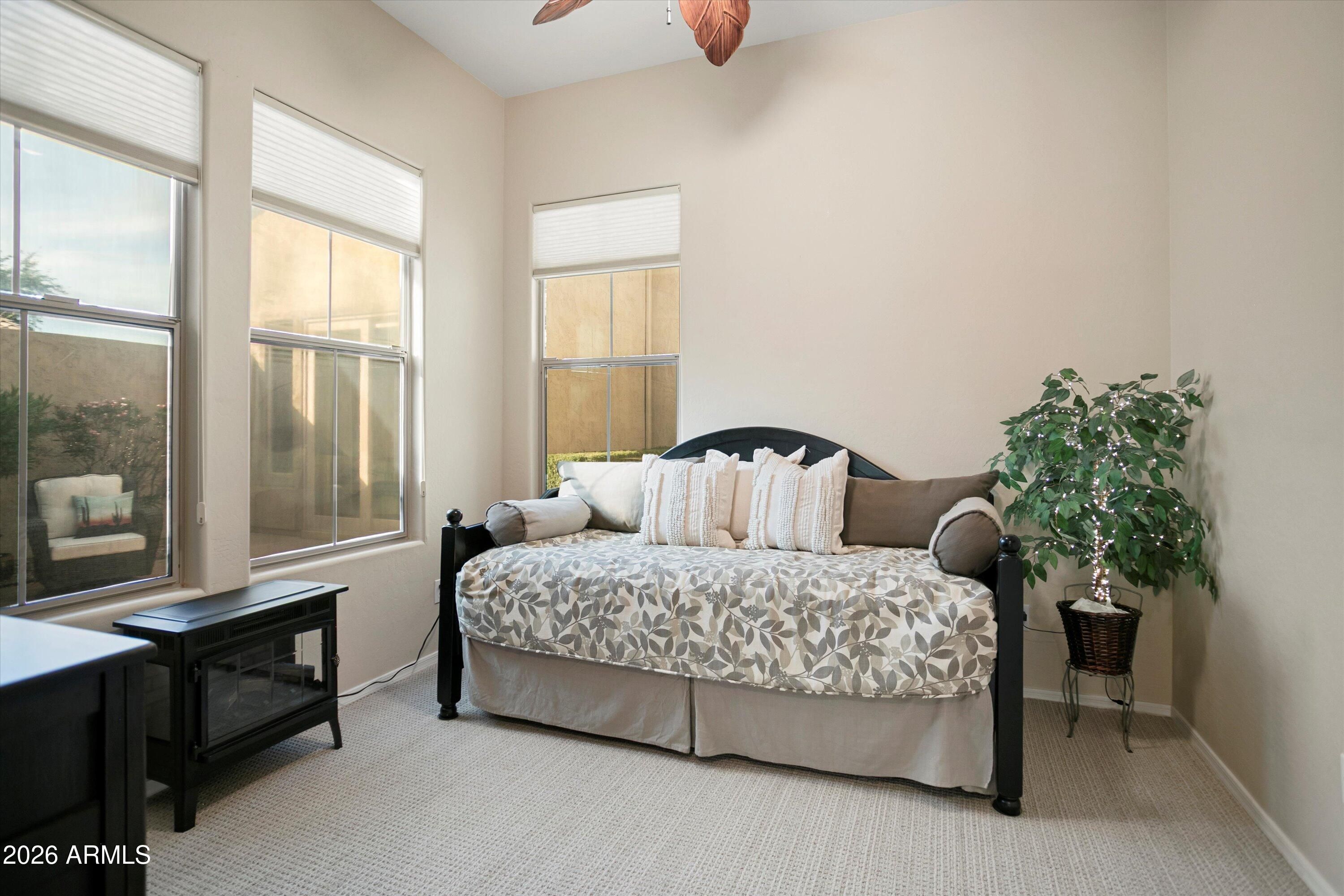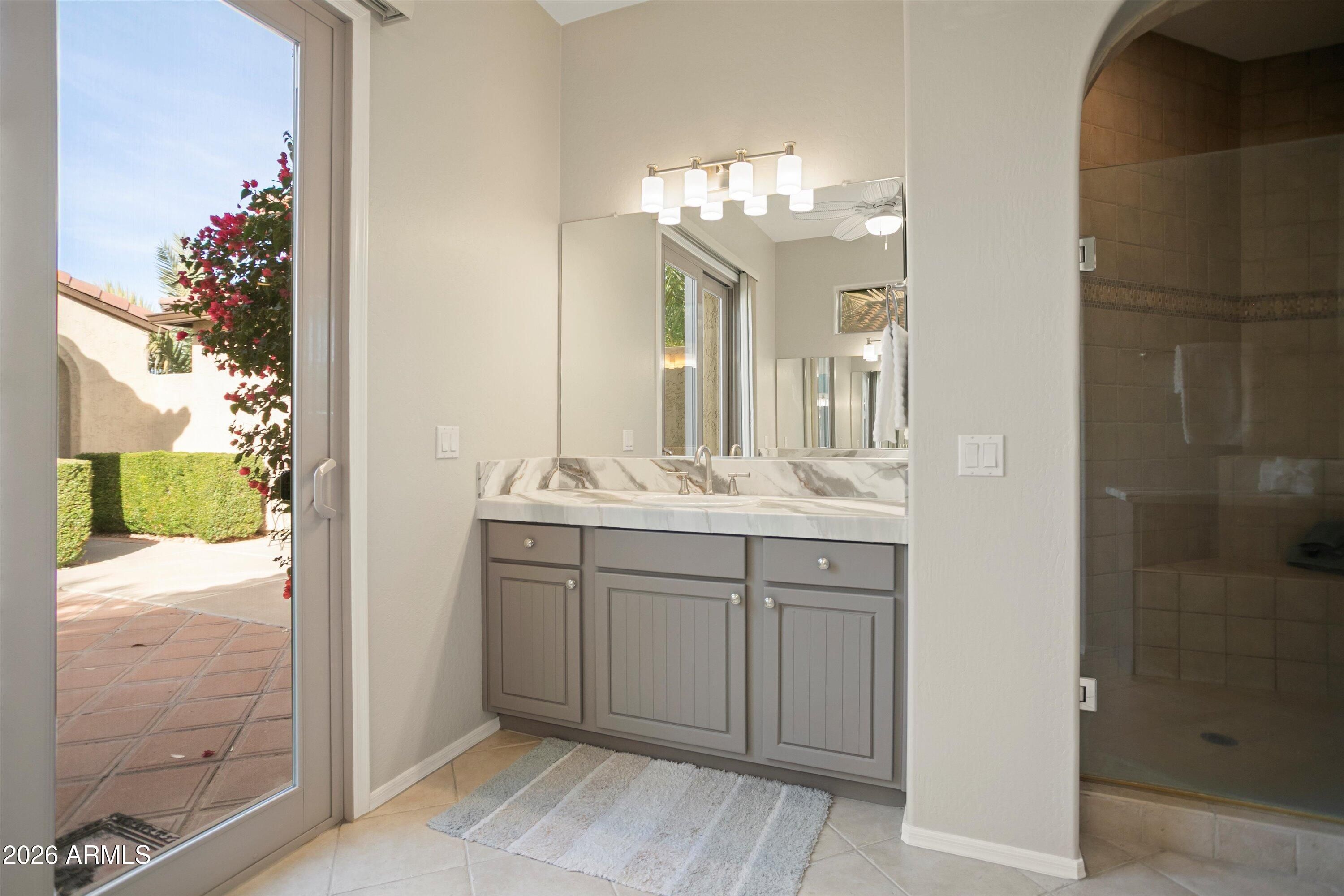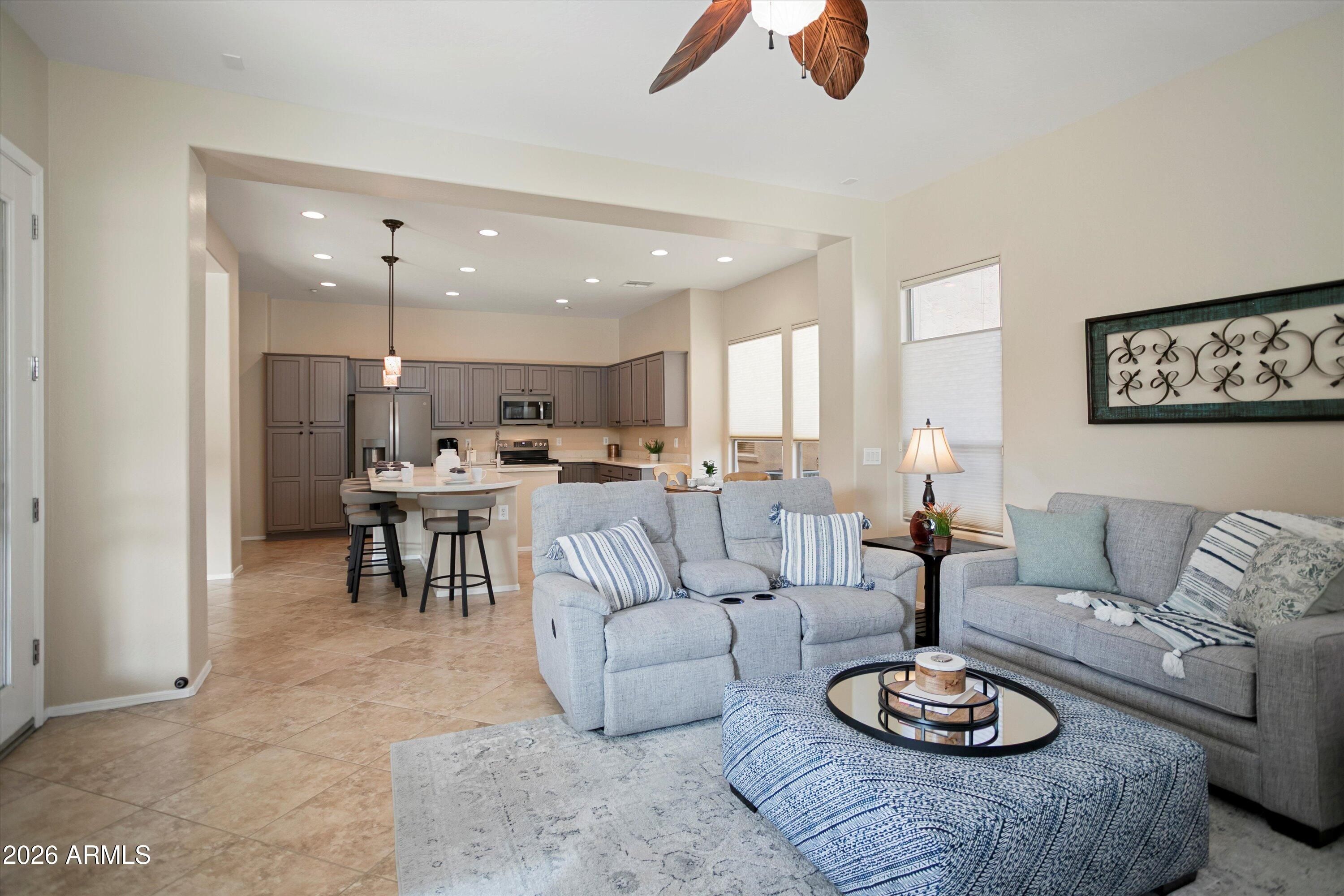 BEAUTIFUL HOME FRESHLY PAINTED IN 2025. 3 BED 3 BATH. PRIVATE GATED ENCLOSED FRONT COURTYARD. THE BACKYARD IS A TRUE RETREAT FEATURING A HEATED POOL WITH AN ELEVATED SEPARATELY HEATED SPA AND WATERFALL, PERFECT FOR YEAR-ROUND ENJOYMENT. A CHARMING CASITA WITH A FULL BATH OFFERS FLEXIBLE SPACE IDEAL FOR GUESTS, HOME OFFICE, OR WORKOUT STUDIO. 10 FT CELINGS INSIDE MAIN HOME HAS A NEUTRAL COLOR PALETTE, CREATING A BRIGHT OPEN FEEL. THE UPDATED EAT-IN KITCHEN SHOWCASES BEAUTIFUL CABINETRY, NEW QUARTZ COUNTERTOPS AND SINK, A LARGE ISLAND WITH BAR SEATING AND NEWER GE APPLIANCES. EASY FLOW INTO THE SPACIOUS GREAT ROOM WITH DIRECT ACCESS TO THE POOL. HUNTER DOUGLAS TOP-DOWN/BOTTOM-UP SHADES ADD BOTH STYLE AND FUNCTION. THE SERENE PRIMARY SUITE OFFERS 2 SEPARATE CLOSETS. CONTEMPORARY UPDATED BATH OFFERS 2 NEW DROP-IN KOHLER SINKS AND LIGHTING, REDONE COUNTERTOPS AND NEW PLUMBING & A HUGE TILED WALK-IN SHOWER W/PREMIUM GLASS ENCLOSURE. ATTACHED 2-CAR GARAGE W/ 4 FT. EXTENSION AND BUMP-OUT FOR A GOLF CART /EXTRA STORAGE. 3 NEW HVAC UNITS. FURNITURE IN CASITA AVAILABLE FOR $1 ON SEPARATE BILL OF SALE. EXTENSIVE LIST OF UPDATES AVAILABLE ON THE DOCUMENT TAB. Located in award-winning gated, 55+ Trilogy at Vistancia with 5-star-resort style amenities at the 35,000 SF Kiva Club with indoor & outdoor pools, fitness center, day spa, cafe, billiards, meeting rooms, library, tennis courts, pickle ball, bocce ball, events & a plethora of activities to choose from. Outstanding Gary Panks-designed golf course is woven throughout the neighborhood. The Mita Club has additional community amenities. Easy access from Trilogy to the 303, shopping, restaurants, entertainment, Lake Pleasant & Paloma Park.