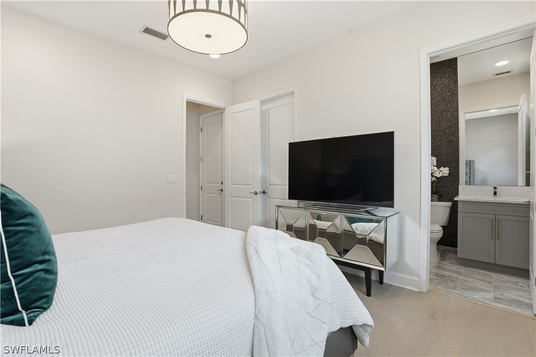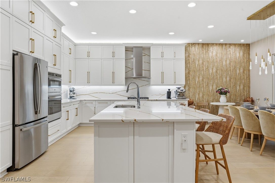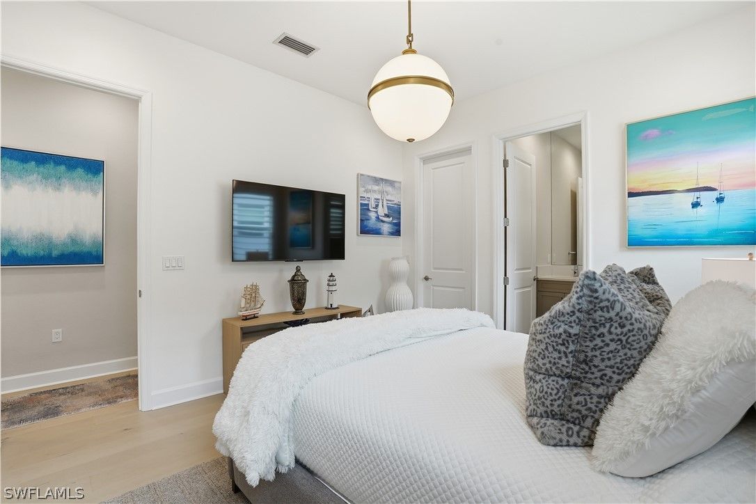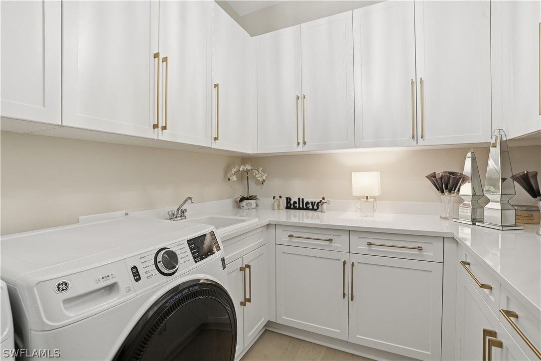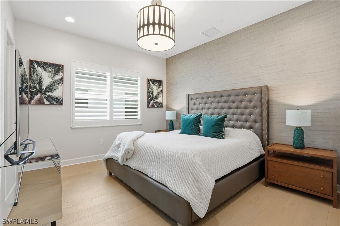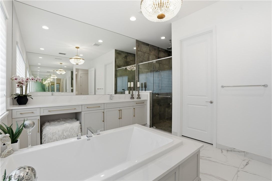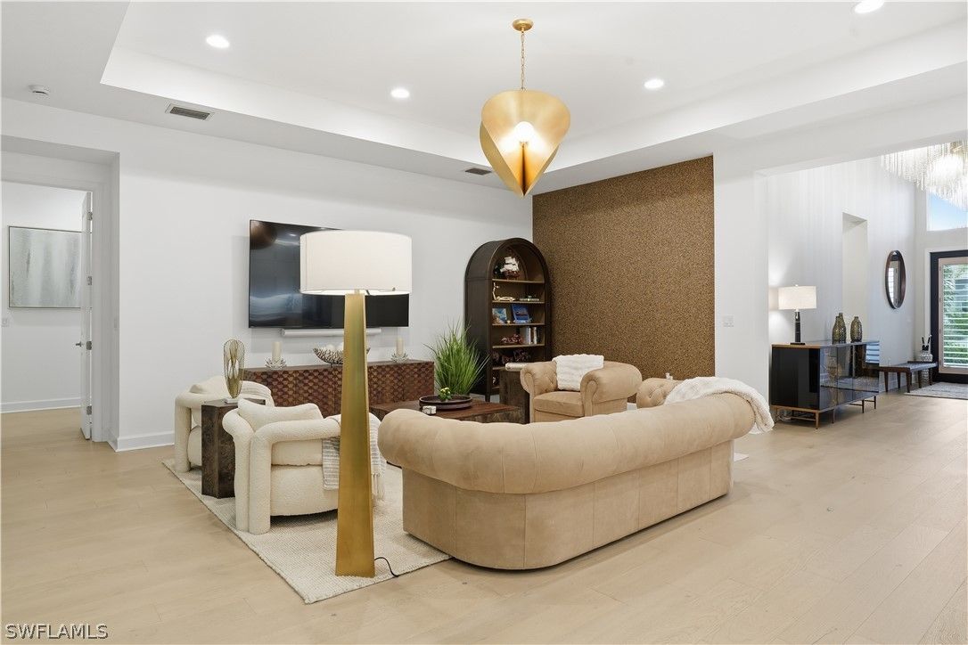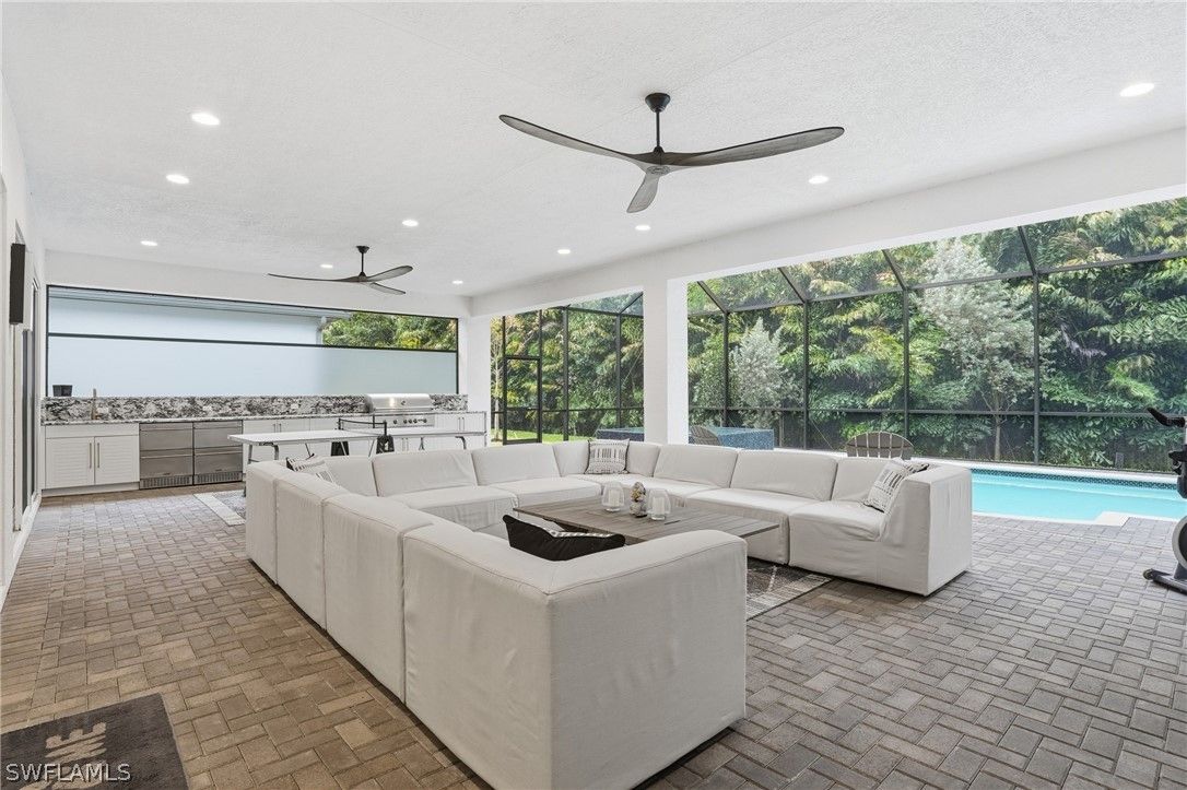 Welcome to this extensively upgraded Captiva model in Valencia Trails offering 4 bedrooms plus a club room, 4 full baths, and approximately 3,176 sqft, with a 3-car garage and an extended screened lanai. Designed for both elevated everyday living and seamless entertaining, a spacious great room with coffered ceiling and thoughtfully designed gourmet kitchen opens to the main living spaces. The kitchen features upgraded cabinetry, quartz countertops and backsplash, under-cabinet lighting, and GE Profile stainless steel appliance package, including wall oven, microwave, and chimney-style hood. The primary suite offers dual walk-in closets and a luxurious bath with dual sinks, separate tub and walk-in shower. Each additional bedroom is generously sized with access to its own full bath and upgraded with frameless shower enclosures, offering comfort and privacy for guests, while the dedicated club room provides flexibility for a media room or home office. This home reflects a significant investment in both visible design and behind-the-scenes upgrades. Engineered light oak hardwood flooring extends throughout the main living areas and bedrooms, enhanced lighting, and elevated finishes throughout the kitchen and baths. The cohesive design palette creates a sophisticated, move-in-ready aesthetic that reflects intentional investment and attention to detail. The HVAC system was upgraded to Carrier Infinity Series that is beyond builder standard specifications for enhanced efficiency and long-term performance. Additional mechanical and structural enhancements include impact glass throughout, tankless hot water heater, whole-house electrical upgrades, recessed LED lighting, and upgraded lighting fixtures. The outdoor living experience is exceptional and represents a significant upgrades. The custom pool and spa includes an enlarged footprint, a raised negative-edge spa, therapy jets, upgraded pump systems, saltwater chlorination, auto-fill, 400,000 BTU gas heater, and multiple colored LED lighting features throughout the pool, spa, and sun shelf. A fully equipped custom outdoor kitchen with built-in gas grill, refrigeration drawers, granite countertops, and ample prep space rounds out the space for true year-round living. Select furnishings will be negotiable pursuant to a detailed inclusion and exclusion list, providing flexibility for buyers seeking a turnkey opportunity. Living in Valencia Trails means embracing one of Naples’ premier 55+ resort communities. Residents enjoy a spectacular clubhouse with restaurant and bar, resort-style pool with cabanas, state-of-the-art fitness center, tennis and pickleball courts, bocce, card rooms, social clubs, walking paths, and a vibrant calendar of events that fosters connection and active living. The gated setting offers privacy and security while remaining conveniently located near Naples’ beaches, dining, shopping, and cultural amenities.