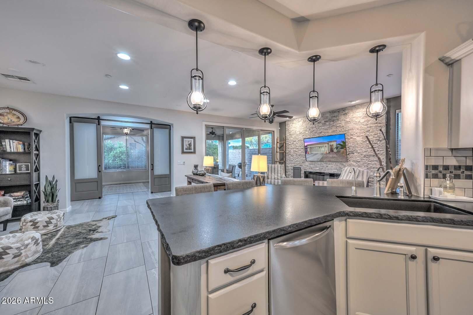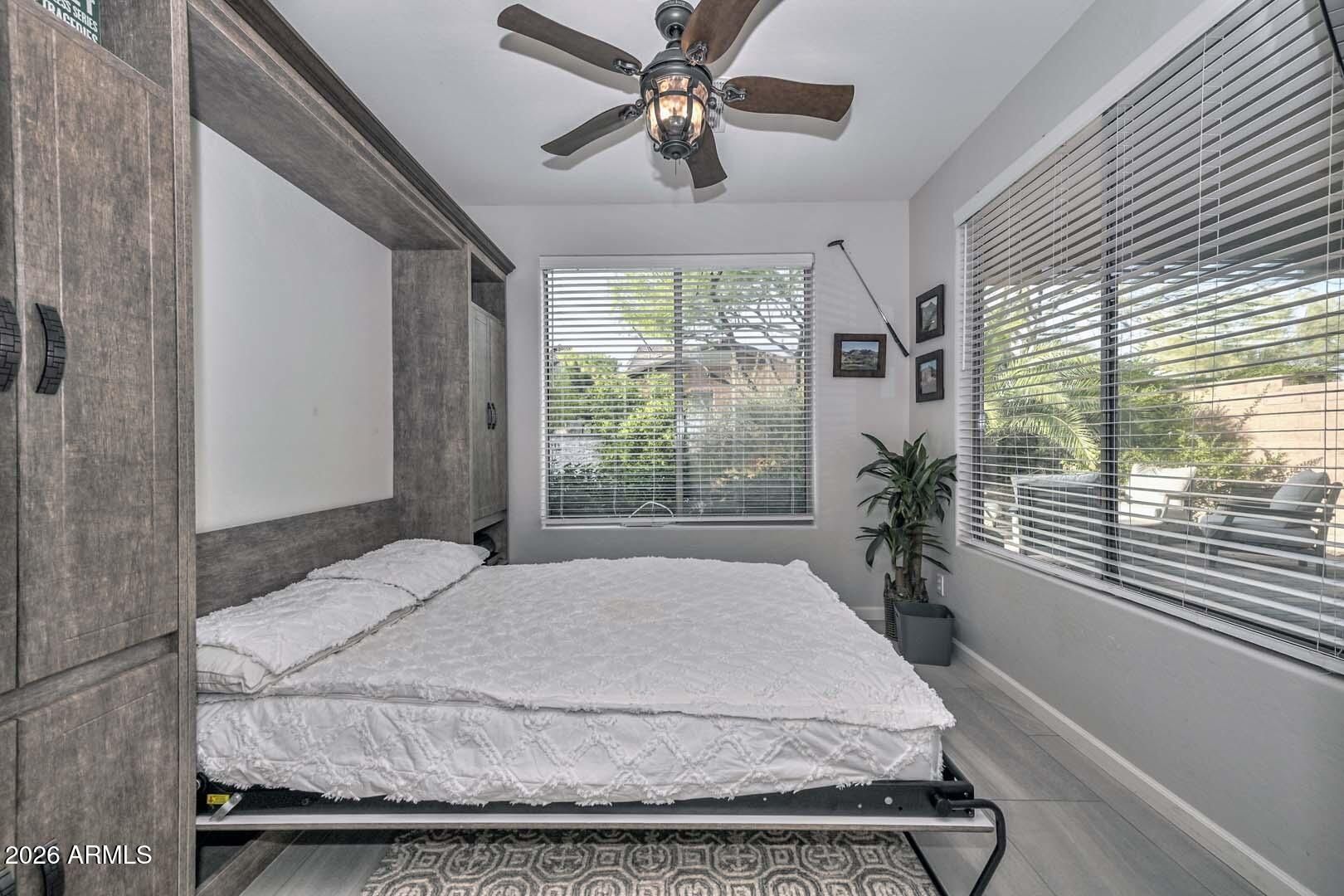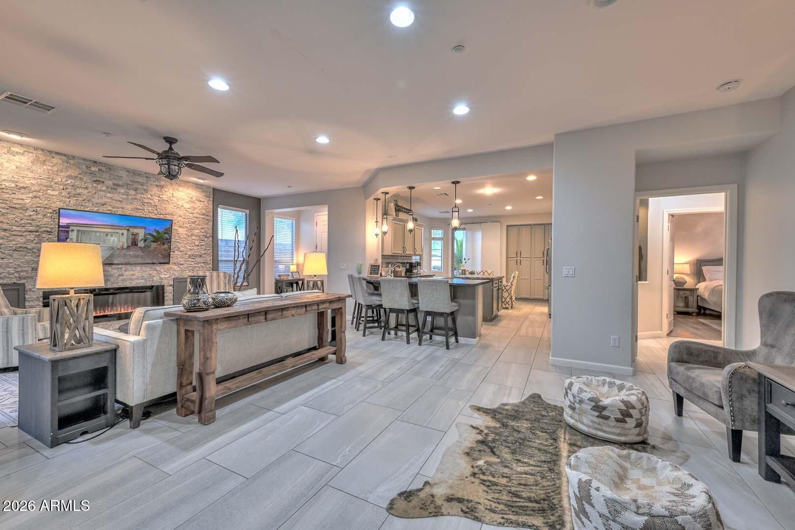 Beautifully appointed 1,682 square foot home offering 2 Bed, 2 Bath, + Den with Murphy Bed, ideally positioned on a private cul-de-sac lot with adjacent 70 foot desert space for added serenity and openness. The private and lush backyard is designed for relaxation and entertaining, featuring an extended paver patio, synthetic grass, gas fire pit, tranquil water feature, stone accent wall, and gas line for BBQ. Inside, the Great Room showcases updated large format tile floors, a striking stone entertainment wall with electric fireplace, and French sliders leading to the covered patio for seamless indoor-outdoor living. The kitchen is both stylish and functional with granite counters, stainless appliances, and a designer tile backsplash. Enjoy morning coffee in the charming front courtyard. Front courytard is located off the kitchen with expanded paver area and lush landscape. The versatile den features barn doors, a built-in Murphy bed, and beautiful views of the private backyard, creating an ideal third sleeping space or office. The Primary Suite offers warm wood flooring and a bay window sitting area. Additional highlights include laundry with upper cabinets and a garage with a popular 4 foot extension--perfect for storage or hobbies.