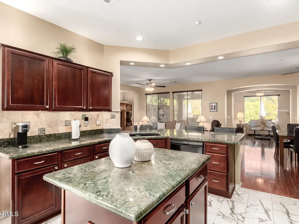 Welcome to Trilogy at Vistancia! This beautiful home greets you with a paved, gated front courtyard. Inside, the light-filled kitchen features an island, breakfast bar, and eat-in area, with a sliding glass door leading to the courtyard. The kitchen flows into a spacious great room with view windows, creating a perfect space for relaxation and entertaining. With 2 bedrooms and an office, this home provides ample space for work and rest. The upgraded kitchen boasts slab granite countertops, tumbled marble and slate backsplash, and stylish cherry cabinets. Cherry floors enhance the living areas and den, while neutral carpet adds comfort to the bedrooms. The backyard is a private retreat with a covered patio and built-in BBQ, ideal for outdoor gatherings.