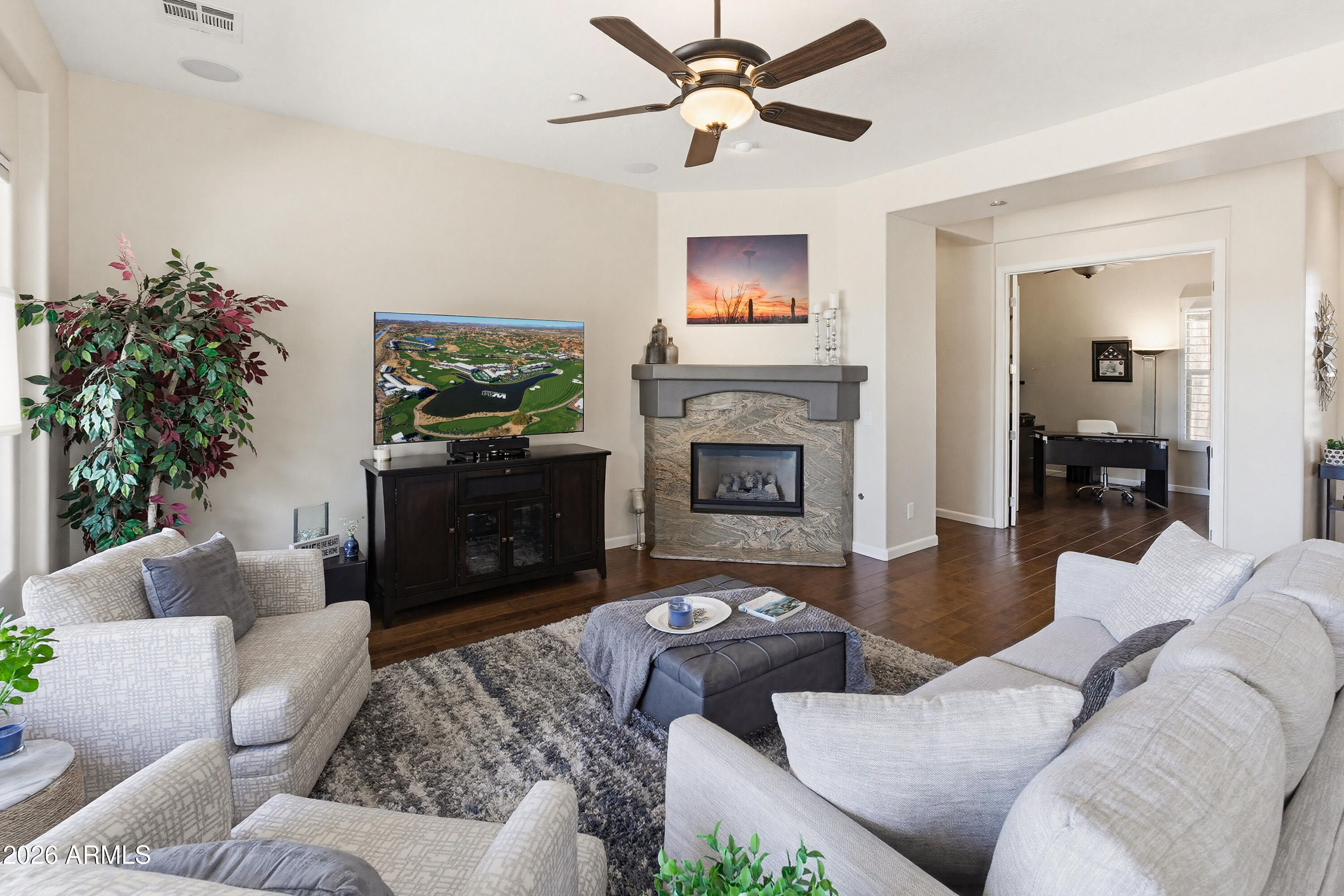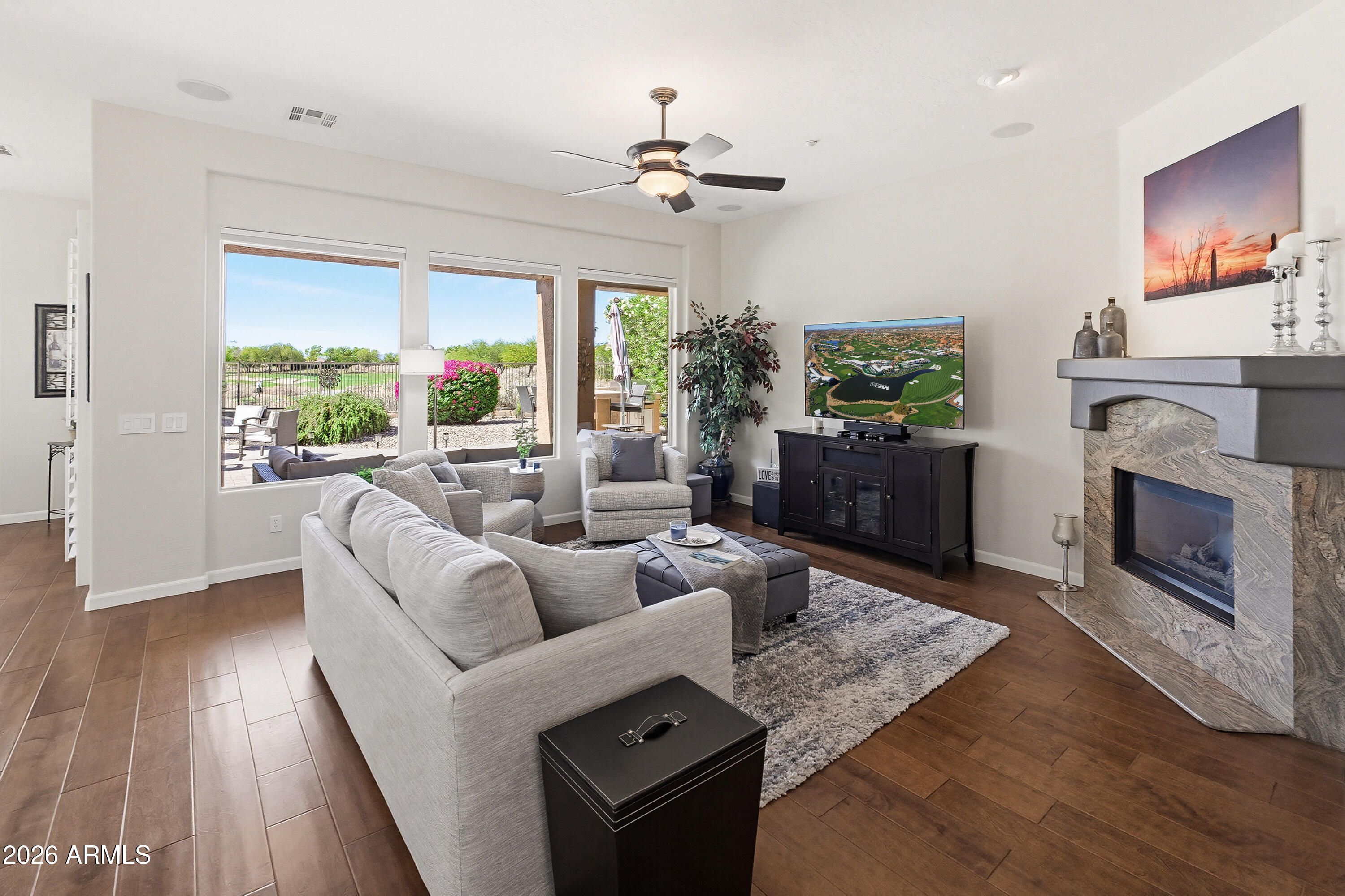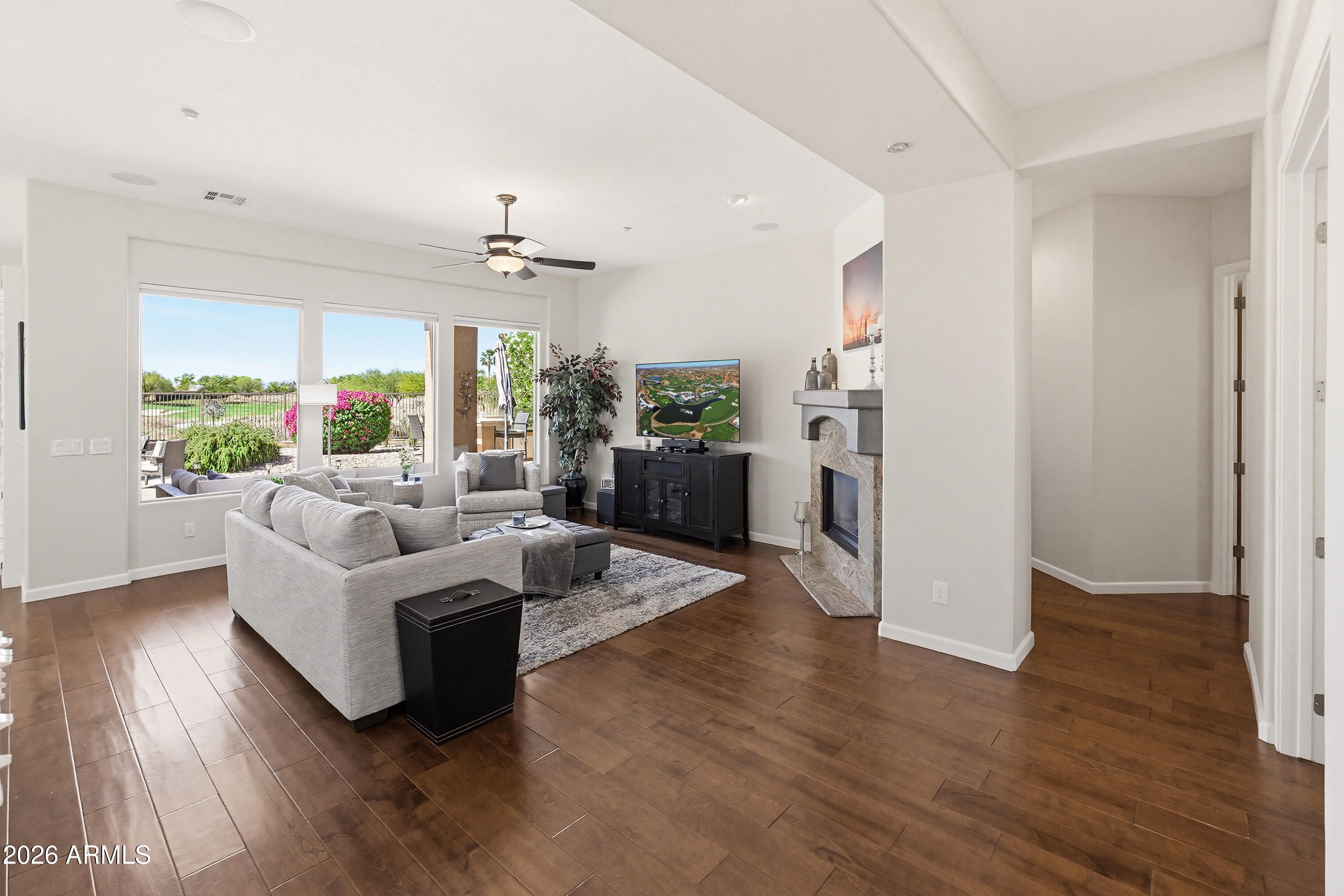 STEP THROUGH THE FRONT DOOR AND IMMEDIATELY ENJOY STUNNING VIEWS OF THE LUSH GREEN 12TH FAIRWAY Located in the prestigious Trilogy at Vistancia, this beautifully maintained home offers resort-style active adult living at its finest. Featuring 2 bedrooms, a den with Murphy bed, and 2 bathrooms, this home showcases rich hardwood flooring throughout the main living areas. The spacious kitchen offers neutral cabinetry, custom granite countertops, an extended island, and updated stainless steel appliances, all opening to the great room. Enjoy plantation shutters, a private primary suite with backyard access,a 3.5-car garage, and an extended paver patio with built-in BBQ/bar and fire pit overlooking the golf course. Oversized driveway, and convenient access to freeways, dining, and shopping, this home offers the perfect blend of comfort and sophistication. Located within walking distance to the Kiva clubhouse and spa, residents enjoy an impressive lineup of resort-style amenities including pickleball, tennis, bocce ball, basketball, golf, a fitness center, multiple resort pools including indoor and outdoor temperature-controlled pools, a culinary kitchen, on-site restaurants, scenic trails, parks, and a gated community setting, along with 50+ clubs and activities to fit every lifestyle. This home won't last!