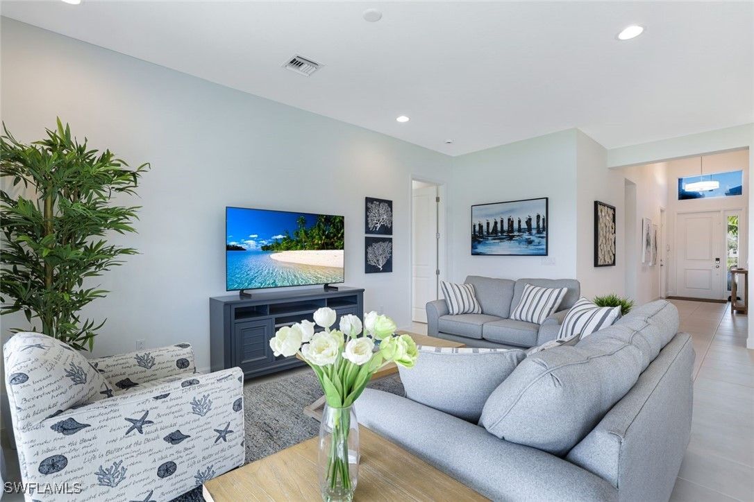 Experience exceptional value in one of Naples’ premier resort communities. This never-lived-in Pelican model offers a beautifully finished, fully furnished home in Valencia Trails — giving you the luxury of move-in readiness without the cost or wait of building. With over $150,000 in upgrades and designer furnishings included, it’s a rare turnkey opportunity. Located on a peaceful east-facing lakefront lot, the home features an open, sun-filled layout with tall ceilings and porcelain tile throughout. The gourmet kitchen shines with gas cooking, quartz countertops, soft-close cabinetry, and a custom pantry. The primary suite provides a relaxing retreat with a spa-like bath and generous closets, while two guest suites and a versatile den offer comfort and flexibility. Impact windows, a tankless water heater, and an extended 2-car garage add practical value and peace of mind. Best of all, Valencia Trails delivers an unbeatable lifestyle: a 43,000 sq. ft. clubhouse with full-service spa, fitness center, theater, art studios, and on-site dining — plus a resort pool, tennis and pickleball courts, nature trails, and two dog parks.