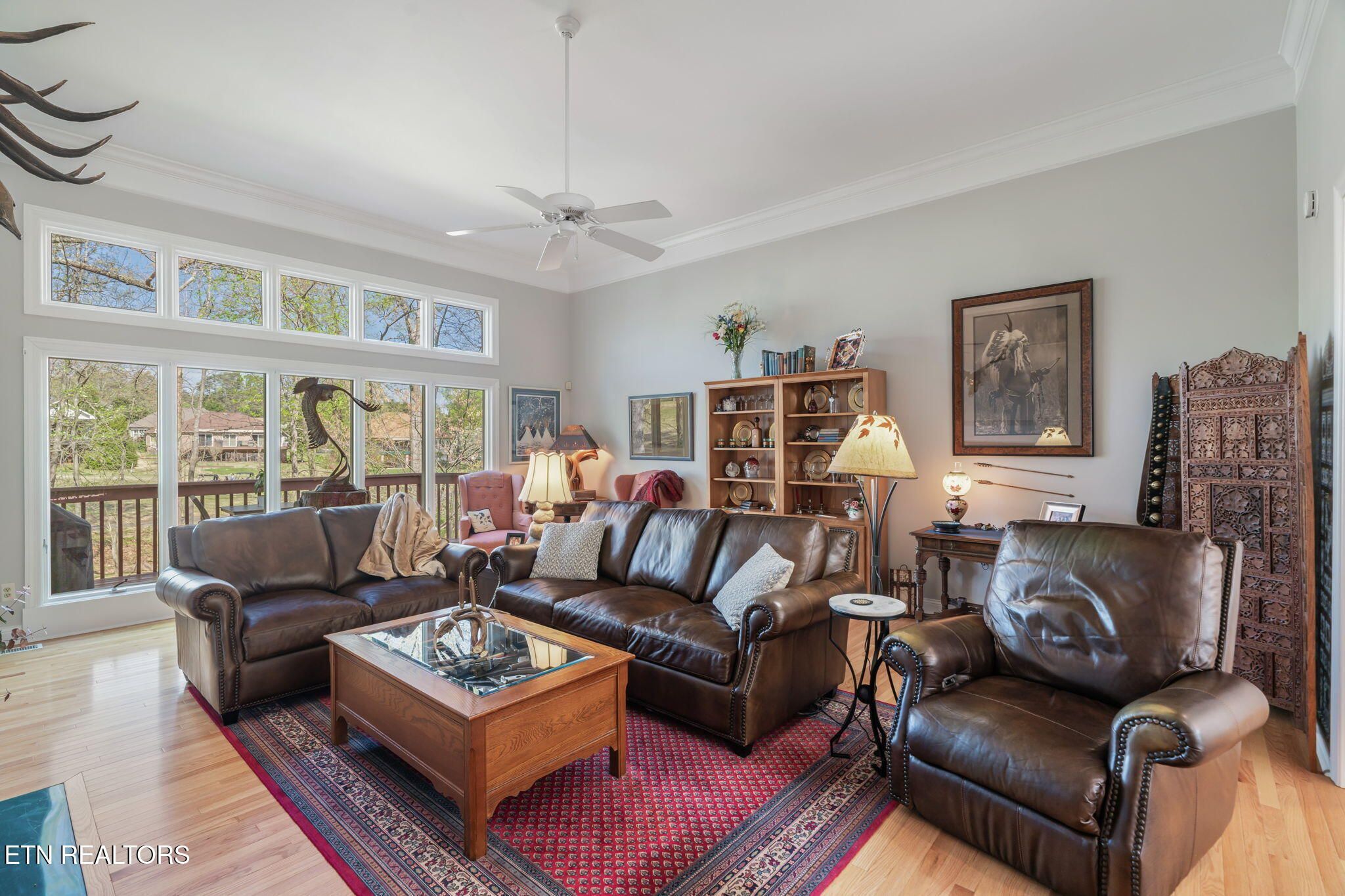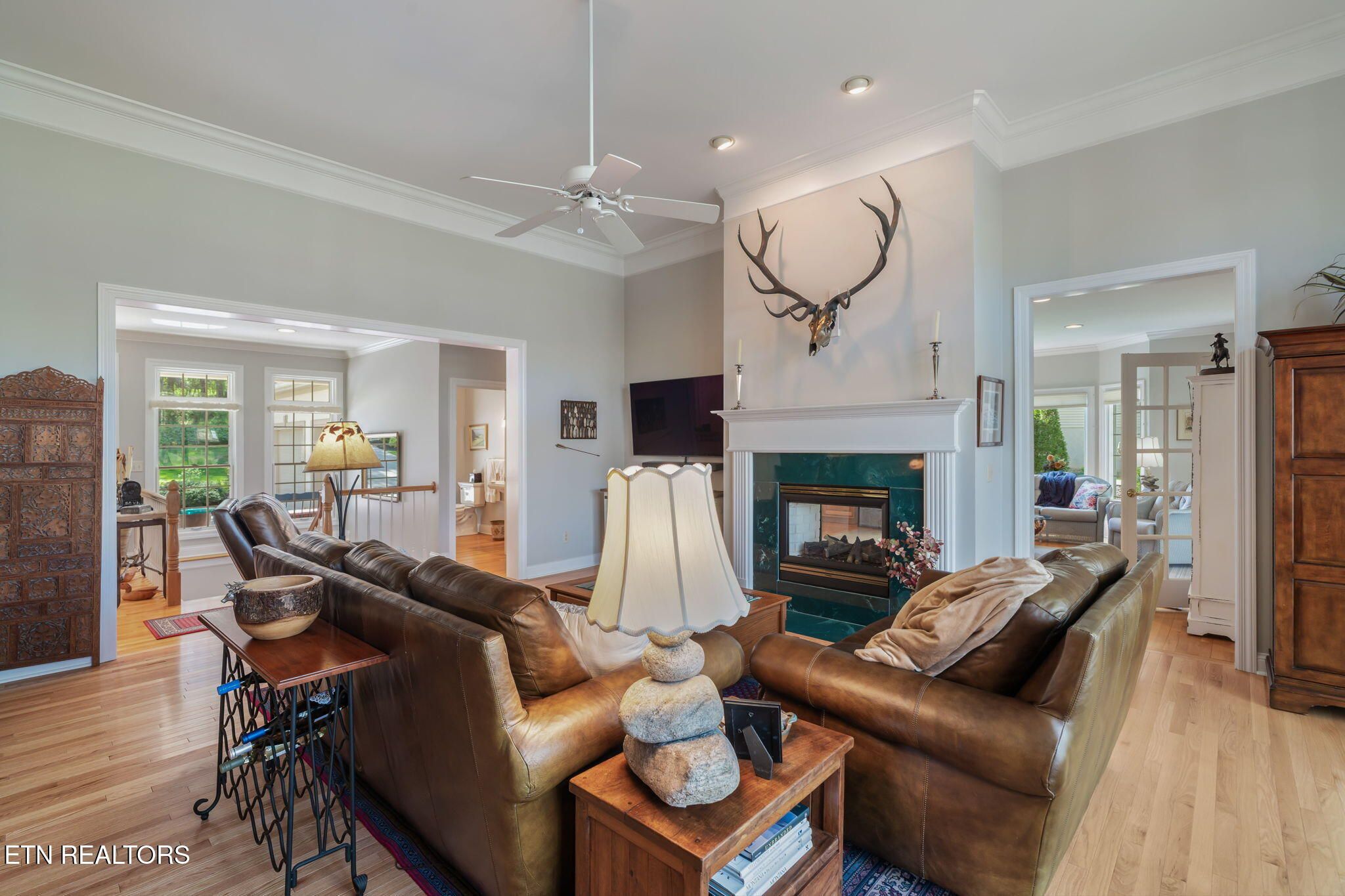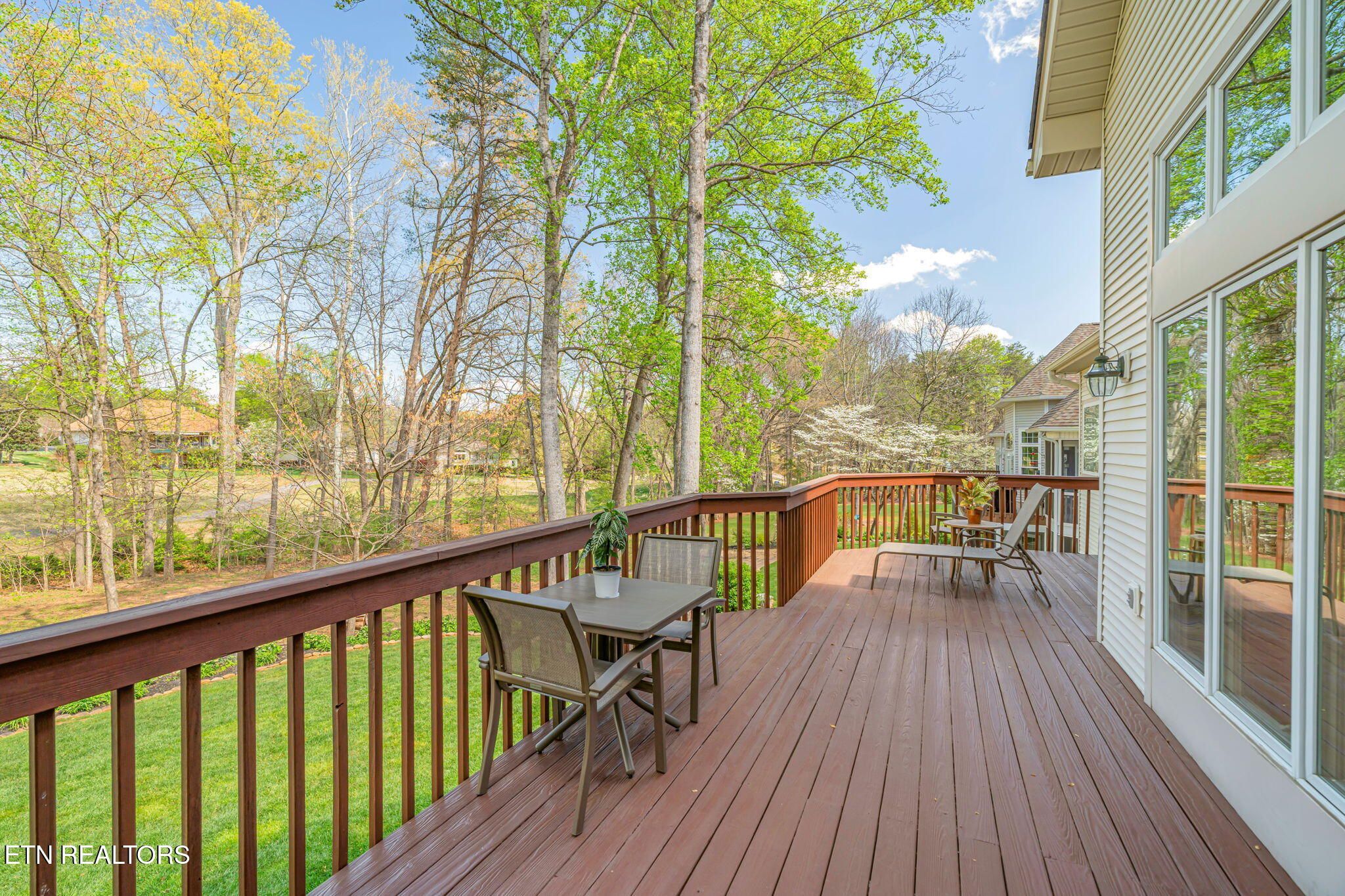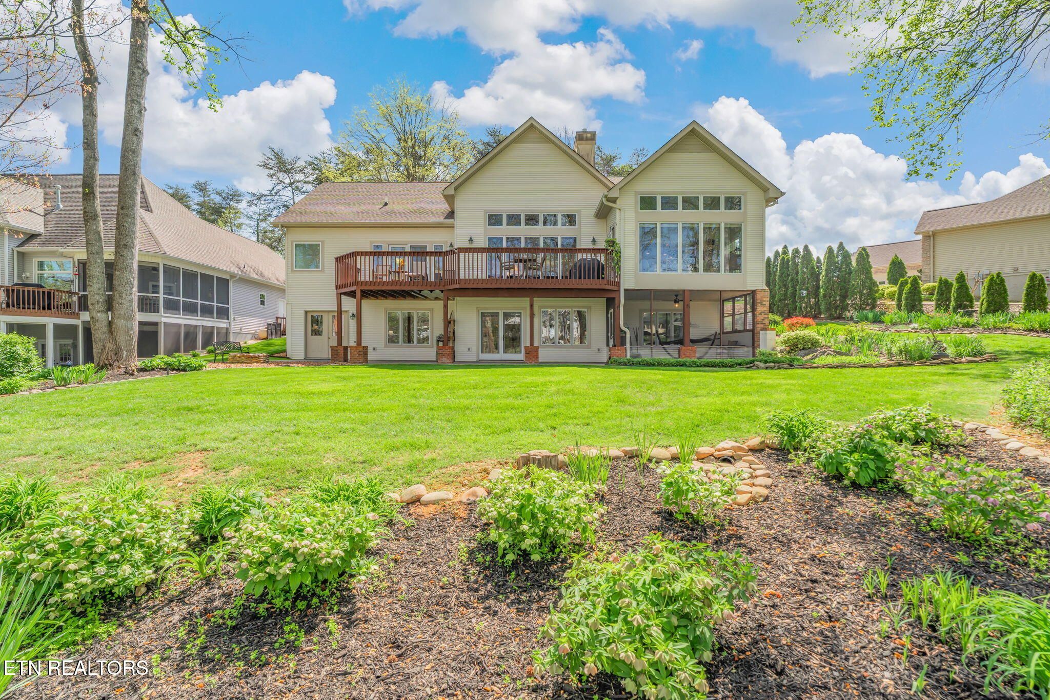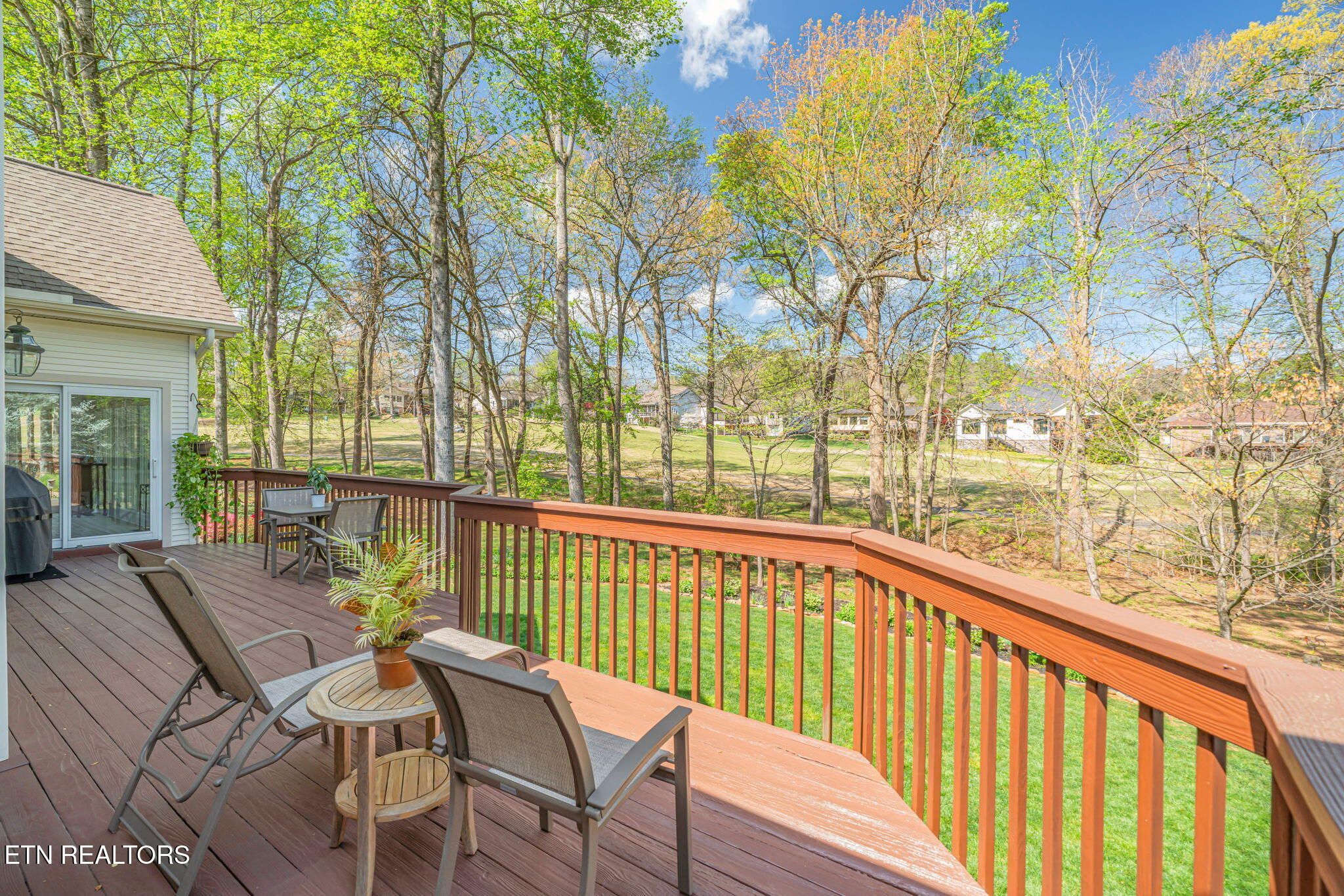 Tucked gracefully along the 11th fairway, this custom golf-front 4-bedroom, 3.5-bath residence offers a rare blend of serenity, privacy, and refined luxury. Framed by a natural wooded buffer, the home enjoys tranquil golf course views while maintaining a peaceful, park-like setting enhanced by beautiful professional landscaping--an idyllic retreat designed for rest and relaxation. Inside, soaring eleven-foot ceilings, elegant crown molding, and rich hardwood floors create an atmosphere of understated sophistication. Expansive windows with transoms invite in soft natural light, while new blinds throughout add both style and comfort. A striking double-sided gas fireplace anchors both the living room and an expansive keeping room, perfect for unwinding after a day on the course. The gourmet kitchen is thoughtfully appointed for both everyday living and entertaining, featuring double ovens, a sleek glass cooktop, a Sub-Zero refrigerator, and a generous island that invites conversation. Seamlessly connected to the keeping room, the space easily accommodates a grand dining table for memorable evenings with friends and fellow golf enthusiasts. A four-season sunroom provides a peaceful retreat with captivating views of the manicured fairway and surrounding gardens, opening onto a spacious deck ideal for morning coffee or sunset relaxation. The main-level primary suite is a private sanctuary, complete with direct deck access, serene golf views, a spacious walk-in closet, and a beautifully updated luxury shower. An additional en-suite bedroom, along with a stylish guest powder room, ensures comfort and convenience for visitors. The lower level extends the home's welcoming ambiance, offering a generous family room with porch access, two well-appointed guest bedrooms, a full bath, and dedicated spaces for hobbies, including a workshop and golf cart storage. Thoughtful storage solutions are found throughout, including a custom-built closet system and a large mechanical room with built-in shelving. Practical luxury continues with an oversized two-car garage, a rain gutter leaf filtration system, and a roof recently treated with Roof Maxx to extend its life by an additional five years. The home has been meticulously maintained, including ongoing annual pest service contracts for added peace of mind. Modern comforts and upgrades abound, including Pella windows and doors, a security system, radon mitigation, dual water heaters, a seven-zone irrigation system, and a dual-fuel, three-zone HVAC system with electronic filtration. An Aqua Clear water filtration system further enhances everyday living, while an outdoor fire pit invites relaxed evenings under the stars. This exceptional property is more than a home--it is a private retreat along the fairway, crafted for those who appreciate the rhythm of the game and the quiet luxury of refined living. Buyer to verify all information.