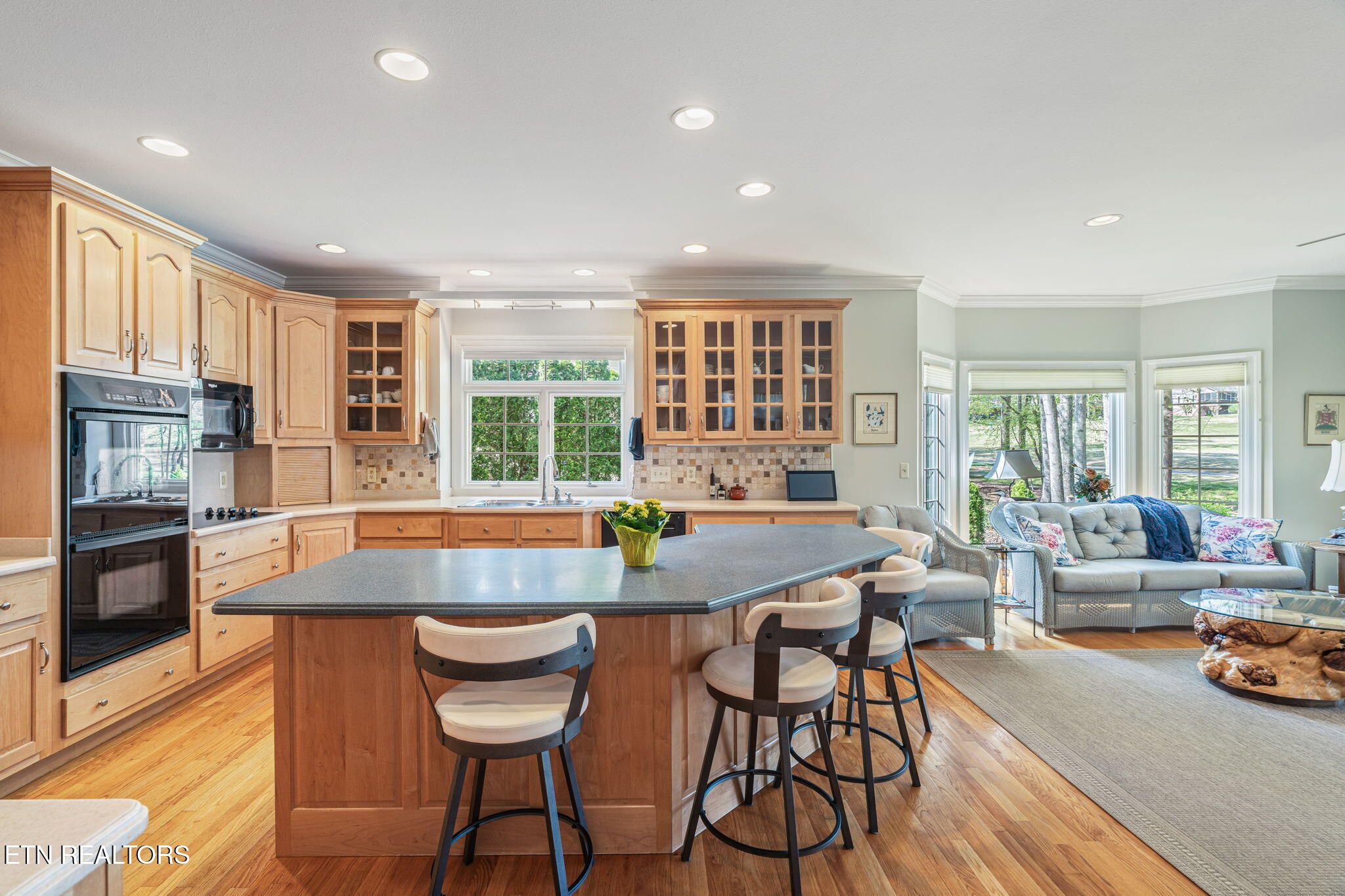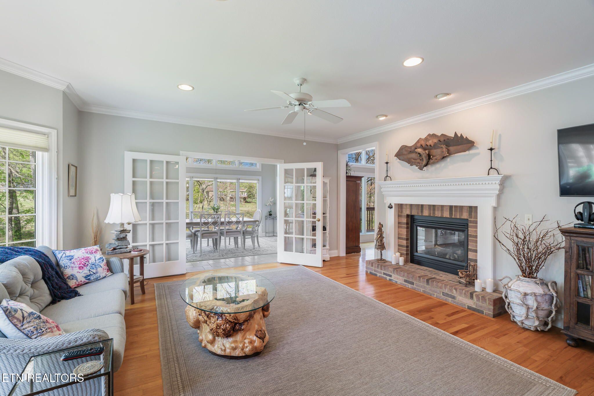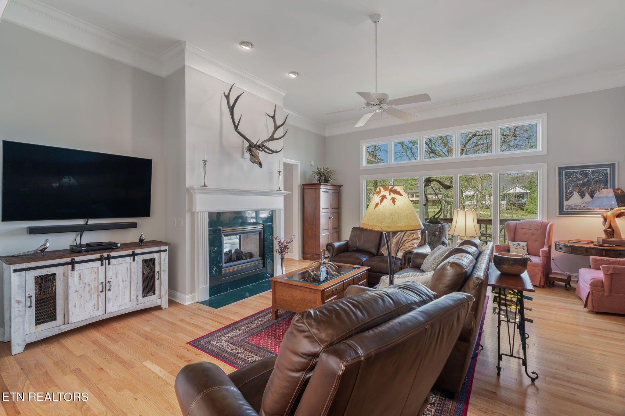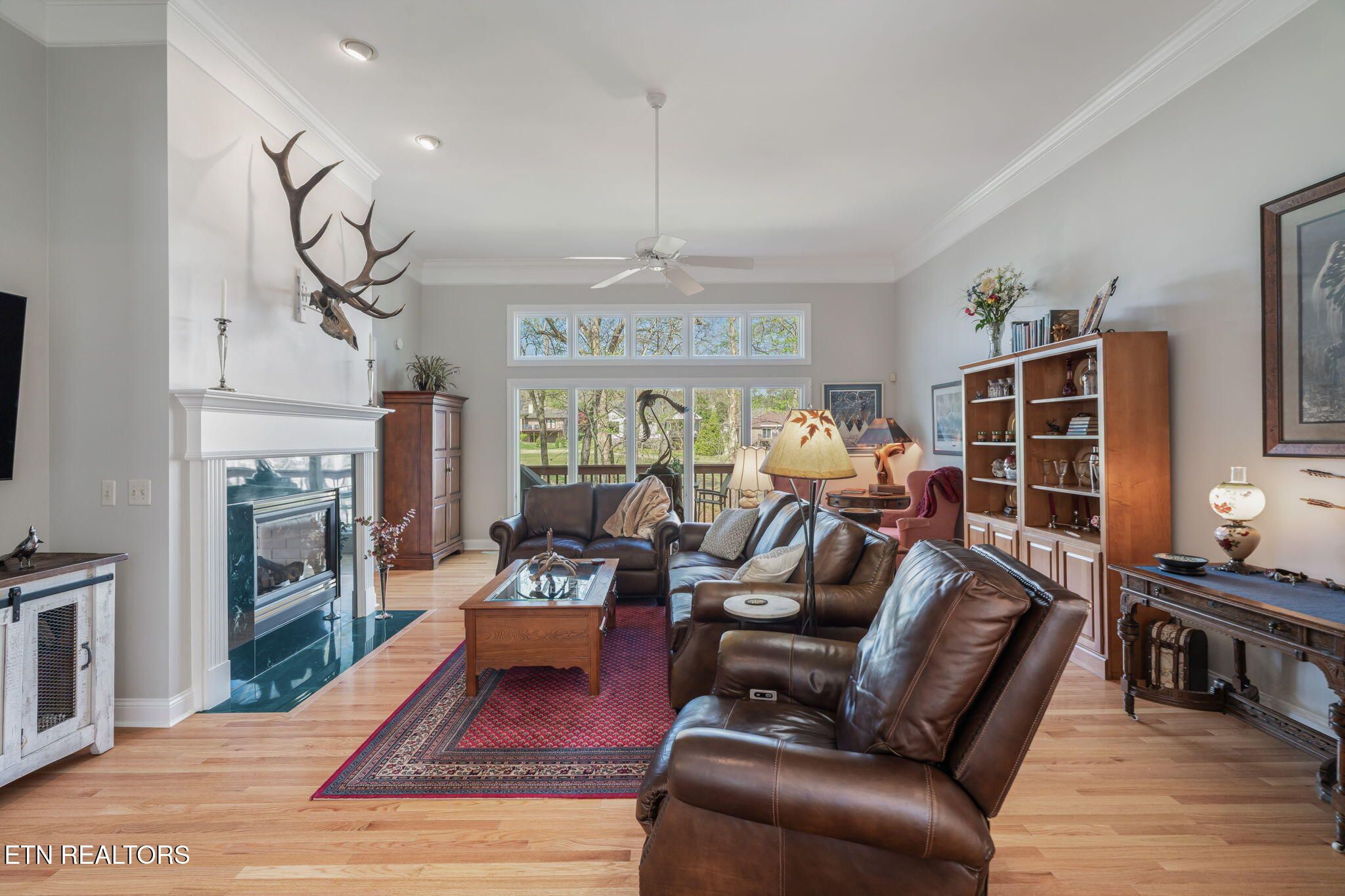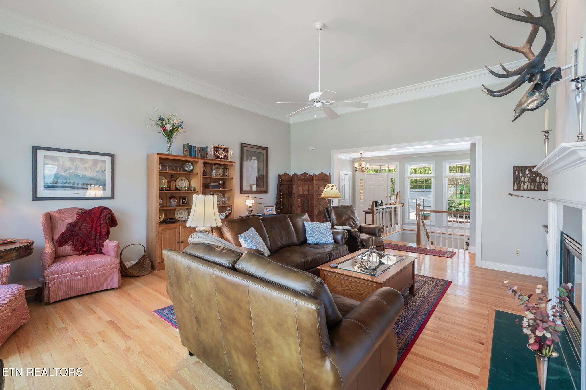 Tucked gracefully along the 11th fairway, this custom golf-front 4-bedroom, 3.5-bath residence offers a rare blend of serenity, privacy, and refined luxury. Framed by a natural wooded buffer, the home enjoys tranquil golf course views while maintaining a peaceful, park-like setting enhanced by beautiful professional landscaping--an idyllic retreat designed for rest and relaxation. Inside, soaring eleven-foot ceilings, elegant crown molding, and rich hardwood floors create an atmosphere of understated sophistication. Expansive windows with transoms invite in soft natural light, while new blinds throughout add both style and comfort. A striking double-sided gas fireplace anchors both the living room and an expansive keeping room, perfect for unwinding after a day on the course. The gourmet kitchen is thoughtfully appointed for both everyday living and entertaining, featuring double ovens, a sleek glass cooktop, a Sub-Zero refrigerator, and a generous island that invites conversation. Seamlessly connected to the keeping room, the space easily accommodates a grand dining table for memorable evenings with friends and fellow golf enthusiasts. A four-season sunroom provides a peaceful retreat with captivating views of the manicured fairway and surrounding gardens, opening onto a spacious deck ideal for morning coffee or sunset relaxation. The main-level primary suite is a private sanctuary, complete with direct deck access, serene golf views, a spacious walk-in closet, and a beautifully updated luxury shower. An additional en-suite bedroom, along with a stylish guest powder room, ensures comfort and convenience for visitors. The lower level extends the home's welcoming ambiance, offering a generous family room with porch access, two well-appointed guest bedrooms, a full bath, and dedicated spaces for hobbies, including a workshop and golf cart storage. Thoughtful storage solutions are found throughout, including a custom-built closet system and a large mechanical room with built-in shelving. Practical luxury continues with an oversized two-car garage, a rain gutter leaf filtration system, and a roof recently treated with Roof Maxx to extend its life by an additional five years. The home has been meticulously maintained, including ongoing annual pest service contracts for added peace of mind. Modern comforts and upgrades abound, including Pella windows and doors, a security system, radon mitigation, dual water heaters, a seven-zone irrigation system, and a dual-fuel, three-zone HVAC system with electronic filtration. An Aqua Clear water filtration system further enhances everyday living, while an outdoor fire pit invites relaxed evenings under the stars. This exceptional property is more than a home--it is a private retreat along the fairway, crafted for those who appreciate the rhythm of the game and the quiet luxury of refined living. Buyer to verify all information.