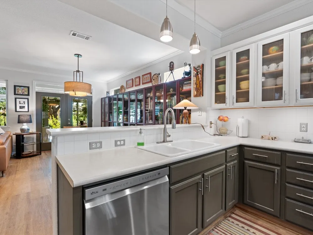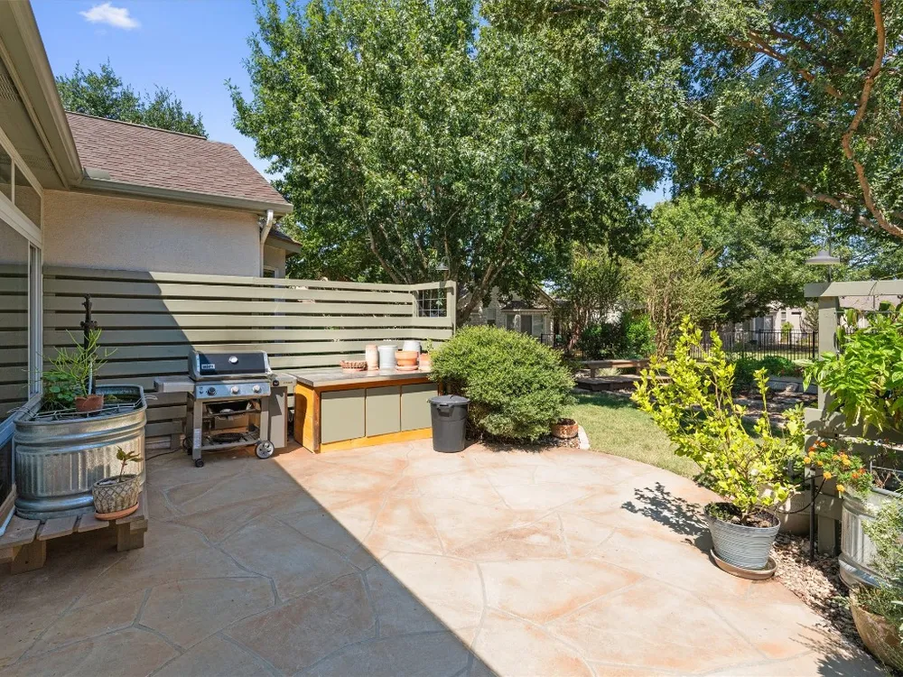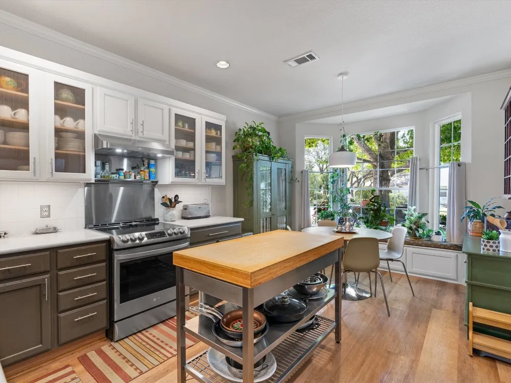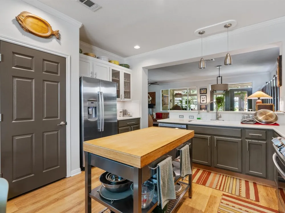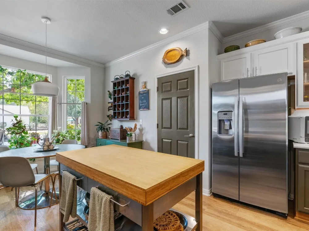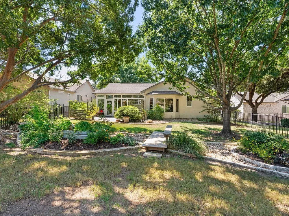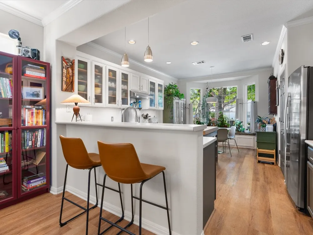 Glass-front cabinets circle the large Open Kitchen of this remarkable Sun City Texas Dickinson plan located in Neighborhood 11, the Sweet Spot of this active-adult resort. After greetings from a rarely-seen Front Sitting Deck, a glassed 5-light door invites you inside. There, easy-care luxury vinyl planks add the look of wood throughout the living areas, beginning at the Foyer, where a wide opening reveals the Study/Computer Room, a perfect Office-at-Home. Ahead, a sizable Great Room includes a Dining Area, where full-view glass doors open to the tiled Sun Room. High transom windows in the Dining add natural lighting, while granting wall space for furniture placement. A breakfast bar gently separates the Dining portion of the Great Room from the Open Kitchen, the hallmark of this beloved floor plan. There, updates include stainless-steel appliances including a commercial-style range with show-stopper vented hood and a classic tiled back splash. A bay-windowed Breakfast Room resides at the front of the Kitchen offering natural lighting, while viewing the landscaped front yard and street scape. Undermount task lighting and a generous Pantry Closet complete this showy Heart-of-the-Home. Meanwhile, the Sun Room is ideal for art, sewing, or simply reading the latest page-turner. A notably deep back yard adds privacy not usually seen in this neighborhood, while clever landscaping and fencing grants bonus privacy around the Patio. Back inside, this floorplan has been cleverly transformed into a Dual Primary Suite set up, ideal for home sharing. The original Primary Suite touts a bay-windowed vista of the landscaped back yard, while a Primary Bath features a wide vanity and a Walk-In Closet. The other Suite was once the Guest Bedroom. It has been enlarged to also host a second Primary Bath. The well-placed Laundry is the access point to the Two-Car Garage. With its endless upgrades and upscale lighting, this is the home to see!