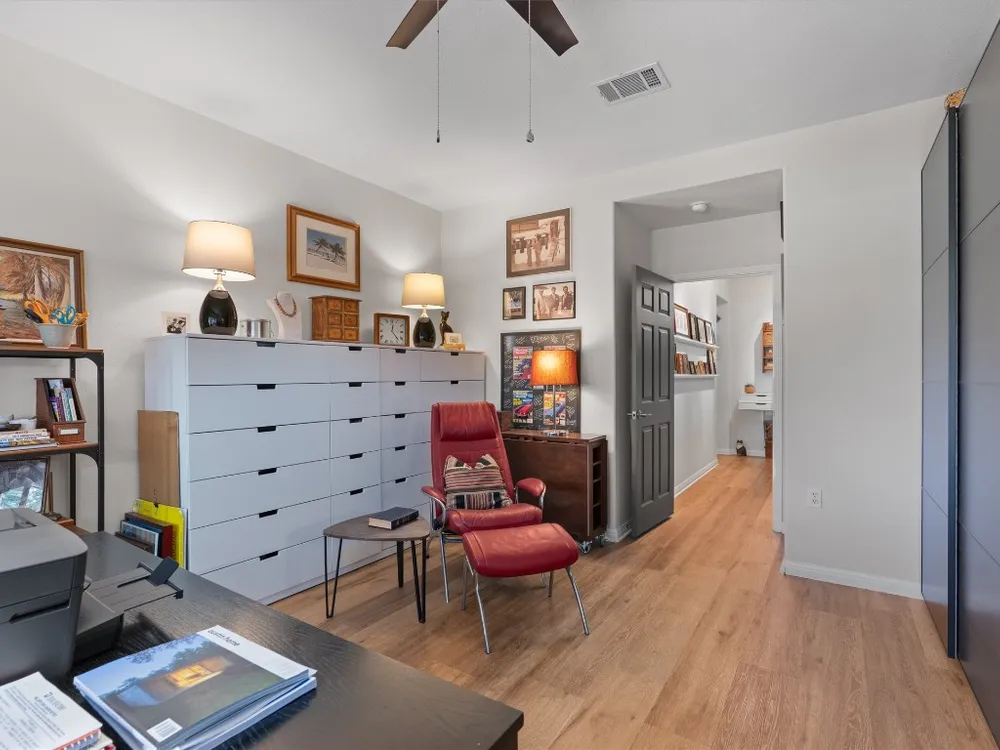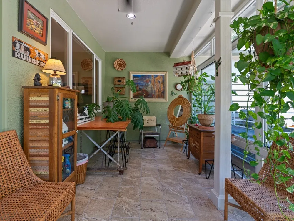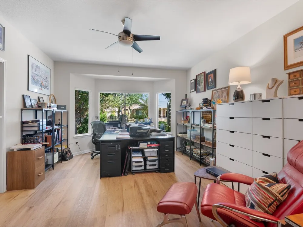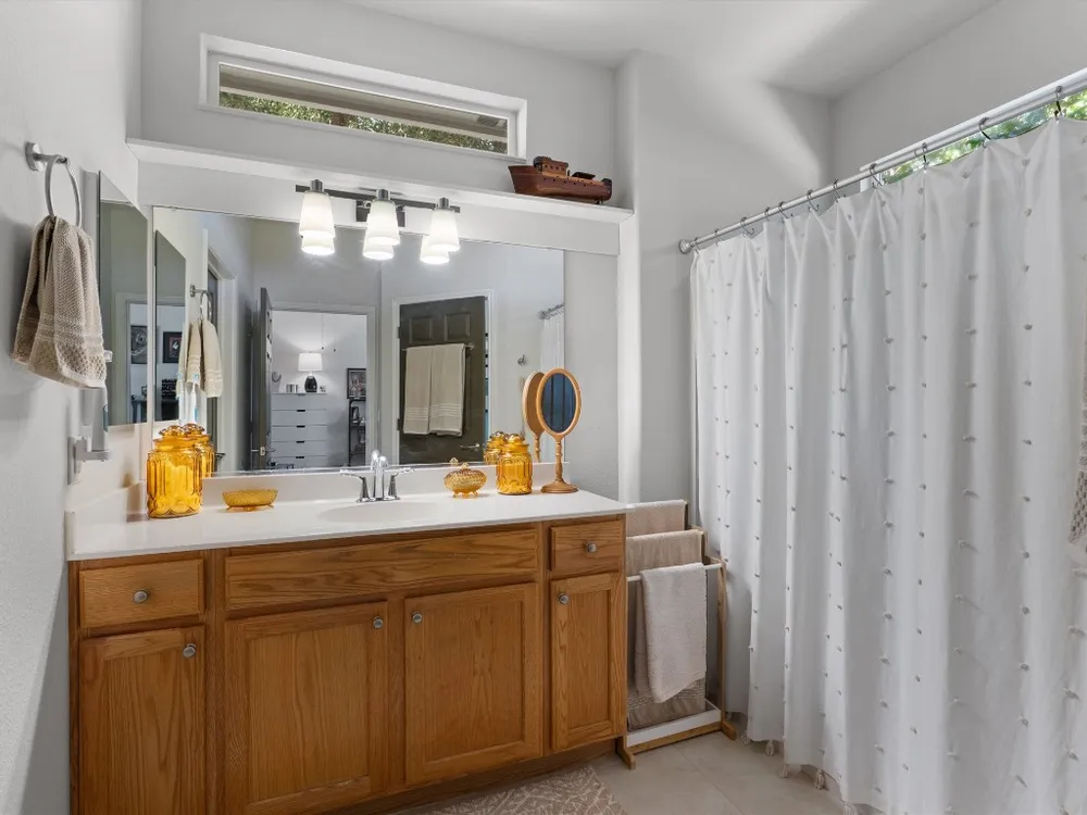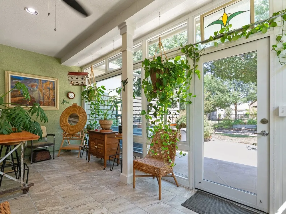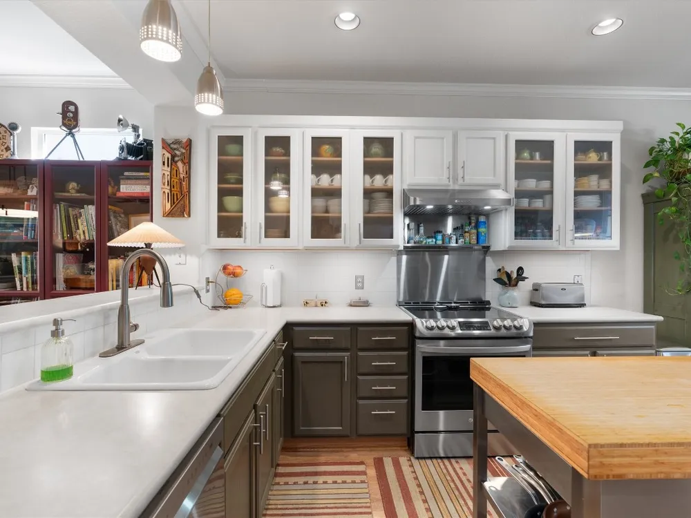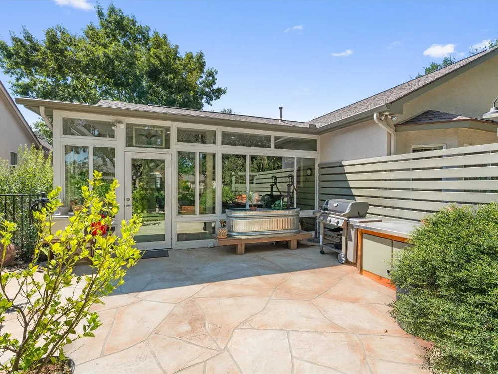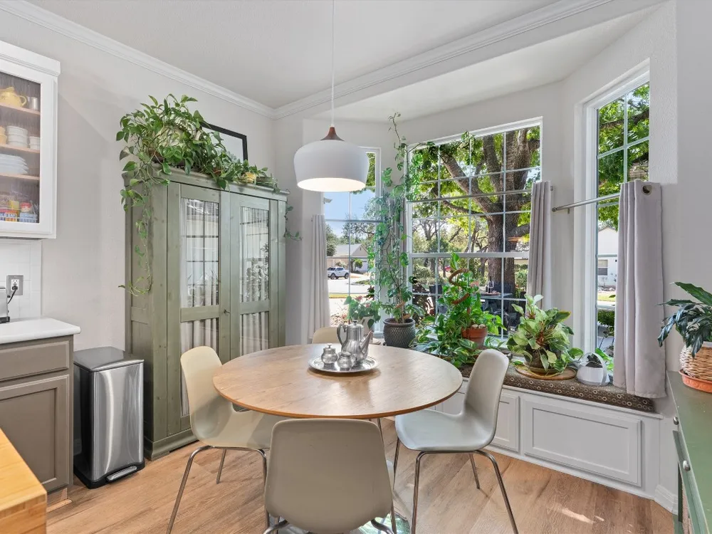 Glass-front cabinets circle the large Open Kitchen of this remarkable Sun City Texas Dickinson plan located in Neighborhood 11, the Sweet Spot of this active-adult resort. After greetings from a rarely-seen Front Sitting Deck, a glassed 5-light door invites you inside. There, easy-care luxury vinyl planks add the look of wood throughout the living areas, beginning at the Foyer, where a wide opening reveals the Study/Computer Room, a perfect Office-at-Home. Ahead, a sizable Great Room includes a Dining Area, where full-view glass doors open to the tiled Sun Room. High transom windows in the Dining add natural lighting, while granting wall space for furniture placement. A breakfast bar gently separates the Dining portion of the Great Room from the Open Kitchen, the hallmark of this beloved floor plan. There, updates include stainless-steel appliances including a commercial-style range with show-stopper vented hood and a classic tiled back splash. A bay-windowed Breakfast Room resides at the front of the Kitchen offering natural lighting, while viewing the landscaped front yard and street scape. Undermount task lighting and a generous Pantry Closet complete this showy Heart-of-the-Home. Meanwhile, the Sun Room is ideal for art, sewing, or simply reading the latest page-turner. A notably deep back yard adds privacy not usually seen in this neighborhood, while clever landscaping and fencing grants bonus privacy around the Patio. Back inside, this floorplan has been cleverly transformed into a Dual Primary Suite set up, ideal for home sharing. The original Primary Suite touts a bay-windowed vista of the landscaped back yard, while a Primary Bath features a wide vanity and a Walk-In Closet. The other Suite was once the Guest Bedroom. It has been enlarged to also host a second Primary Bath. The well-placed Laundry is the access point to the Two-Car Garage. With its endless upgrades and upscale lighting, this is the home to see!