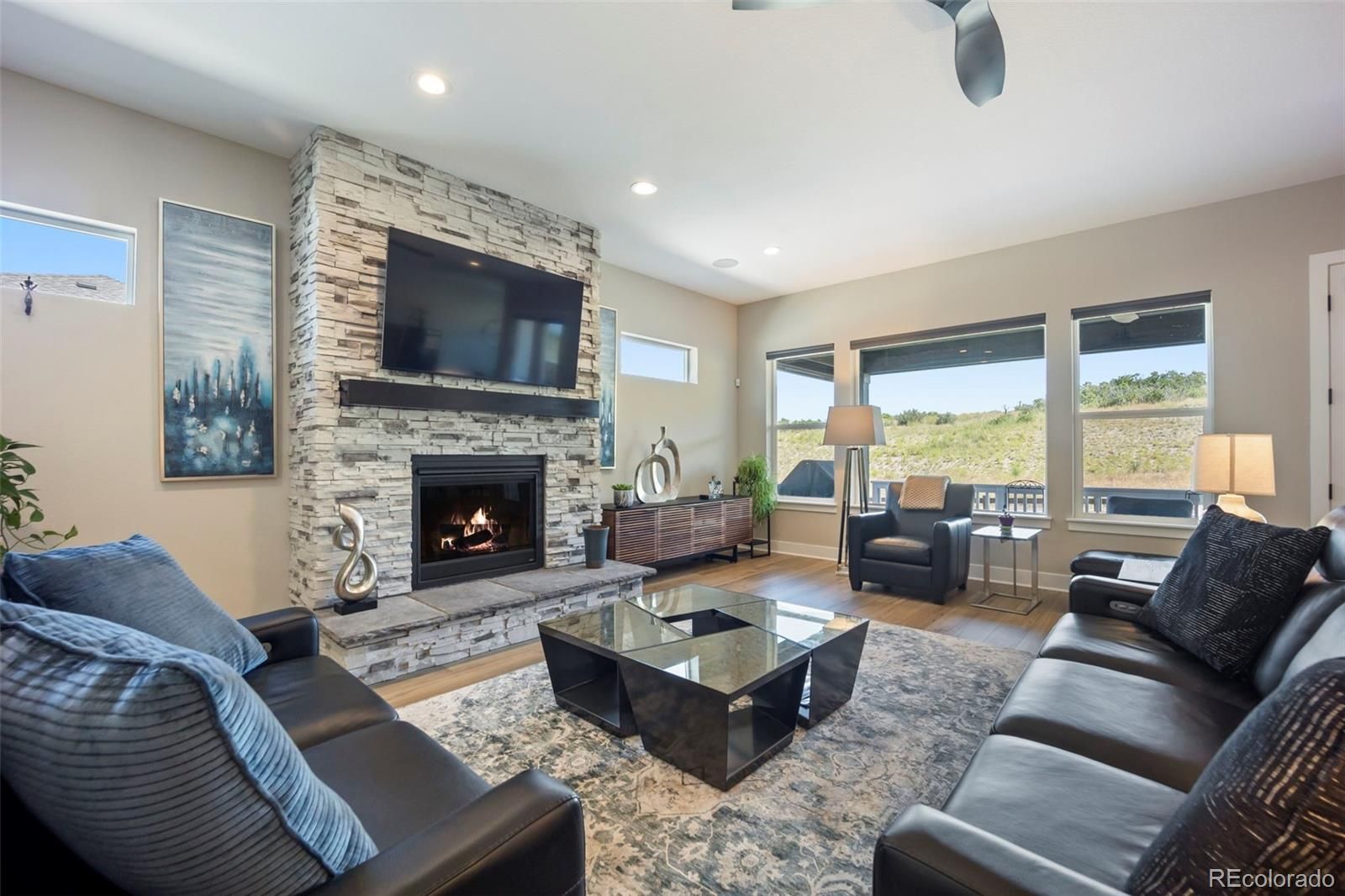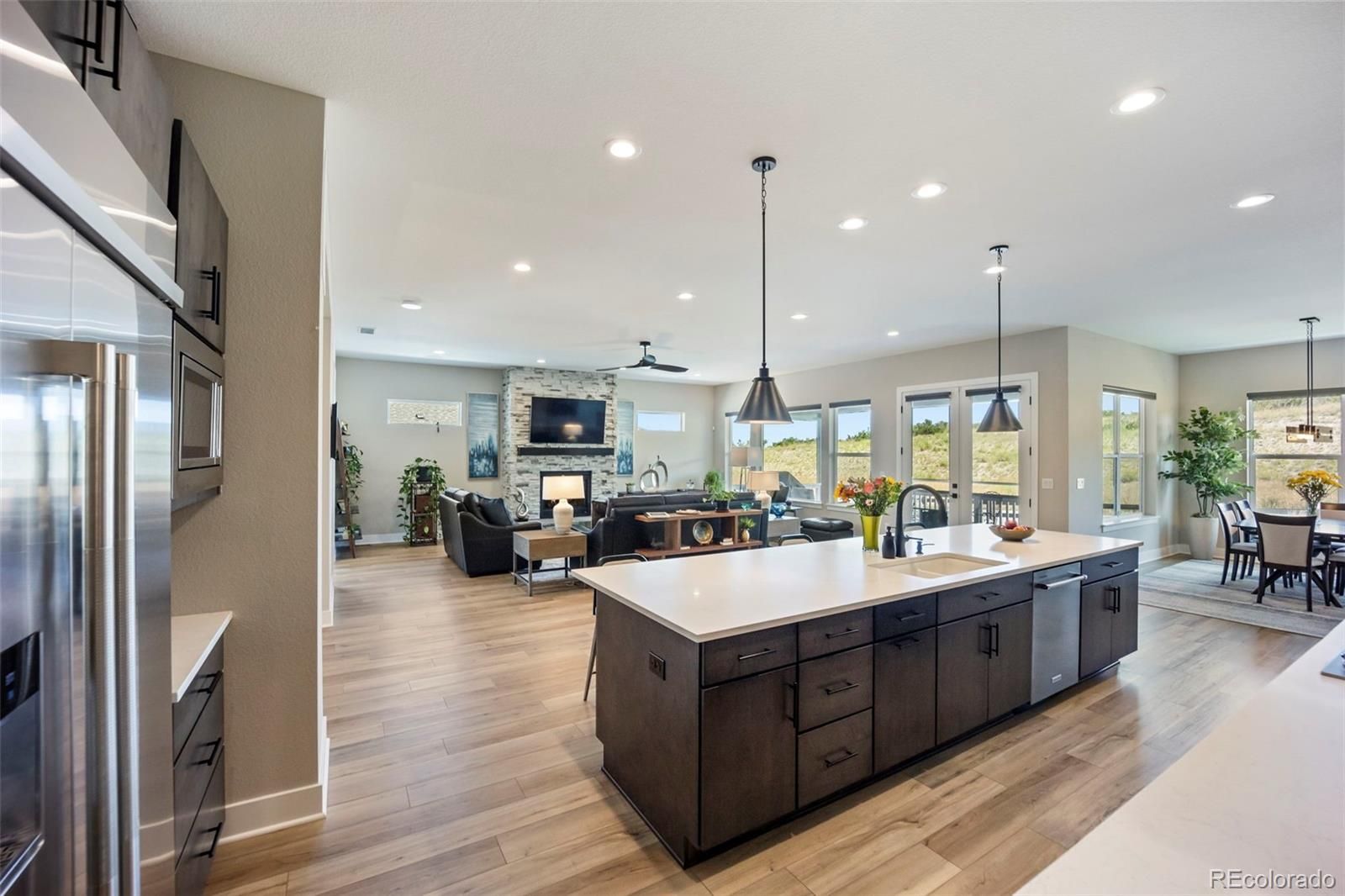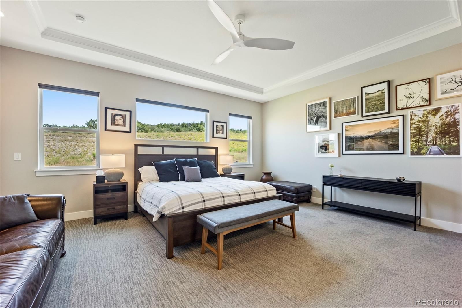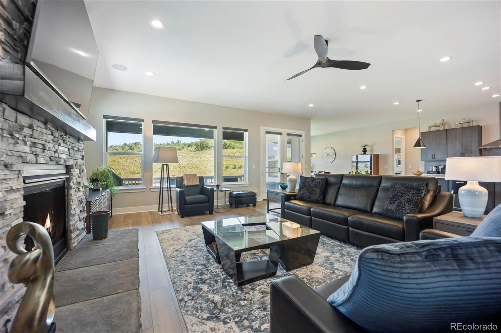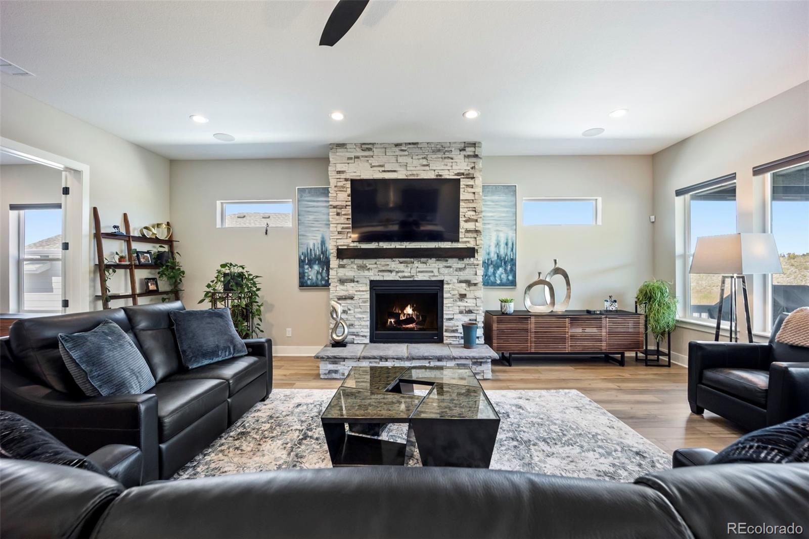 Rare lot w/ open space (rear and side). This extraordinary ranch plan in the coveted "Regency" at Montaine 55+ community offers over 4,700 sq ft (2,720 finished), with thoughtful expansions and luxury upgrades throughout (see attached list). This nearly new home has unmatched privacy, and elegant design. The open-concept great room has been expanded by over 200 sq ft, creating a gathering space anchored by a floor-to-ceiling stacked stone fireplace. The gourmet kitchen showcases quartz counters, extended island, all upgraded "Yorktowne" cabinetry, KitchenAid double ovens, five-burner cooktop, and built-in Jenn-Air fridge. The great room/dining area opens to a covered patio through French doors, where a motorized sun/wind screen and stained concrete patio provide year-round enjoyment. The primary suite was enlarged, featuring a spa-inspired bathroom w/ upgraded shower enclosure, separate toilet room w/ bidet seat, his/her walk-in closets with custom shelving and drawers. Additional BR has walk-in closet and bath attached. French doors enclose the dedicated office, w/ wired high-speed data. 8-foot solid core doors, additional lighting and electrical upgrades throughout, custom cabinets and shelving in closets, pantry, laundry and garage, plus remote- control window shades on all windows. The insulated and painted garage includes polyaspartic floor coating, while the basement—also finished with polyaspartic flooring—offers a rough-in for an additional bath and ample room for two more BR's, a rec area, or fitness space. Outdoors, the home is fully landscaped w/ pet-rated artificial turf, fenced backyard, and stained concrete entry. Peace of mind comes with storm doors and alarm system. Residents of Regency enjoy resort amenities, including a clubhouse, pool, fitness center, tennis/pickleball courts, and miles of scenic trails. Just minutes from downtown Castle Rock’s shops, dining, and golf, this home perfectly balances luxury, lifestyle, and location.