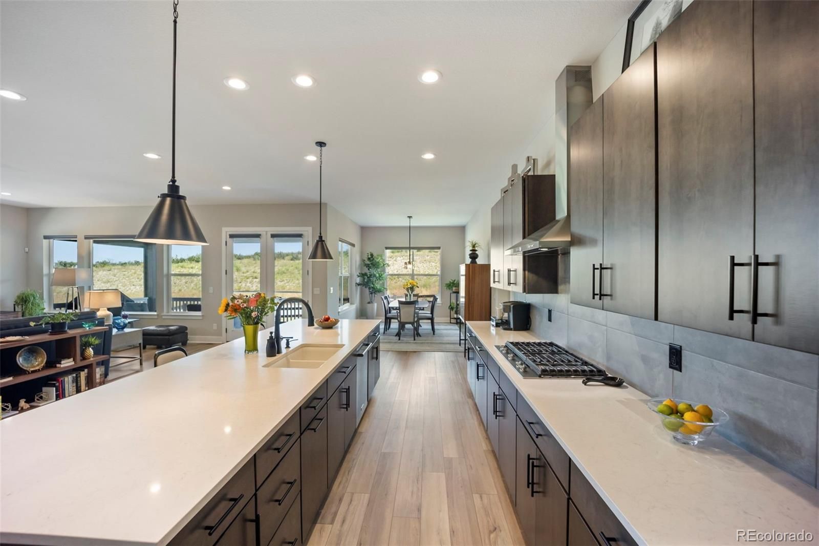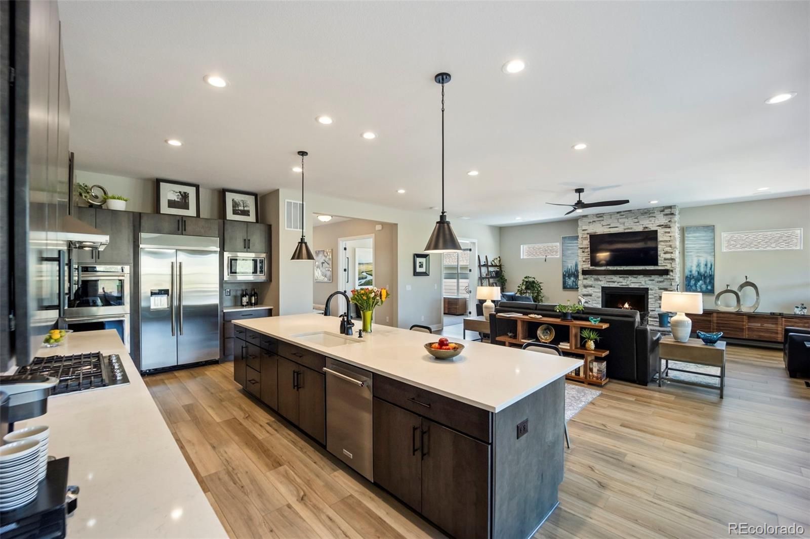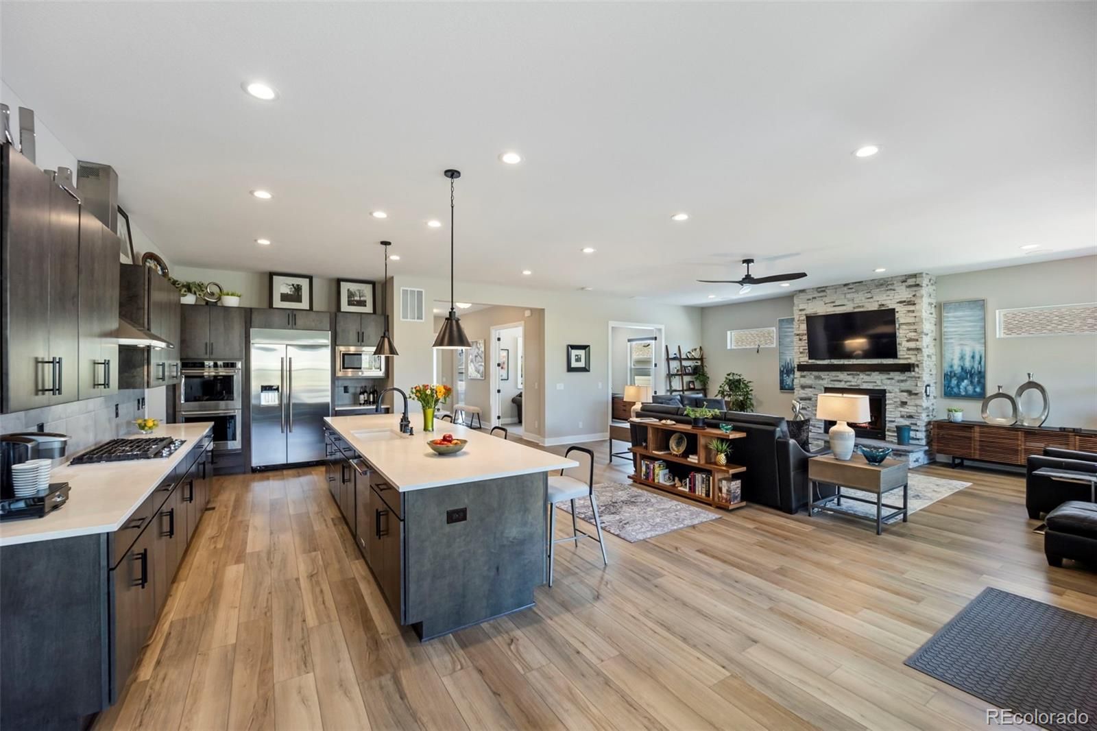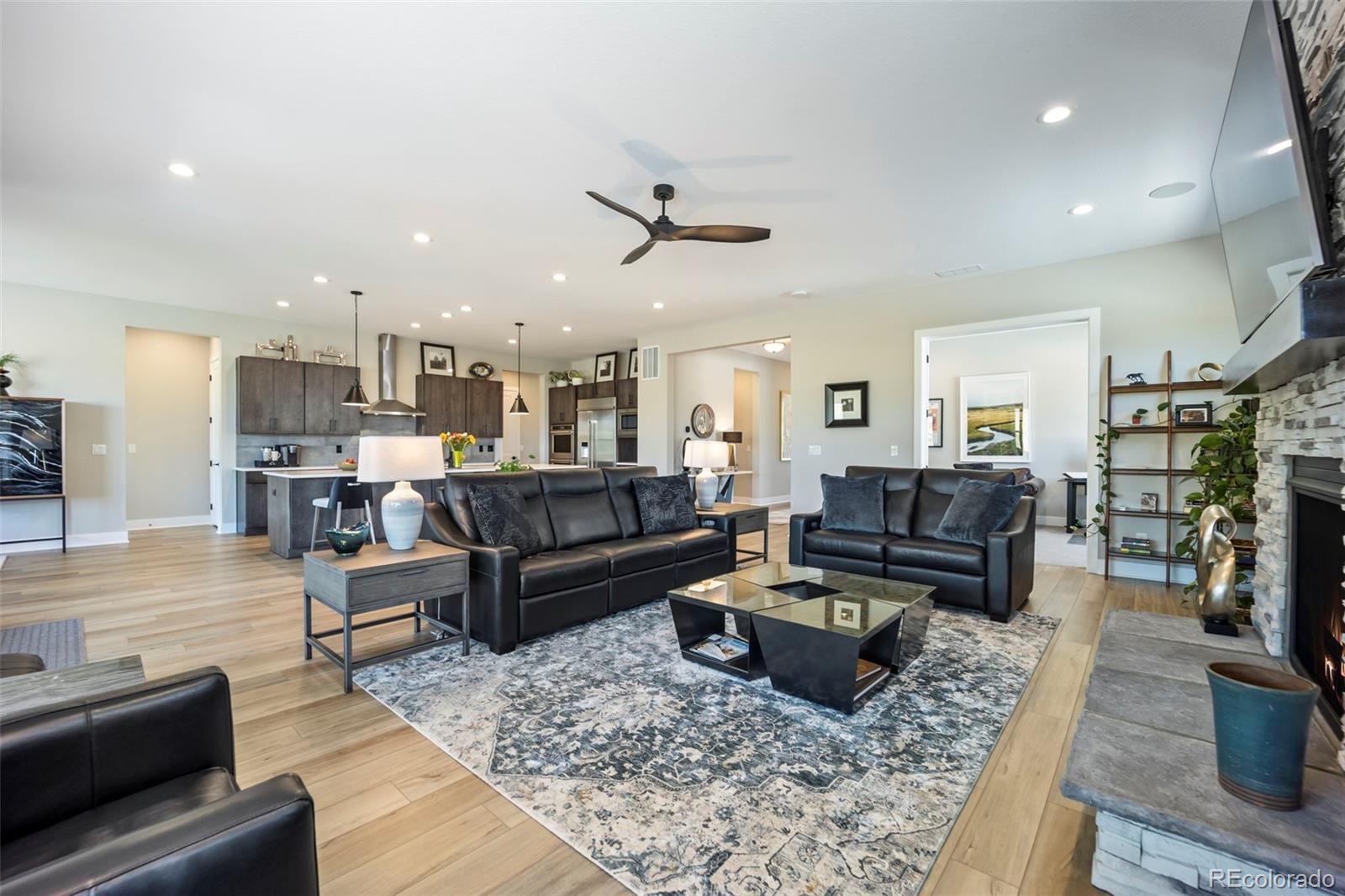 Rare lot w/ open space (rear and side). This extraordinary ranch plan in the coveted "Regency" at Montaine 55+ community offers over 4,700 sq ft (2,720 finished), with thoughtful expansions and luxury upgrades throughout (see attached list). This nearly new home has unmatched privacy, and elegant design. The open-concept great room has been expanded by over 200 sq ft, creating a gathering space anchored by a floor-to-ceiling stacked stone fireplace. The gourmet kitchen showcases quartz counters, extended island, all upgraded "Yorktowne" cabinetry, KitchenAid double ovens, five-burner cooktop, and built-in Jenn-Air fridge. The great room/dining area opens to a covered patio through French doors, where a motorized sun/wind screen and stained concrete patio provide year-round enjoyment. The primary suite was enlarged, featuring a spa-inspired bathroom w/ upgraded shower enclosure, separate toilet room w/ bidet seat, his/her walk-in closets with custom shelving and drawers. Additional BR has walk-in closet and bath attached. French doors enclose the dedicated office, w/ wired high-speed data. 8-foot solid core doors, additional lighting and electrical upgrades throughout, custom cabinets and shelving in closets, pantry, laundry and garage, plus remote- control window shades on all windows. The insulated and painted garage includes polyaspartic floor coating, while the basement—also finished with polyaspartic flooring—offers a rough-in for an additional bath and ample room for two more BR's, a rec area, or fitness space. Outdoors, the home is fully landscaped w/ pet-rated artificial turf, fenced backyard, and stained concrete entry. Peace of mind comes with storm doors and alarm system. Residents of Regency enjoy resort amenities, including a clubhouse, pool, fitness center, tennis/pickleball courts, and miles of scenic trails. Just minutes from downtown Castle Rock’s shops, dining, and golf, this home perfectly balances luxury, lifestyle, and location.
