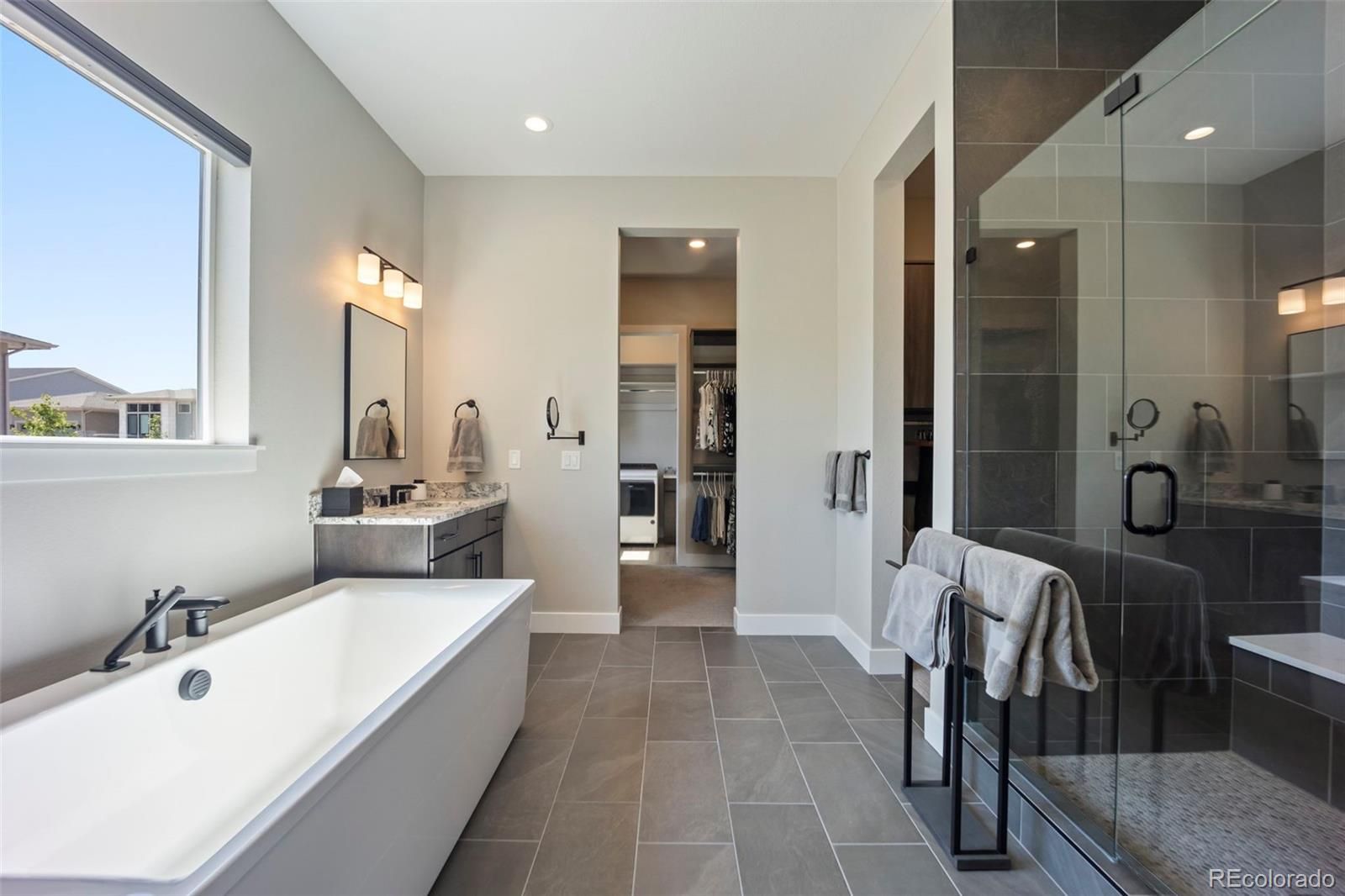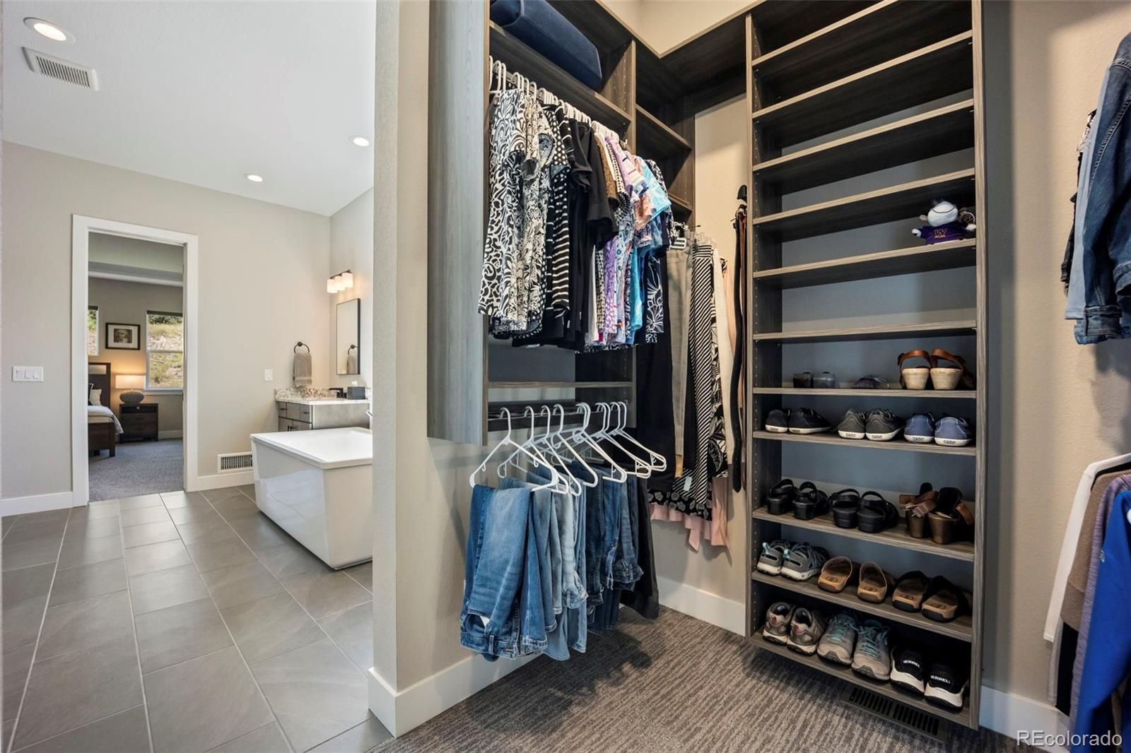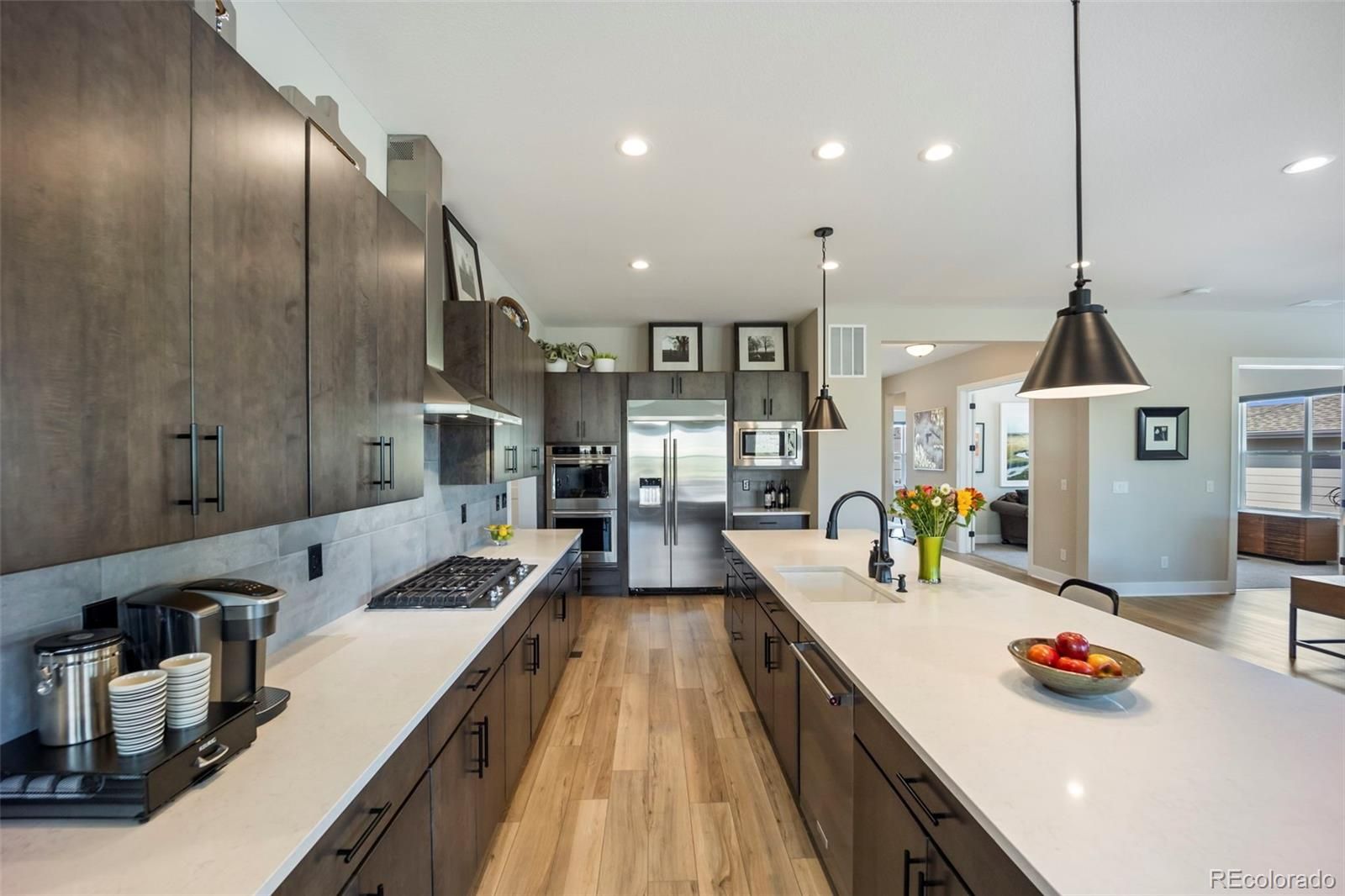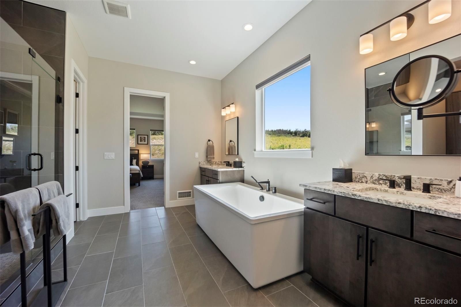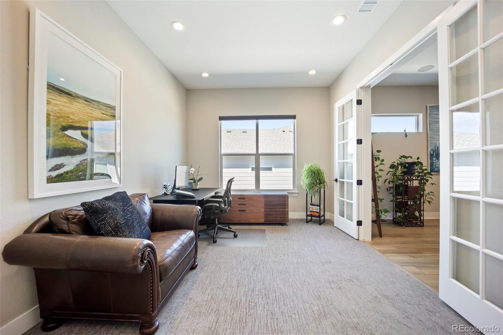 Rare lot w/ open space (rear and side). This extraordinary ranch plan in the coveted "Regency" at Montaine 55+ community offers over 4,700 sq ft (2,720 finished), with thoughtful expansions and luxury upgrades throughout (see attached list). This nearly new home has unmatched privacy, and elegant design. The open-concept great room has been expanded by over 200 sq ft, creating a gathering space anchored by a floor-to-ceiling stacked stone fireplace. The gourmet kitchen showcases quartz counters, extended island, all upgraded "Yorktowne" cabinetry, KitchenAid double ovens, five-burner cooktop, and built-in Jenn-Air fridge. The great room/dining area opens to a covered patio through French doors, where a motorized sun/wind screen and stained concrete patio provide year-round enjoyment. The primary suite was enlarged, featuring a spa-inspired bathroom w/ upgraded shower enclosure, separate toilet room w/ bidet seat, his/her walk-in closets with custom shelving and drawers. Additional BR has walk-in closet and bath attached. French doors enclose the dedicated office, w/ wired high-speed data. 8-foot solid core doors, additional lighting and electrical upgrades throughout, custom cabinets and shelving in closets, pantry, laundry and garage, plus remote- control window shades on all windows. The insulated and painted garage includes polyaspartic floor coating, while the basement—also finished with polyaspartic flooring—offers a rough-in for an additional bath and ample room for two more BR's, a rec area, or fitness space. Outdoors, the home is fully landscaped w/ pet-rated artificial turf, fenced backyard, and stained concrete entry. Peace of mind comes with storm doors and alarm system. Residents of Regency enjoy resort amenities, including a clubhouse, pool, fitness center, tennis/pickleball courts, and miles of scenic trails. Just minutes from downtown Castle Rock’s shops, dining, and golf, this home perfectly balances luxury, lifestyle, and location.