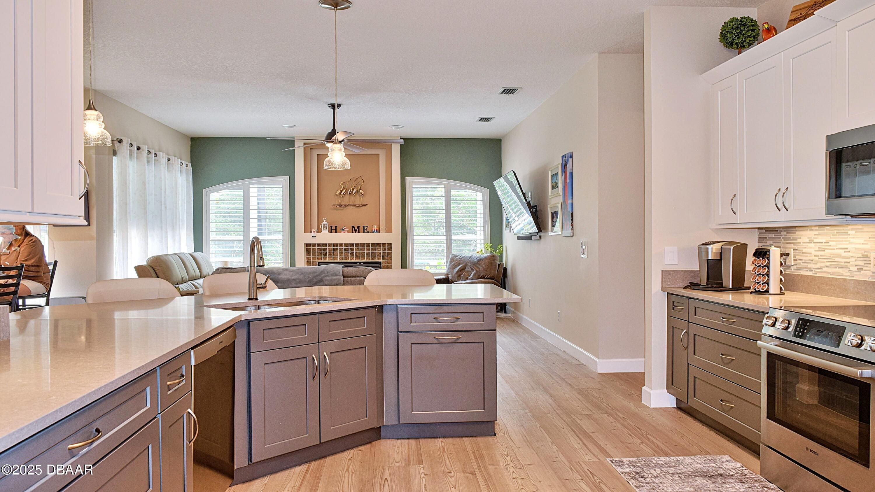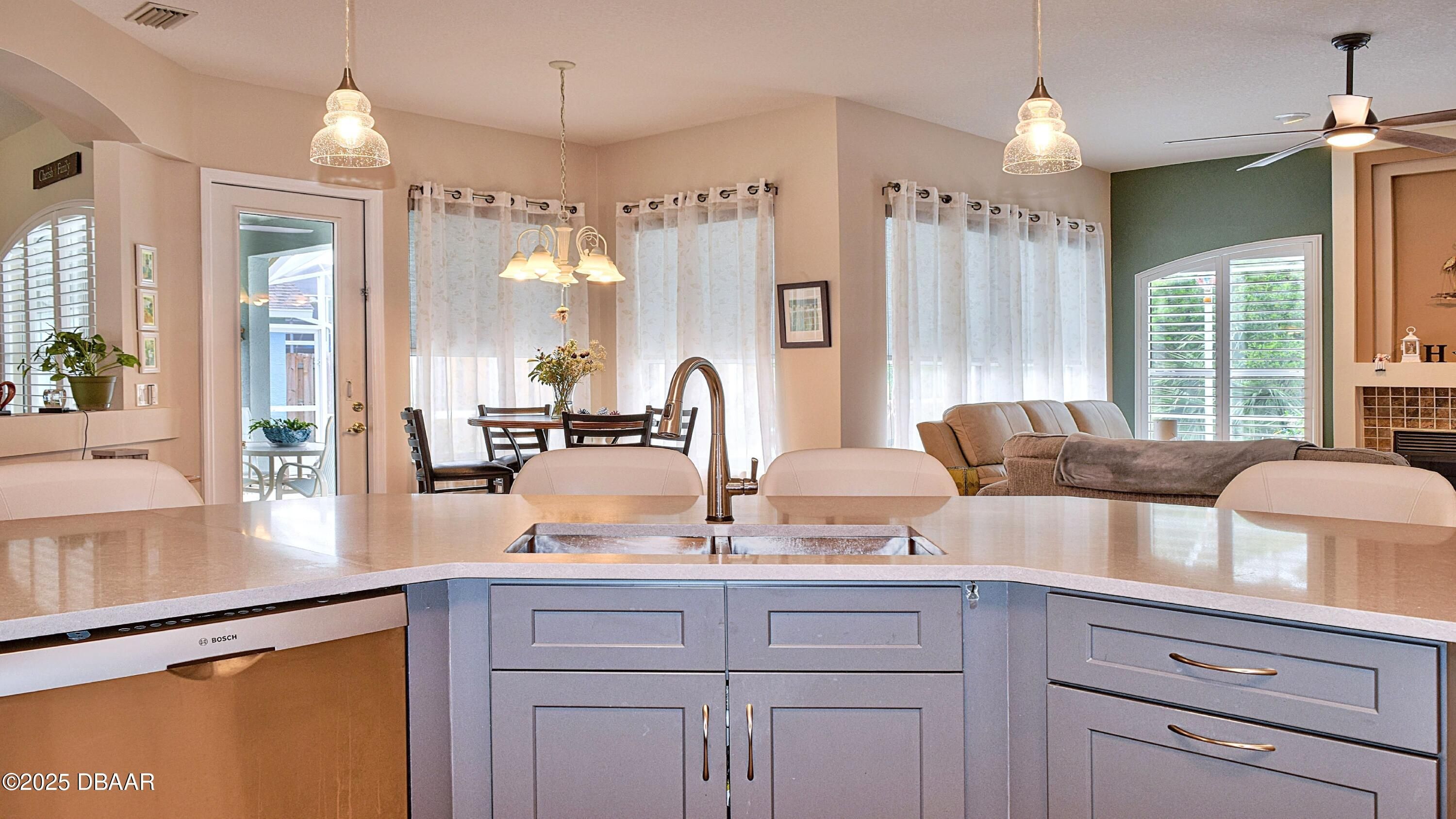 RECENT PRICE REDUCTION! This stunning 4-bedroom saltwater pool home offers both elegance and peace of mind in the highly sought-after gated golf course community of Plantation Bay. Meticulously maintained, it features luxury vinyl plank flooring throughout adding warmth and elegance to every room. The well-designed split bedroom floor plan offers privacy to you and your guests! The updated eat-in kitchen is a chef's dream with a spacious breakfast bar, soft-close cabinetry, sleek quartz countertops, and high-end Bosch stainless steel appliances. This spacious floor plan is perfect for both daily living and entertaining. A cozy gas fireplace enhances the warmth of the living area, while the extended lanai and screened enclosure provide an ideal space for outdoor relaxation by the pool, offering serene views of lush trees. There is so much value offered in this well-cared-for home: a whole house generator 2023, new roof and gutters 2019, new water heater 2025, new pool pump 2024, and the home was repainted in 2024 with Home Shield Coating and comes with a 30-year guarantee! As an added bonus, the sellers are providing a one-year home warranty, offering extra confidence in your investment. Schedule a showing today to see this exceptional home and learn more about the valuable upgrades and features too numerous to list! Nestled in a beautifully landscaped golf course community and secure neighborhood, this home is a rare gem that balances luxury, privacy, and comfort - an opportunity you do not want to miss! Join the Plantation Bay Golf & Country Club (with additional dues/fees) for an active lifestyle that can include access to 45 holes of golf, dining, 2 clubhouses, fitness center, pickle-ball courts, tennis courts, and a resort style pool. Plantation Bay is close to shopping, dining, recreational activities, and the beach!