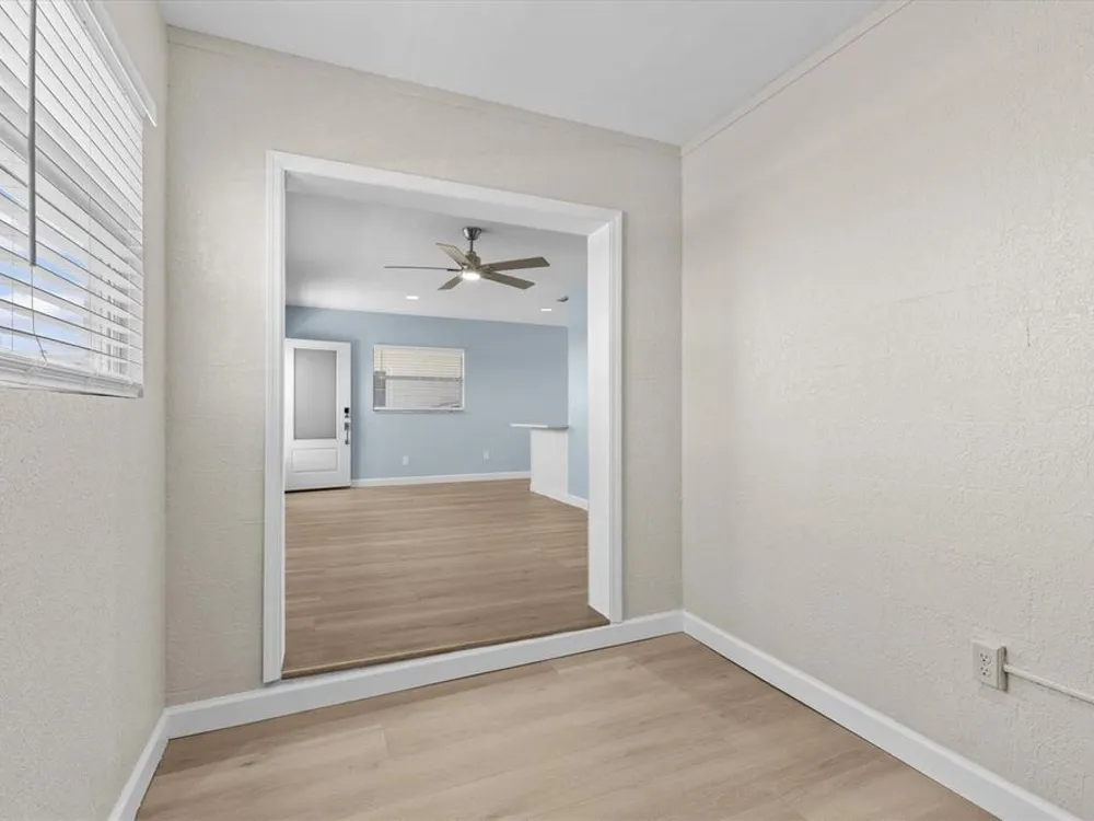 - Ceiling Fan(s), Eat-in Kitchen, Living/Dining Room, Main Level Primary, Solid Surface Counters, Solid-Wood Cabinets, Stone Counters, Thermostat, Window Treatments
