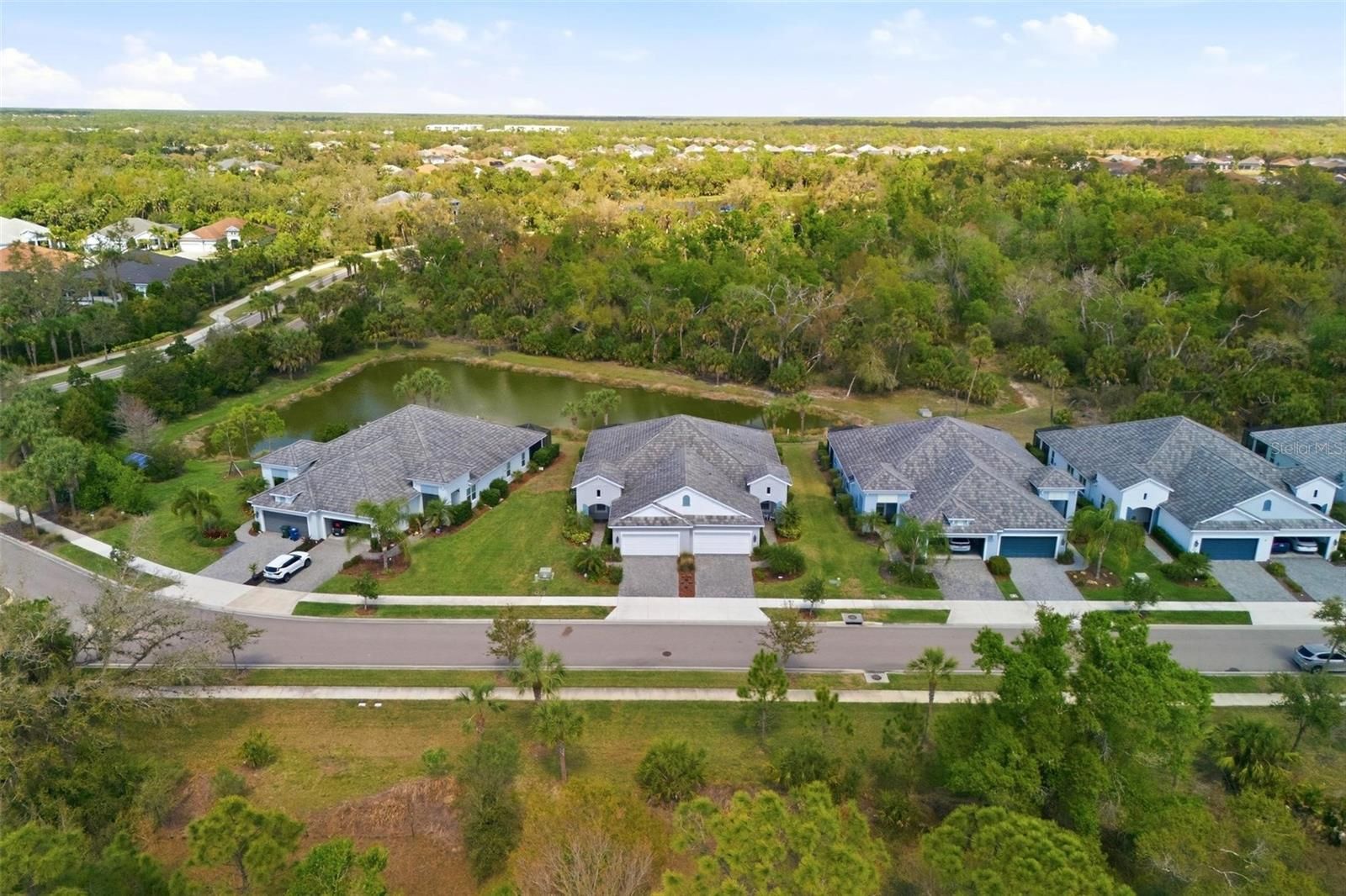 IMPACT WINDOWS AND DOORS, X FLOOD ZONE, CDD PAID OFF, WATER VIEW, PRESERVE VIEWS, BUILT IN 2020, LOW MAINTENANCE LIVING in the highly sought after Grand Palm community in Venice. This beautifully upgraded 2 bedroom, 2 bathroom home with a BONUS ROOM that can function as a den, office, or potential third bedroom offers 1,638 square feet of thoughtfully designed living space with NO NEIGHBORS IN FRONT OR BEHIND. The home sits on a premium homesite with a preserve across the street and a lake with preserved land behind it, creating a rare level of privacy while also being positioned far from River Road for a quiet setting. Inside, the main living areas feature wood look ceramic tile flooring, 8 FOOT INTERIOR DOORS, crown molding, plantation shutters, and a tray ceiling in the living room with built in Bose ceiling speakers. The kitchen features QUARTZ COUNTERTOPS, a glass tile waterfall backsplash, GE PROFILE appliances including an induction range and Advantium microwave convection oven, upgraded Timberlake cabinetry with dovetail construction, under cabinet lighting, a cabinet depth refrigerator enclosure, walk in pantry with glass door, and a large island with decorative panels and pendant lighting. Pocket sliding IMPACT GLASS doors open to the screened lanai featuring automated roll down privacy sunscreens, a ceiling fan, and a desirable northern exposure overlooking the water, creating seamless indoor outdoor living. The primary suite includes crown molding, private lanai access, plantation shutters, two closets with custom shelving including a walk in closet, and a spacious bathroom with dual granite vanities and upgraded shower package with handheld spray. Additional features include a bonus room with double glass French doors and a custom built in desk with marble top and under cabinet lighting, epoxy finished garage flooring with built in shelving and utility sink, smart home technology with thermostat, Z Wave hub, HD video doorbell, Guardian security system, radiant barrier roof sheathing for improved energy efficiency, sealed pavers in 2025, termite baiting system, and a landscaped palm island with decorative river rock behind the home. Grand Palm residents enjoy resort style amenities, walking trails, fitness center, pools, pickleball courts, and a vibrant social calendar just minutes from Wellen Park, downtown Venice, and the Gulf beaches.