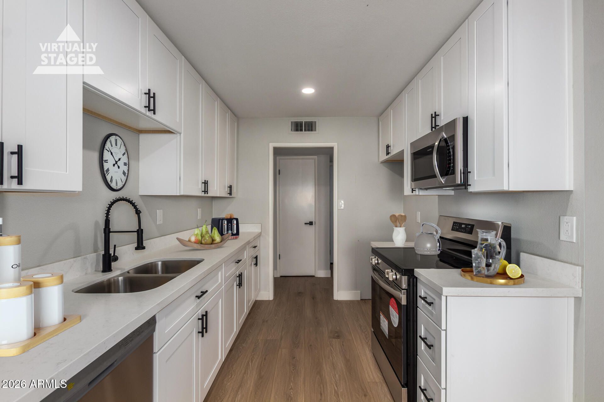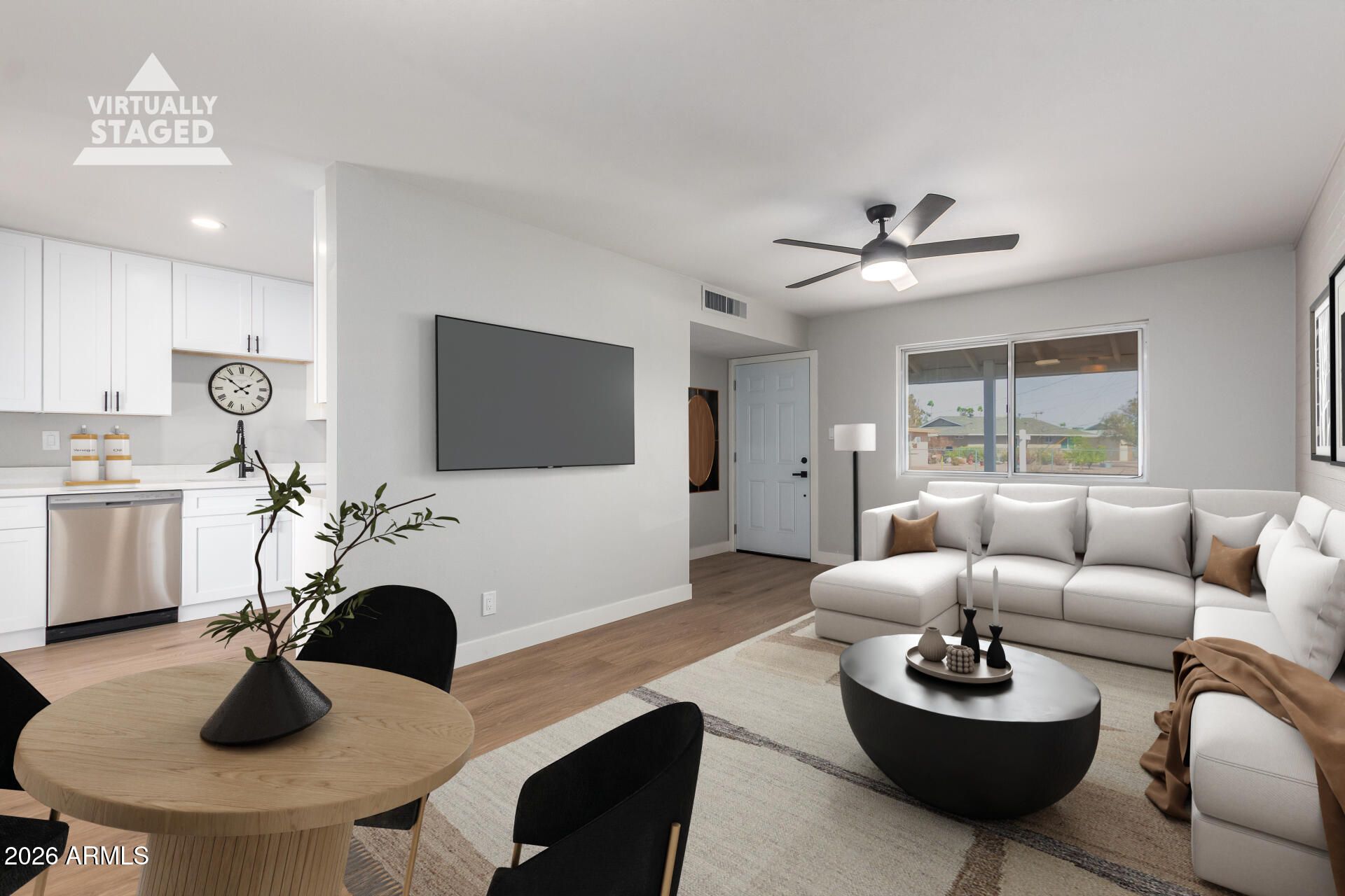 Welcome to your dream home in Sun City, Arizona - ON THE GOLF COURSE! This charming 2-bedroom, 1-bathroom residence has been remodeled from top to bottom and is perfect for those looking to embrace the vibrant lifestyle this active adult community has to offer. As you step inside, you'll be greeted by a warm and inviting living space that features natural light, creating a cozy atmosphere for relaxation or entertaining. The kitchen is equipped with modern stainless steel appliances, new white shaker cabinets and brand new quartz countertops. Freshly painted and new LVP vinyl plank installed throughout the home. The bathroom features a spacious brand new walk-in tile shower. Outside, you'll find a lovely patio area overlooking the golf course, perfect for enjoying the beautiful Arizona