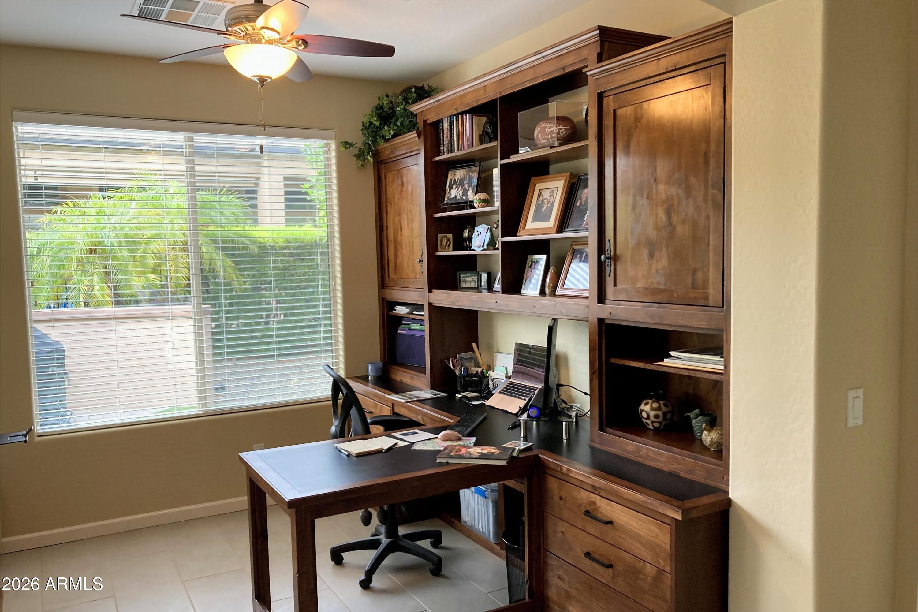 Presenting a residence in the prestigious adult community of Trilogy at Vistancia, this Montis model offers refined living with staggered maple cabinetry featuring a rich bordeaux finish, granite countertops, & stainless steel appliances & gas range. Additional amenities include reverse osmosis, soft water system, a built-in pantry, bay window overlooking the courtyard, 18'' tile flooring, pull-out shelving in kitchen & bath, pre-wired surround sound, & a custom-built entertainment center in the living room. An open den features a built-in office with views of the professionally landscaped backyard. The garage is equipped with built-in cabinetry and epoxy flooring. Residents enjoy access to resort-style community pools, two state-of-the-art fitness centers, golf course, activities & more. This home truly is a must see! In addition the primary bath has a walk in custom shower, the front entryway includes a privacy wall and gate around courtyard; decorative bronze hardware throughout the home; 2" faux blinds on all windows; recessed lighting; custom paint; upgraded fans with lights; upgraded sink with extension faucet; crown molding around kitchen cabinets; fire sprinklers; security doors on the front and patio doors; and a beautiful bay window in the master bedroom.