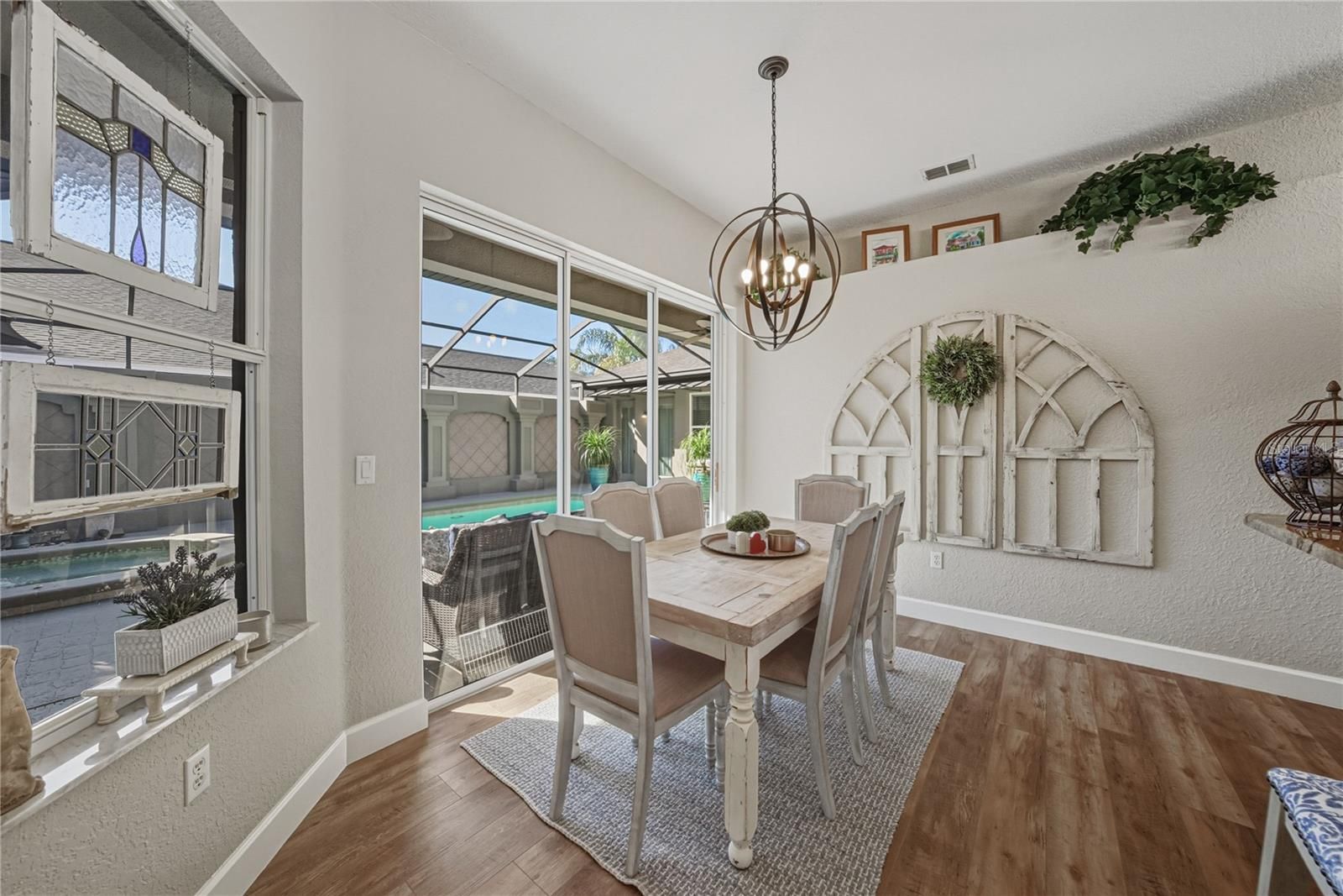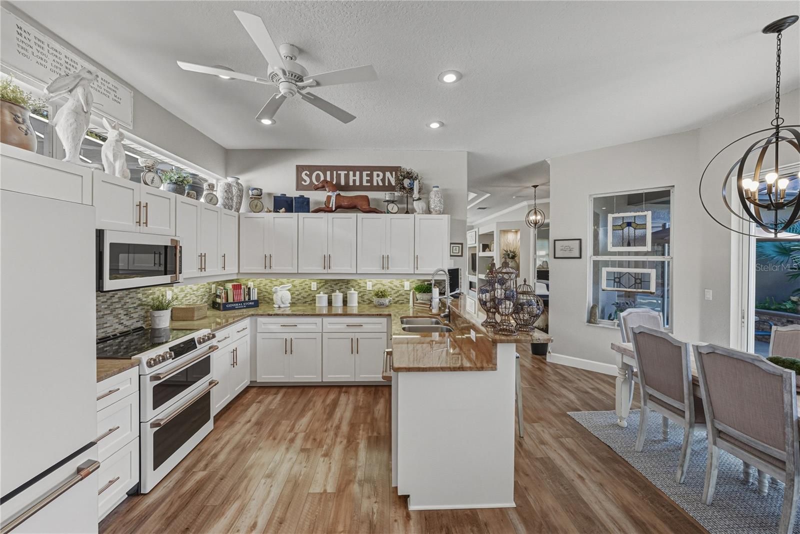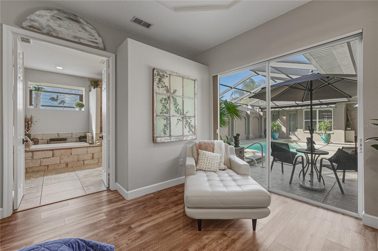 Resting behind the gates of the amenity-filled Lake Jovita community on nearly a quarter acre, this exceptional 3 bedroom, 3 bath cabana-style pool home offers an incredibly versatile floor plan designed around a stunning central courtyard, creating an ideal setup for the epitome of Florida living. Lush tropical landscaping sets the tone as you arrive, hinting at the beautifully renovated oasis that awaits within. A 2 car garage and a golf cart garage add extra convenience for county club living. Step inside the 2/2 main home and you'll immediately notice the thoughtful updates throughout, beginning with a living room bathed in natural light streaming through transom windows and a quadruple sliding door that opens to the screened porch offering spectacular golf course views. Here, luxury vinyl plank flooring gleams beneath high coffered ceilings, while a built-in entertainment center and electric fireplace serve as an intricate architectural focal point. The adjacent dining area continues this refined aesthetic with its own built-in storage and elegant lighting, creating an effortless flow between spaces. The eat-in kitchen is nothing short of stunning. Direct access to the pool courtyard through its own sliding door blurs the line between indoor and outdoor living, while the expansive walk-in pantry, granite countertops, breakfast bar seating, and high end Cafe Series appliances provide beauty as well as optimal function. Upgraded lighting and a ceiling fan, add subtle touches of southern charm to this culinary haven. Privately positioned away from the secondary bedroom, the primary suite becomes your personal retreat with its own pool access and spacious sleeping quarters crowned by coffered ceilings. The enormous walk-in closet sits within an updated ensuite sanctuary featuring a rectangular soaking tub, generous walk-in shower, dual vanities, a private water closet, and decorative tiling that infuses the space with distinctive character. Meanwhile, on the opposite wing of the main home, the second bedroom offers equally convenient pool access and sits just steps from the home's second full bathroom. Venture through the courtyard to discover the private cabana suite, a versatile space perfect for guests, multi- generational living, or a creative retreat. This separate accommodation includes one bedroom, a walk-in closet, and a completely renovated full bathroom with a walk-in shower and sleek glass enclosure. Your outdoor living options are equally impressive. Unwind on the screened patio while taking in serene golf course views, dive into the sparkling swimming pool, or let the heated spa's gentle flow soothe away the day's stresses. Beyond your private paradise, Lake Jovita's exceptional amenities await your enjoyment, including access to a playground, park, pickleball court, and walking trails. Optional membership packages at the Lake Jovita Golf and Country Club include access to 2 18- hole world-class golf courses, a Jr. Olympic size swimming pool, a restaurant, a clubhouse, a fitness center, a pro shop, and more! All while being just a short drive from downtown Dade City, San Antonio, the beloved Mirada Lagoon, and major highways for effortless connectivity. Call today for your private tour of this remarkable property!