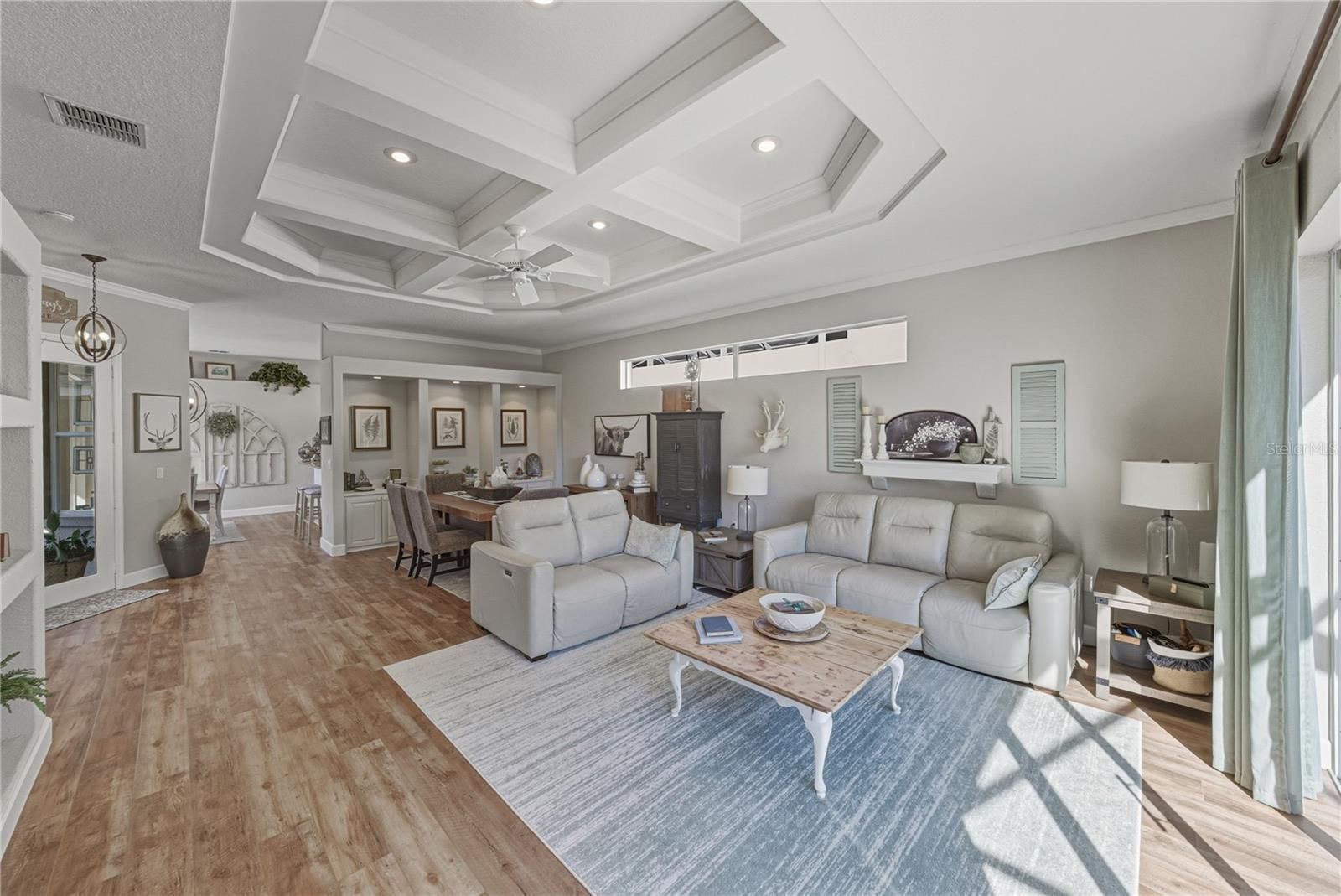 - Built-in Features, Ceiling Fan(s), Coffered Ceiling(s), Eat-in Kitchen, High Ceilings, Living/Dining Room, Main Level Primary, Solid-Wood Cabinets, Split Bedrooms, Stone Counters, Walk-In Closet(s)