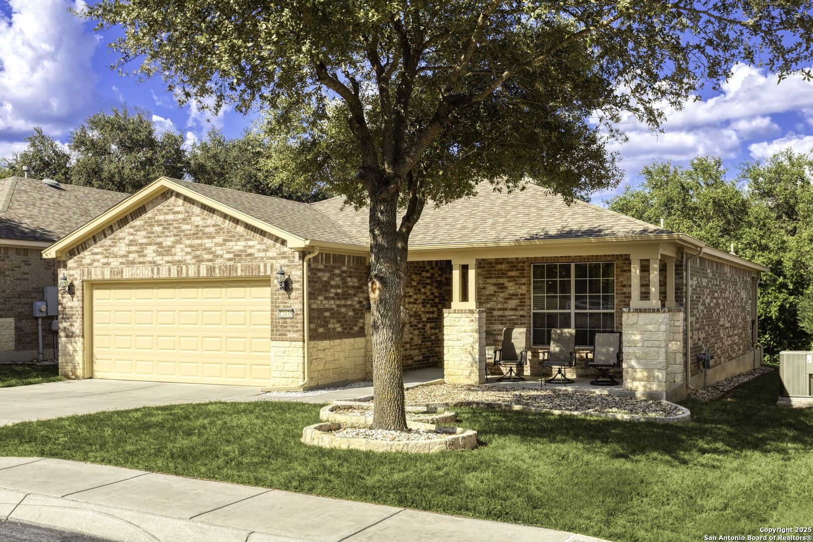Reduced $10,000! Situated in the remarkable Hill Country Retreat community, this charming home backs to a greenbelt for privacy! The pleasant front porch beckons you inside the 100% brick & stone residence, to experience bright open living spaces. The kitchen features abundant cabinetry, gas cooktop, and Corian-style counters w/integrated sink for easy cleaning. Enjoy a spacious master retreat w/expansive windows & luxury bath affording a double vanity, 2 sinks, separate soaking tub & walk-in shower, and a generous closet! The second bedroom is also roomy, plus a study/office offers a great spot for hobbies & work alike. Don't miss the laundry room w/sink! Enjoy the covered back patio as you overlook the lawn w/irrigation system and appreciate natural views of the greenbelt. Discover the incredible amenities of this Resort Style 55+ neighborhood, including pickleball & tennis courts, Bocce ball, fitness center, indoor & outdoor pools, trails, clubs, and a library, all located within a peaceful community that affords convenient access to fine shopping, dining, and other San Antonio attractions!