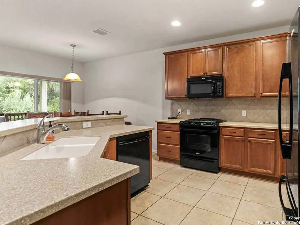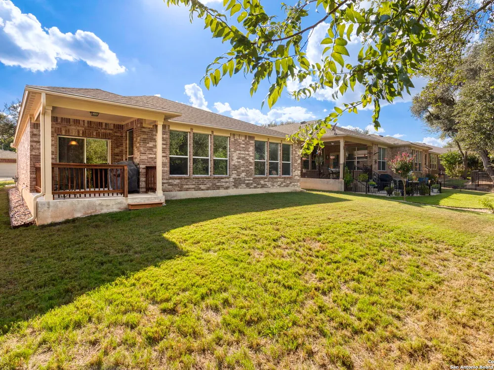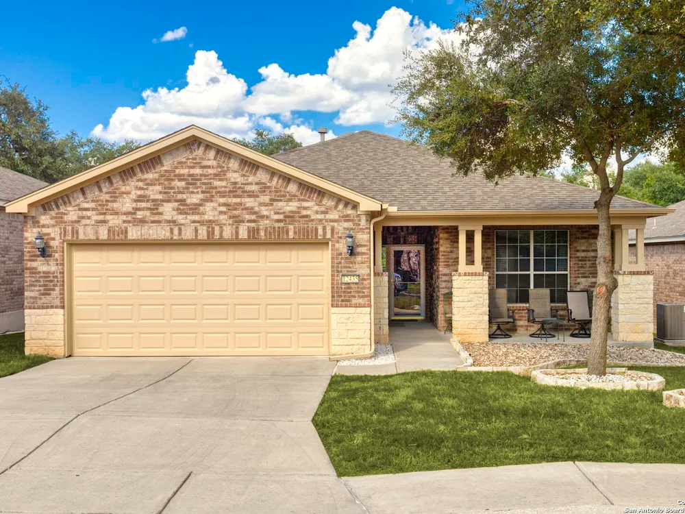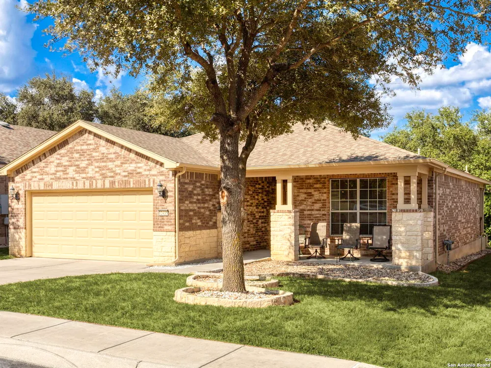 Situated in the remarkable Hill Country Retreat community, this charming home backs to a greenbelt for privacy! The pleasant front porch beckons you inside the 100% brick & stone residence, to experience bright open living spaces. The kitchen features abundant cabinetry, gas cooktop, and Corian-style counters w/integrated sink for easy cleaning. Enjoy a spacious master retreat w/expansive windows & luxury bath affording a double vanity, 2 sinks, separate soaking tub & walk-in shower, and a generous closet! The second bedroom is also roomy, plus a study/office offers a great spot for hobbies & work alike. Don't miss the laundry room w/sink! Enjoy the covered back patio as you overlook the lawn w/irrigation system and appreciate natural views of the greenbelt. Discover the incredible amenities of this Resort Style 55+ neighborhood, including pickleball & tennis courts, Bocce ball, fitness center, indoor & outdoor pools, trails, clubs, and a library, all located within a peaceful community that affords convenient access to fine shopping, dining, and other San Antonio attractions!