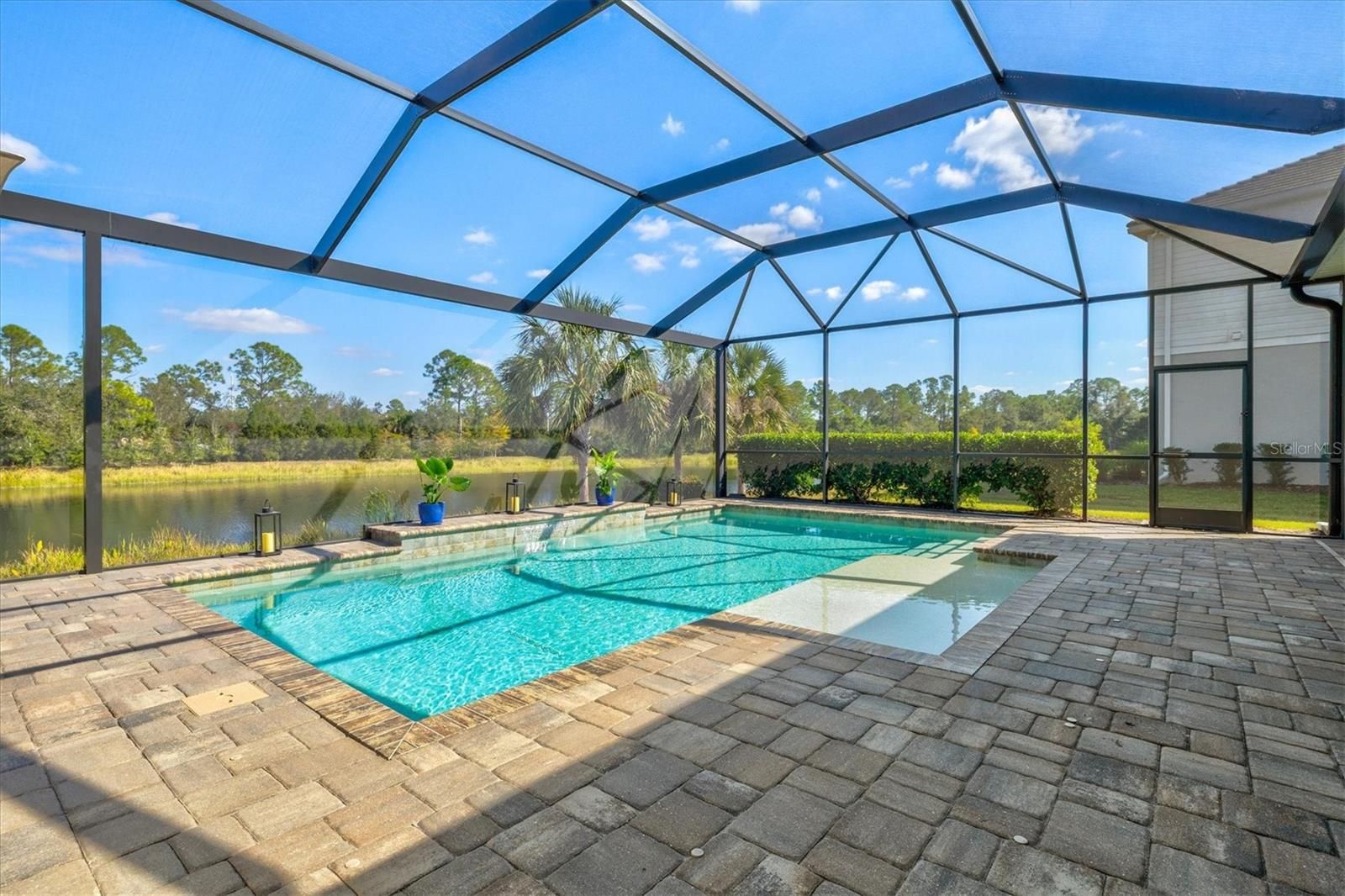 Welcome to 12436 Destin Loop, a FULLY FURNISHED Sanibel model from the Coastal Series, located in Grand Palm’s exclusive private gated area within the community and near the vibrant Wellen Park community. Offered fully furnished, this turn-key home allows you to move right in and enjoy MAINTENANCE FREE Florida living at its finest. Step outside to your private Florida retreat—one of the home’s most impressive features. The sparkling saltwater pool is surrounded by a panoramic screen cage and includes a Paradise Grill and a TV. Everything is included for the buyer, making this space perfect for effortless entertaining and tranquil waterfront relaxation. Mature landscaping and expansive preserve and pond views provide complete privacy. A paver driveway and walkway lead to a charming covered front porch sitting area and a durable tile roof, setting the tone for the quality found throughout the home. Inside, you’ll appreciate 10-foot ceilings, 8-foot door openings, crown molding in the living room tray ceiling, and a custom built-in fireplace and mantel that create a warm and elevated living environment. The gourmet kitchen showcases quartz countertops, a stylish tile backsplash, 42-inch shaker cabinets, a natural gas range with a wood vent hood, a convection oven, GE stainless steel appliances, and a walk-in pantry with custom shelving. The spacious primary suite includes two large walk-in closets, dual vanities, a soaking tub, a walk-in shower, and refined finishes throughout. Custom closets are thoughtfully integrated for exceptional organization. Additional features include an Extended Club Room, roller blackout blinds, ceramic tile flooring, an epoxied three-car garage, and glass shower doors in all three bathrooms, and a WHOLE-HOUSE NATURAL GAS GENERATOR.