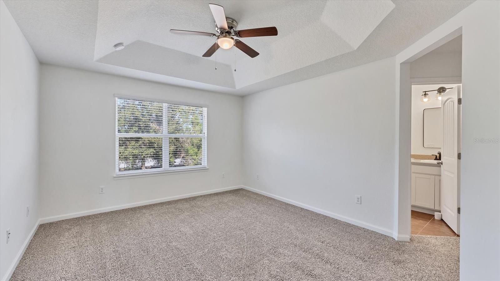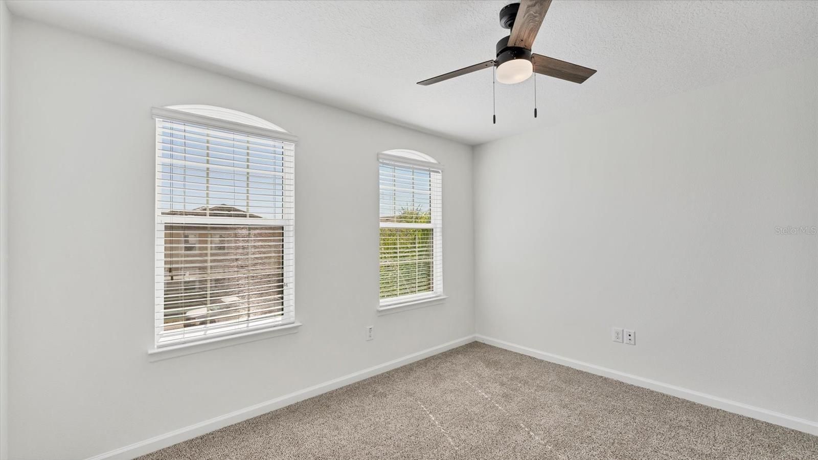 - Ceiling Fan(s), High Ceilings, Kitchen/Family Room Combo, Upper Level Primary, Solid Surface Counters, Solid-Wood Cabinets, Split Bedrooms, Stone Counters, Thermostat, Window Treatments