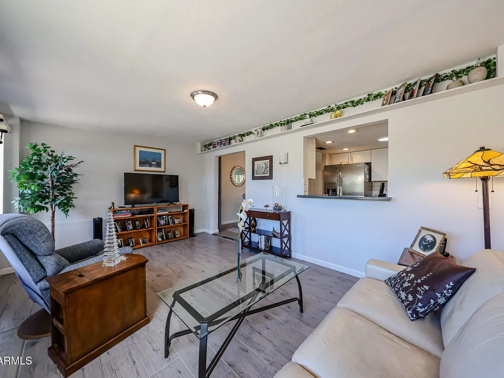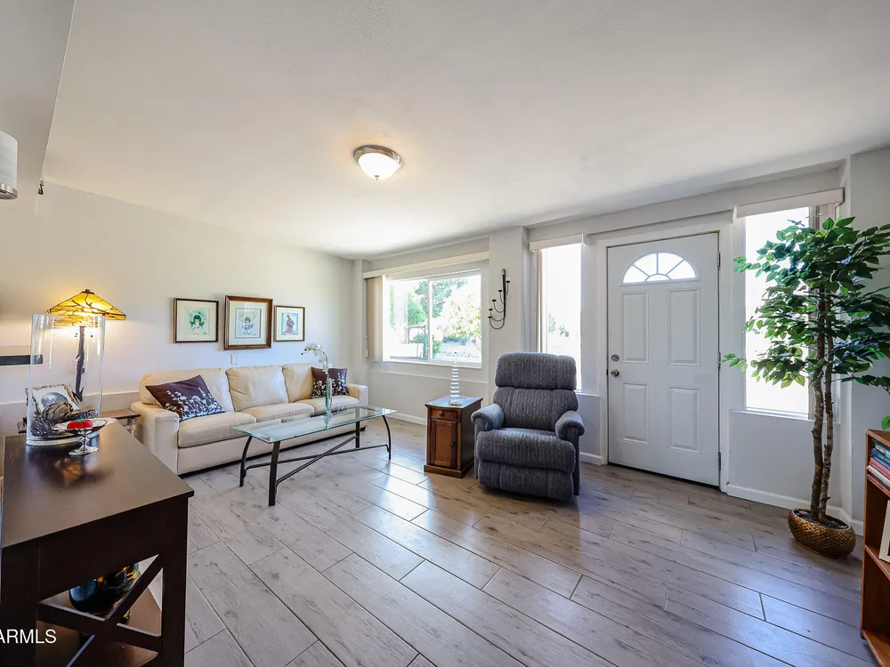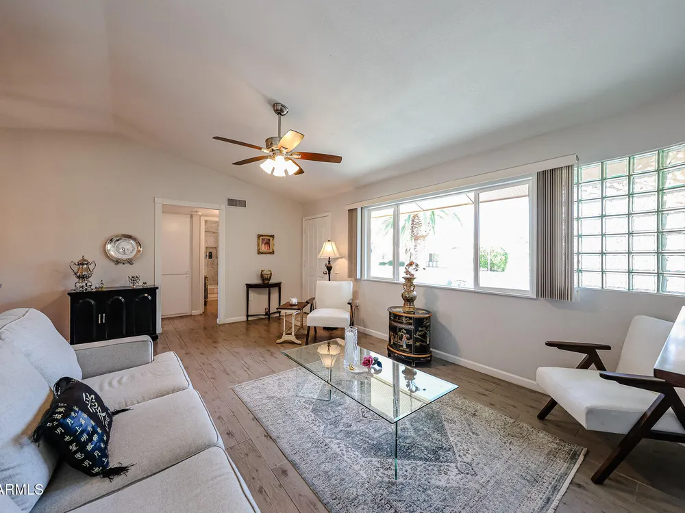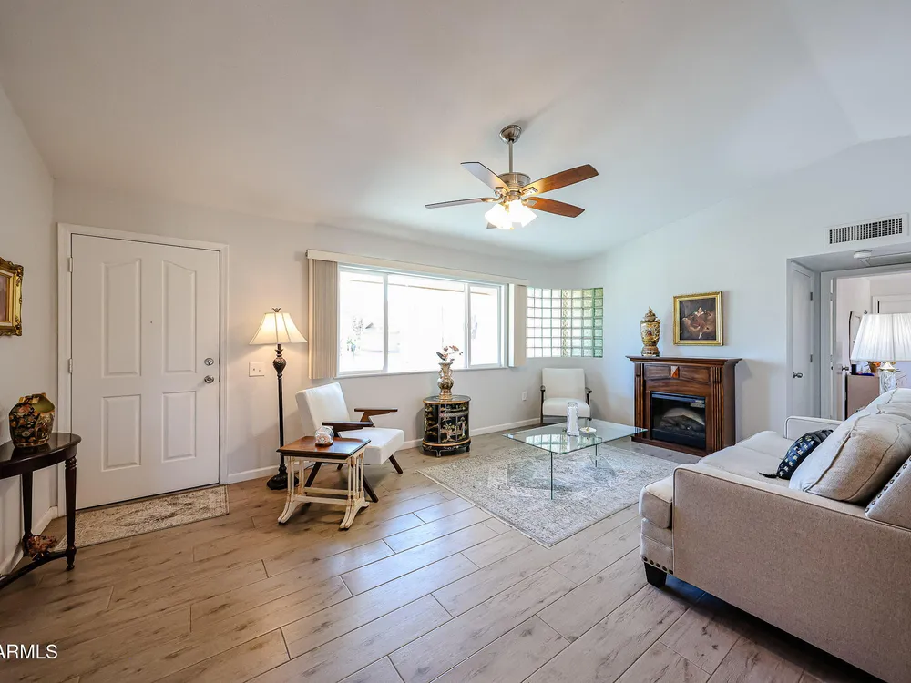 Get ready for the retirement lifestyle when you move into this super clean, tastefully furnished expanded Mocassin -just bring your suitcase! Roof, AC, windows are all done. Beautifully updated kitchen with quartzite counters and SS appliances. Updated baths with marble tile and quartz counters. Wood look ceramic flooring throughout and bedrooms with carpet. Inside laundry. Large backyard. Front courtyard with pavers perfect for relaxing with friends. Don't miss this furnished, move-in ready gem!