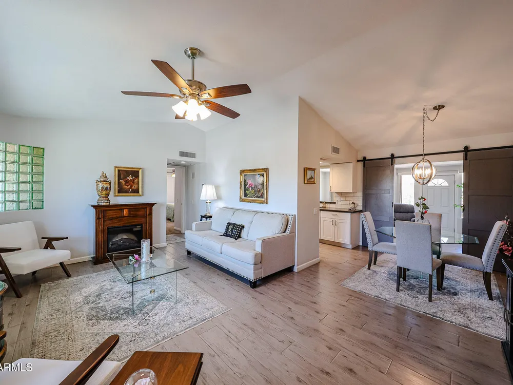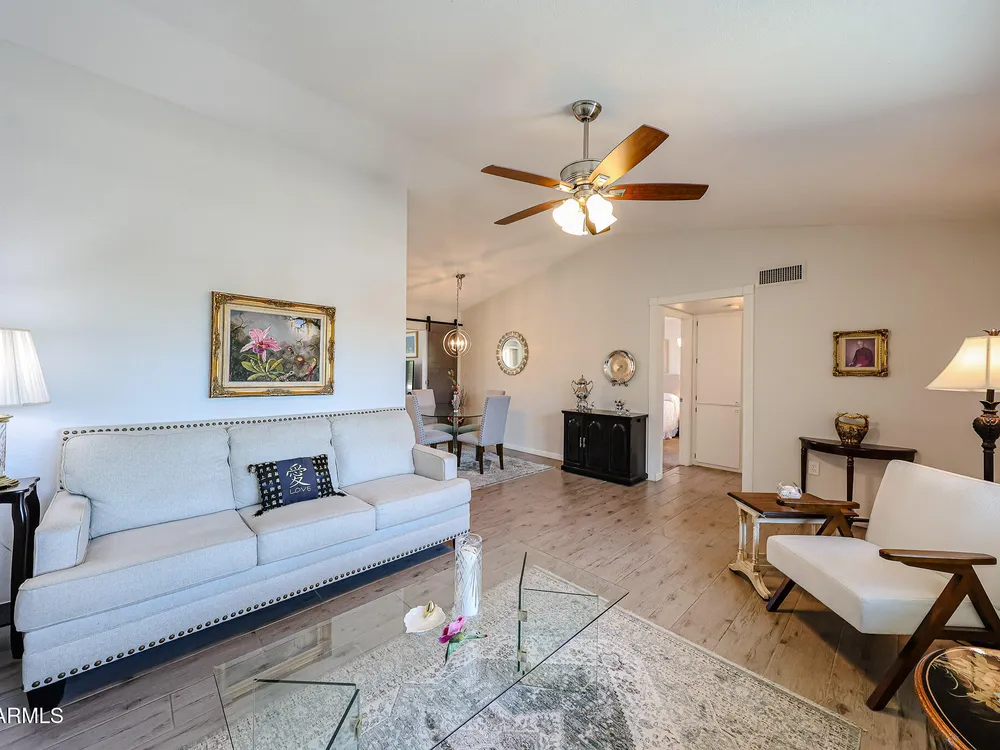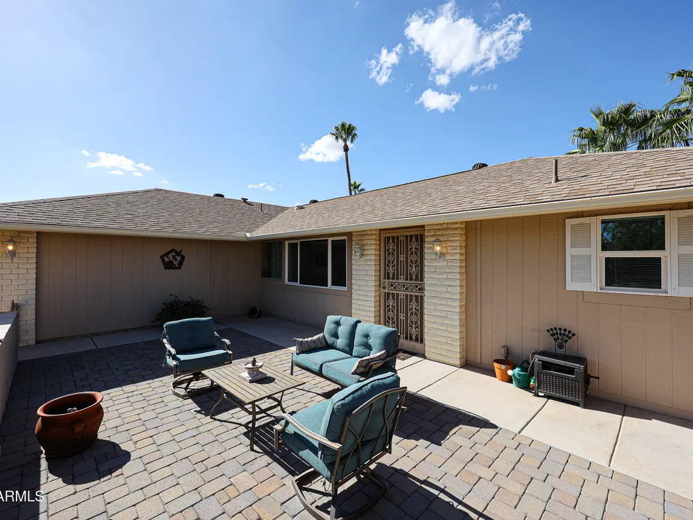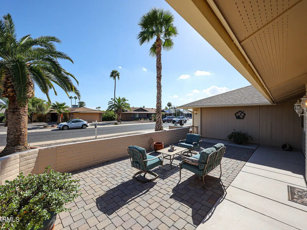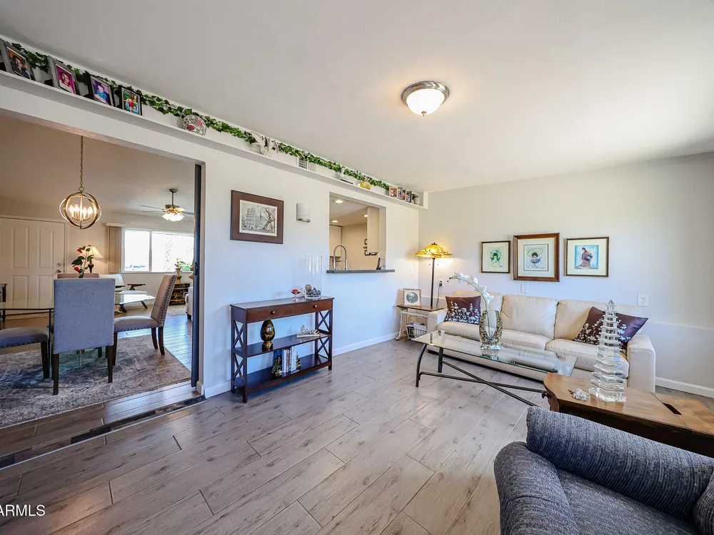 Get ready for the retirement lifestyle when you move into this super clean, tastefully furnished expanded Mocassin -just bring your suitcase! Roof, AC, windows are all done. Beautifully updated kitchen with quartzite counters and SS appliances. Updated baths with marble tile and quartz counters. Wood look ceramic flooring throughout and bedrooms with carpet. Inside laundry. Large backyard. Front courtyard with pavers perfect for relaxing with friends. Don't miss this furnished, move-in ready gem!