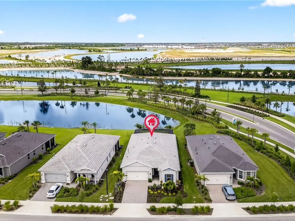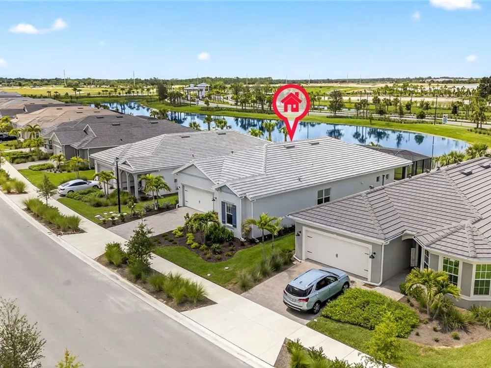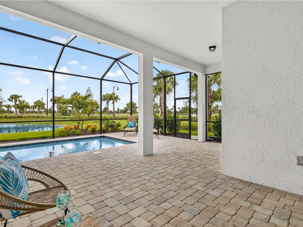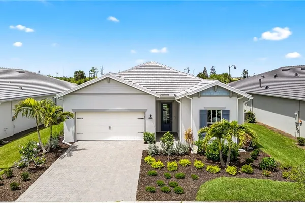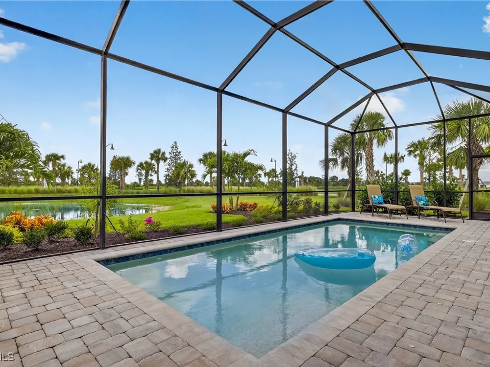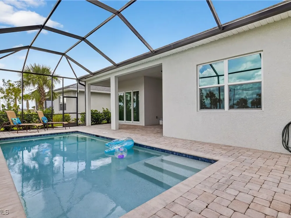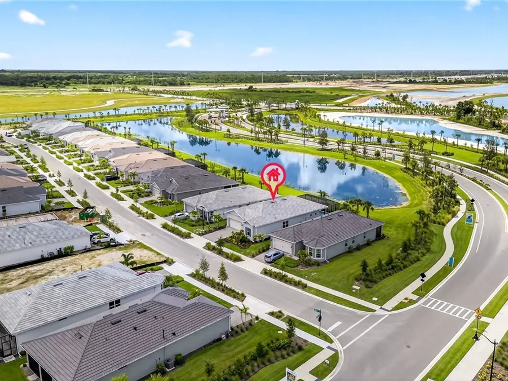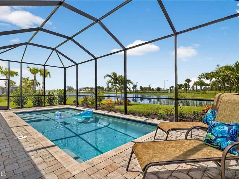 Babcock Ranch is a fast-growing top 10 planned community in the US, and is the hurricane resistant, solar powered and self-sustainable town of the future. This like-new DiVosta (Pulte) Prestige model located in Babcock Ranch is in the active adult TerraWalk community. There are loads of upgrades in this home, including a third bedroom and half bath, ideal for day and dinner guests. The beautiful white cabinets, built-in oven and island with quartz countertops make your kitchen a perfect place to spend time with family and friends. The fabulous diamond pattern tile runs throughout the main living space of the home. The private primary ensuite boasts frameless glass doors for the shower, dual sinks in the large vanity, and two large walk-in closets. A second ensuite with a bath and walk-in closet is a perfect guest hideaway. Additional upgrades include professionally replaced landscaping, hurricane rated windows and doors, all new screens and added shelving in all closets and pantries. Another BIG bonus... this home is covered by a transferrable warranty from the builder, Pulte's 1-2-5-10 plan. Everything is fully covered through the end of April 2026. As you look out back to your magnificent outdoor space, you will notice two sets of triple sliding doors leading to your private outdoor oasis. Just past the covered lanai area is your own inground pool under a screened cage, and it all overlooks a pond where you can fish or just enjoy the abundance of nature. TerraWalk is an exceptional community, with an eight-acre, resident-only amenity campus scheduled for a December 2025 completion. There will soon be a resort style pool with poolside service, bar, restaurant, pickle ball and tennis courts, bocce, fitness center, even a dog park. This is a prime community that will be a showpiece for all of Babcock Ranch to envy.