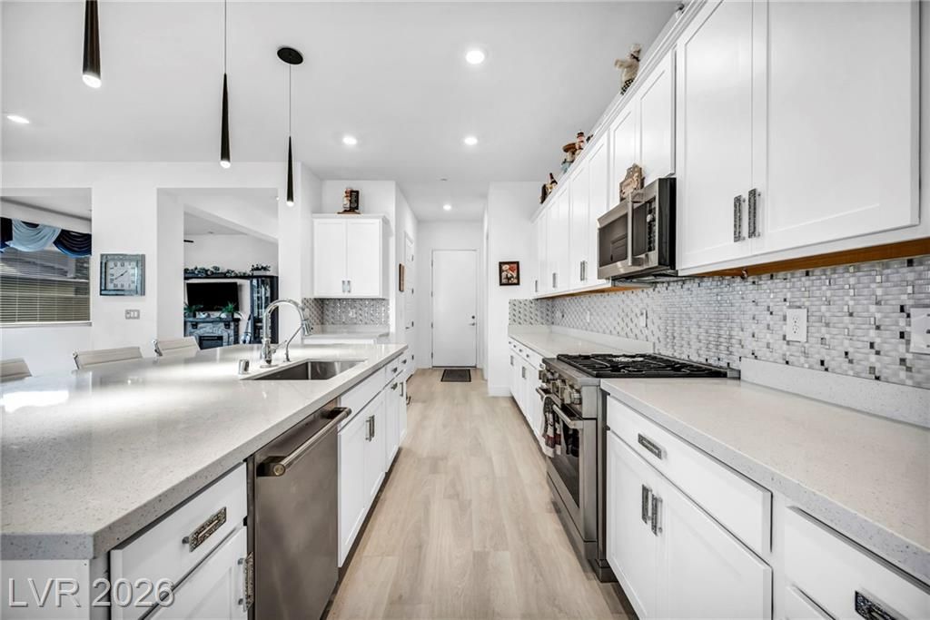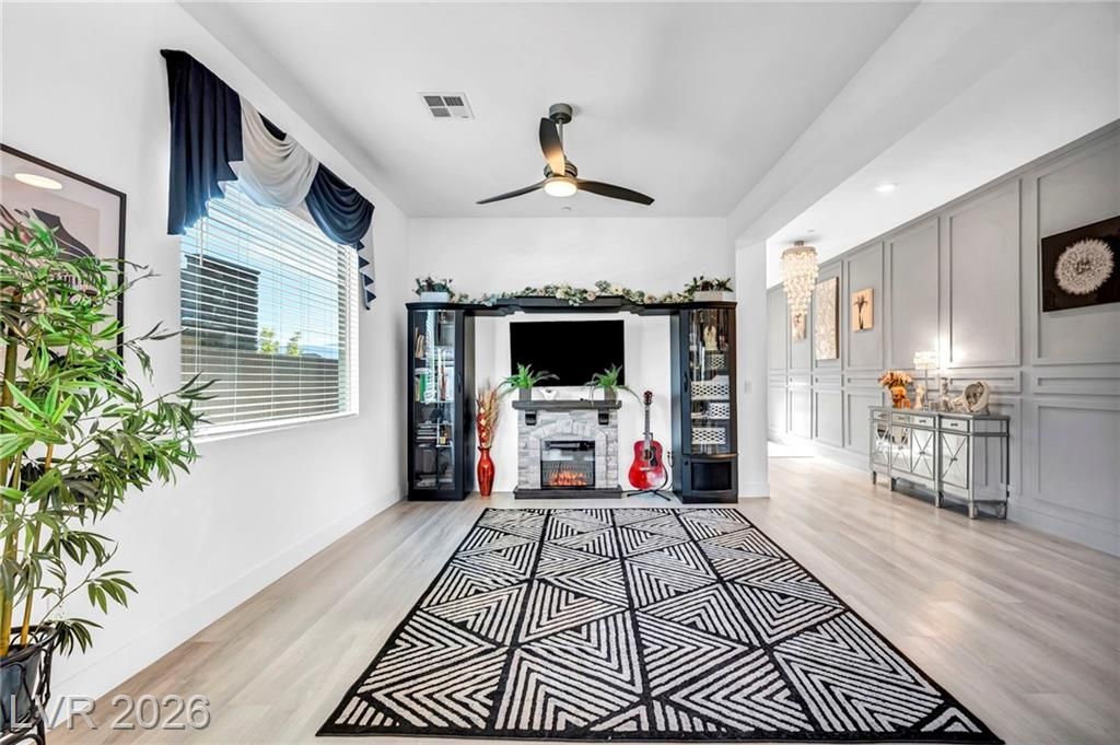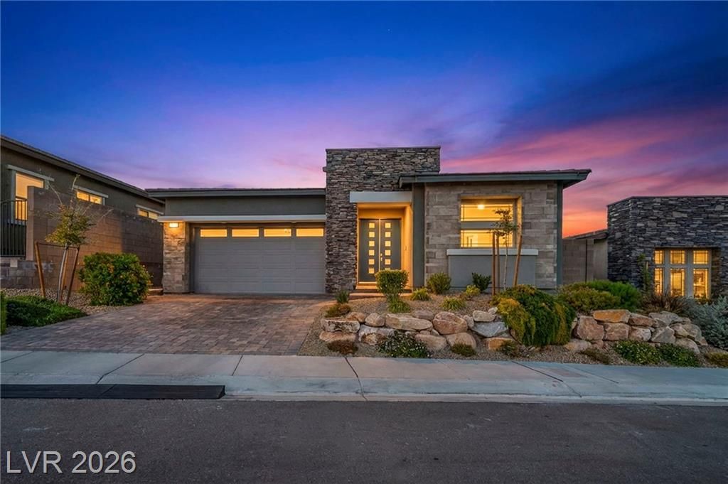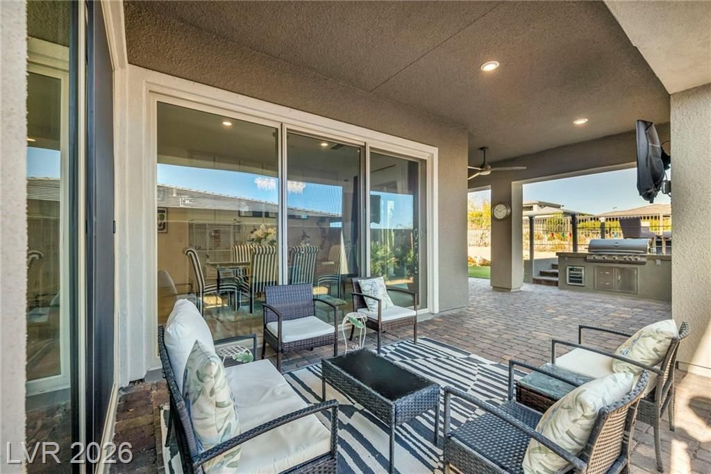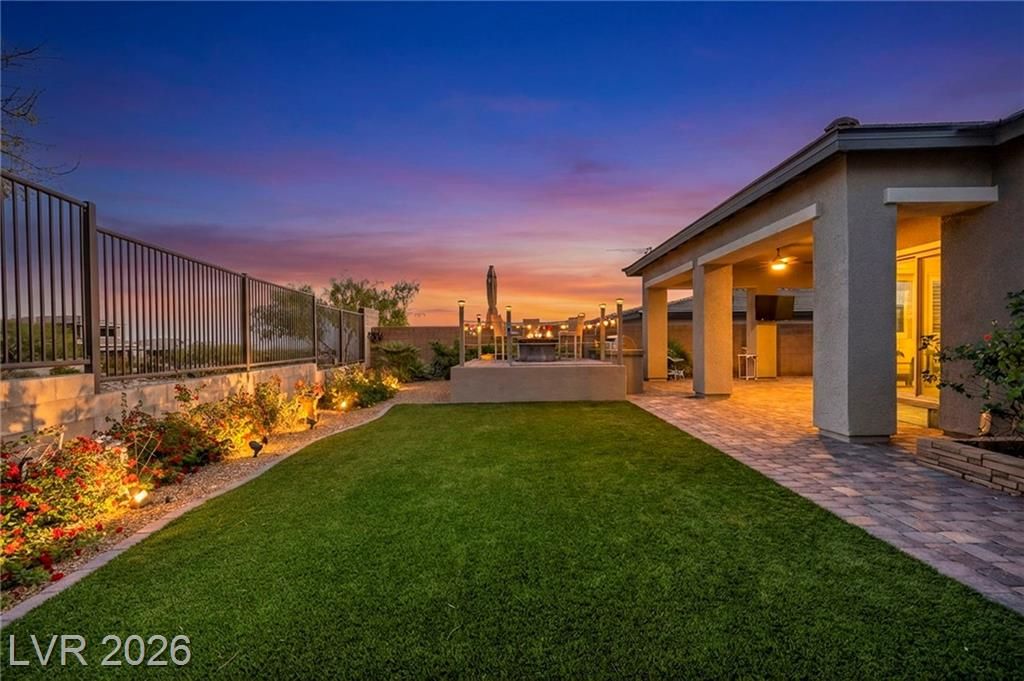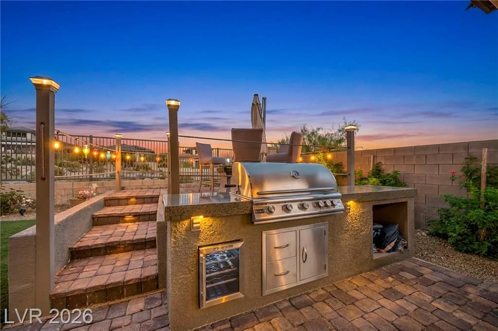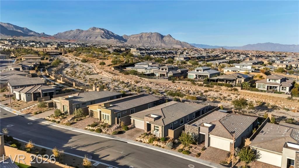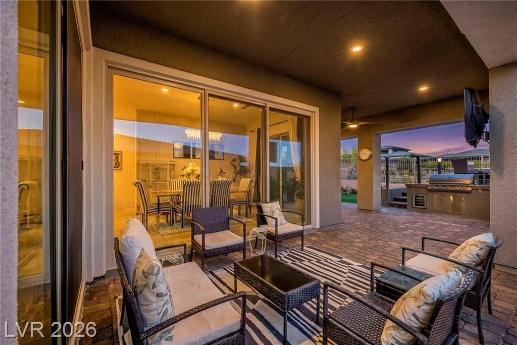 Breathtaking Strip & Mountain Views! This modern 2022-built home sits on an incredible lot with no rear neighbors, offering unobstructed views of the Strip and surrounding mountains. Inside, enjoy 2 bedrooms, 2 bathrooms, ceiling fans, fireplaces, and a primary suite with direct backyard access. The kitchen boasts granite countertops, a striking upgraded backsplash, a large island, stainless steel appliances, and LVP flooring. Step outside to a beautifully finished backyard complete with a built-in BBQ and firepit—perfect for entertaining. Situated in the gated Heritage community within Stonebridge, Summerlin, residents have access to a full clubhouse with pool, spa, fitness center, pickleball, and a variety of activities. Conveniently located just minutes from Red Rock Canyon, Downtown Summerlin, and Red Rock Casino & Resort, this home offers the ultimate Vegas lifestyle with top-notch amenities and recreation.