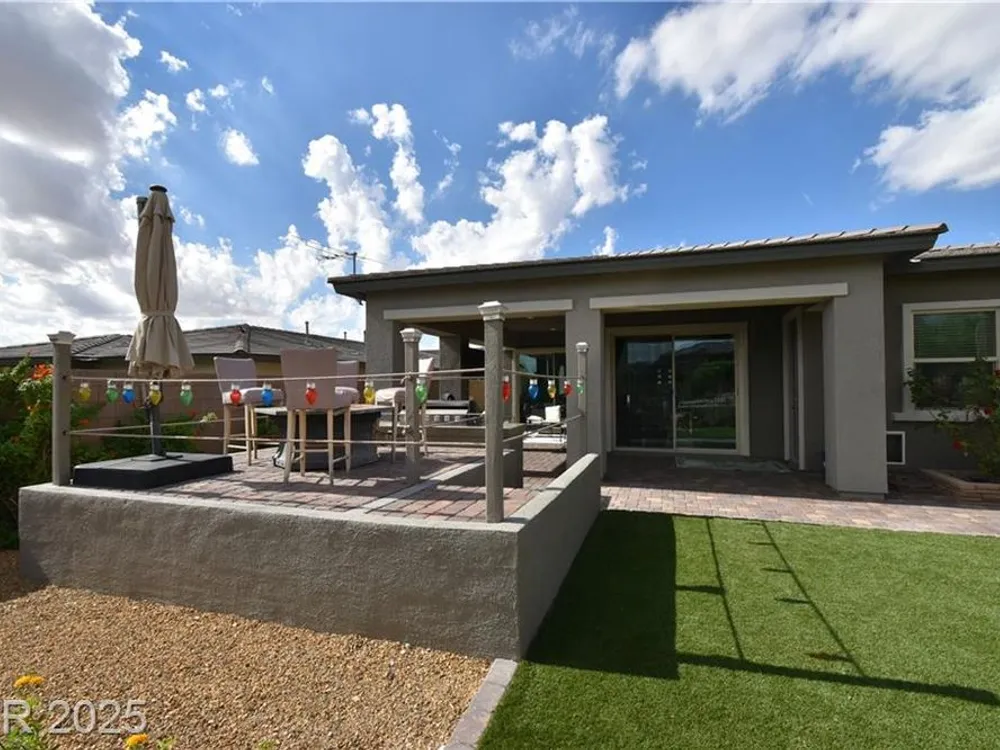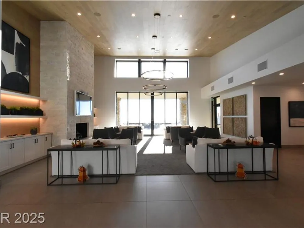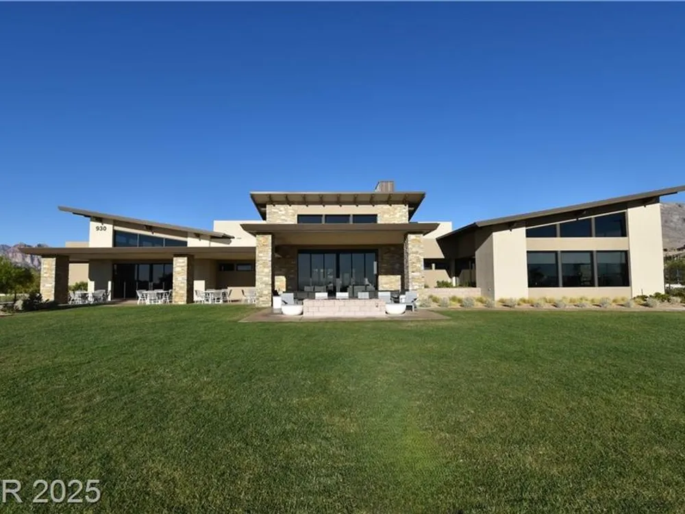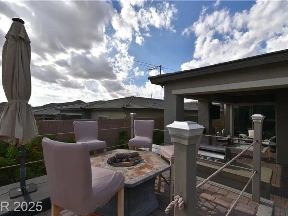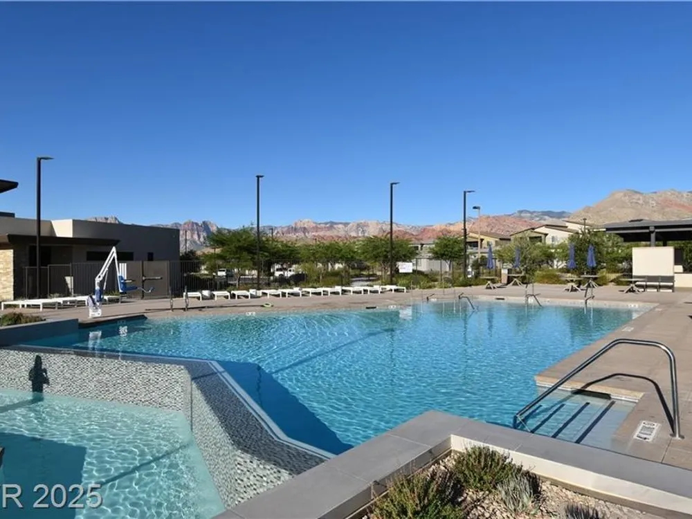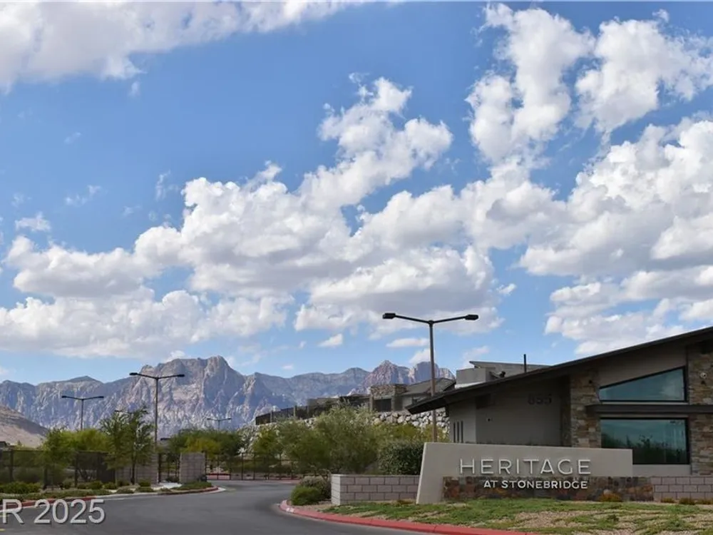 Experience resort style living with stunning views of Red Rock Canyon. This impeccable home is located in Heritage at Stonebridge a 55+ guard gated community in Summerlin. Beautiful home, interior neutral color scheme. "Z" design with (3) sliding doors to the covered patio with (1) dual opening to the patio. Entry wall designer feature w/ cascading light fixture. Cabinets with soft close, luxury brand Monogram appliances. New carpet in the bedrooms. Backyard has a Rose flower garden and lighting on the firepit platform. BBQ island w/ built-in wine cooler and stainless drawers. Gourmet kitchen with quartz counters, large island w/ seating, and walk-in pantry. Primary bath w/ quartz counters & large stall shower with seat. Primary bedroom has a French door to the patio. Great room with an amazing electric fireplace & office area. 2nd bedroom has ceiling fan. Laundry room has cabinets & quartz counters. Enjoy Bocci Ball courts, walking trails, pickle ball court, and community pool & spa.