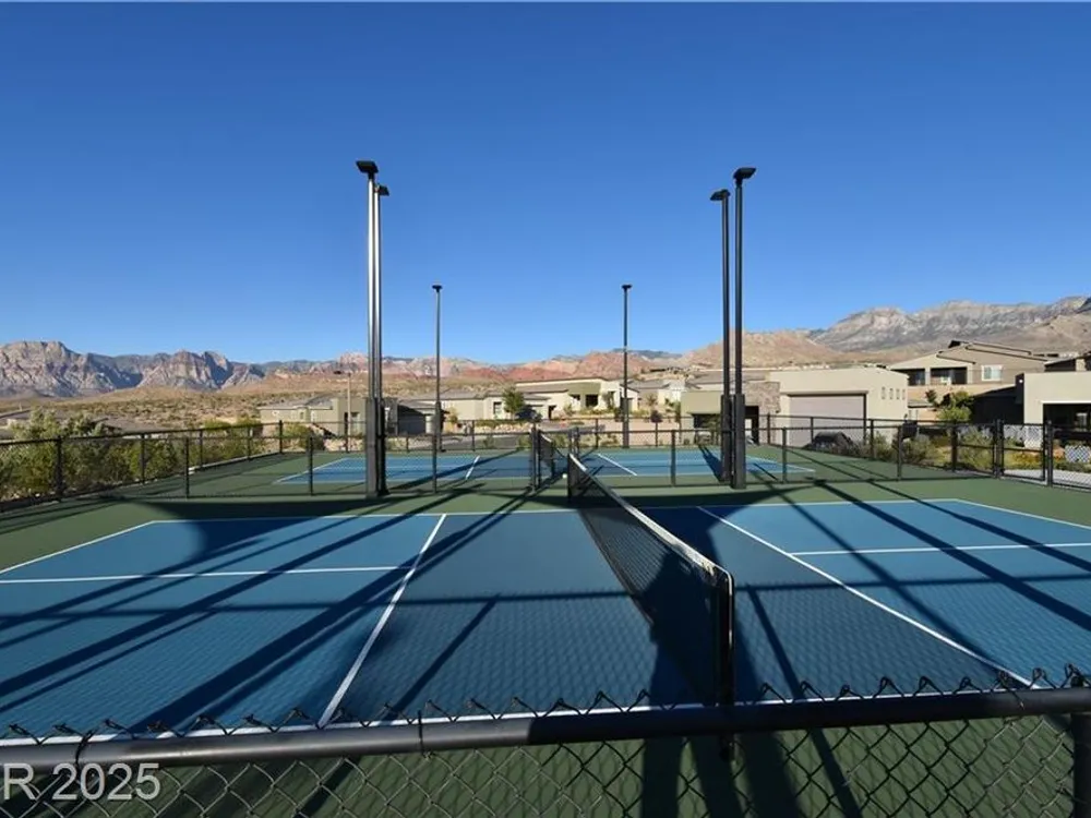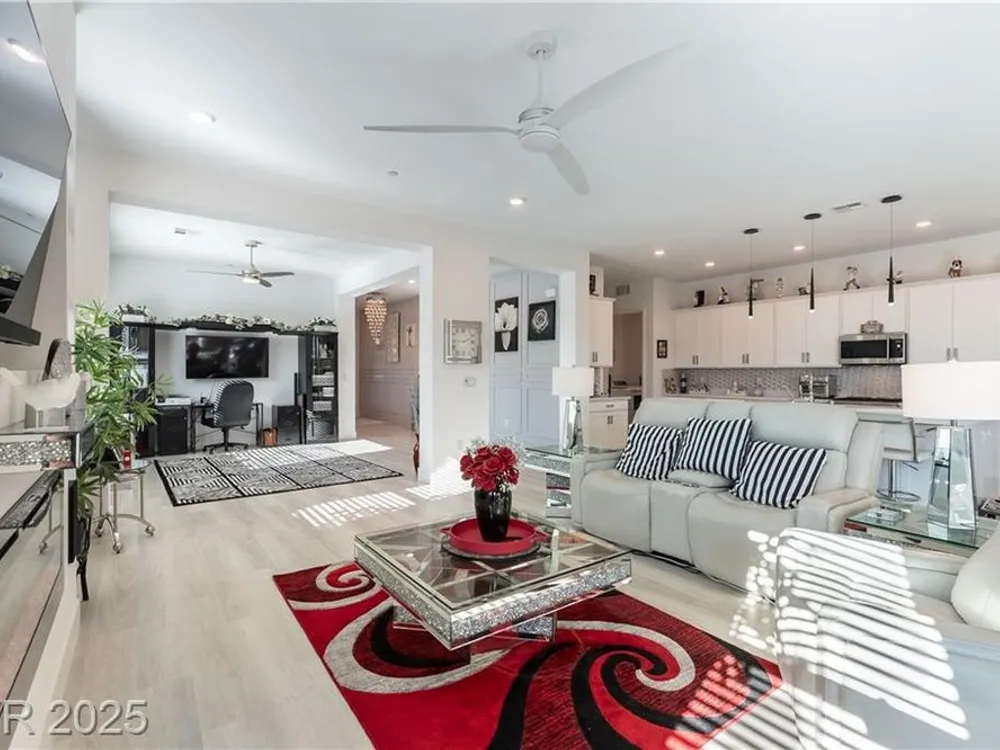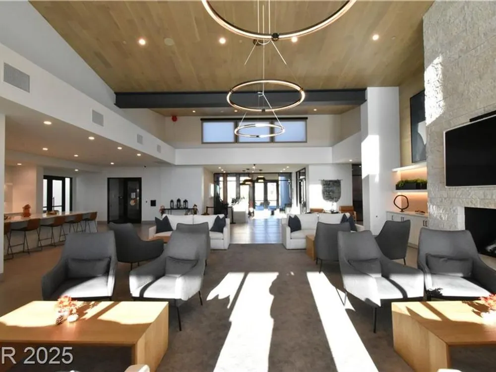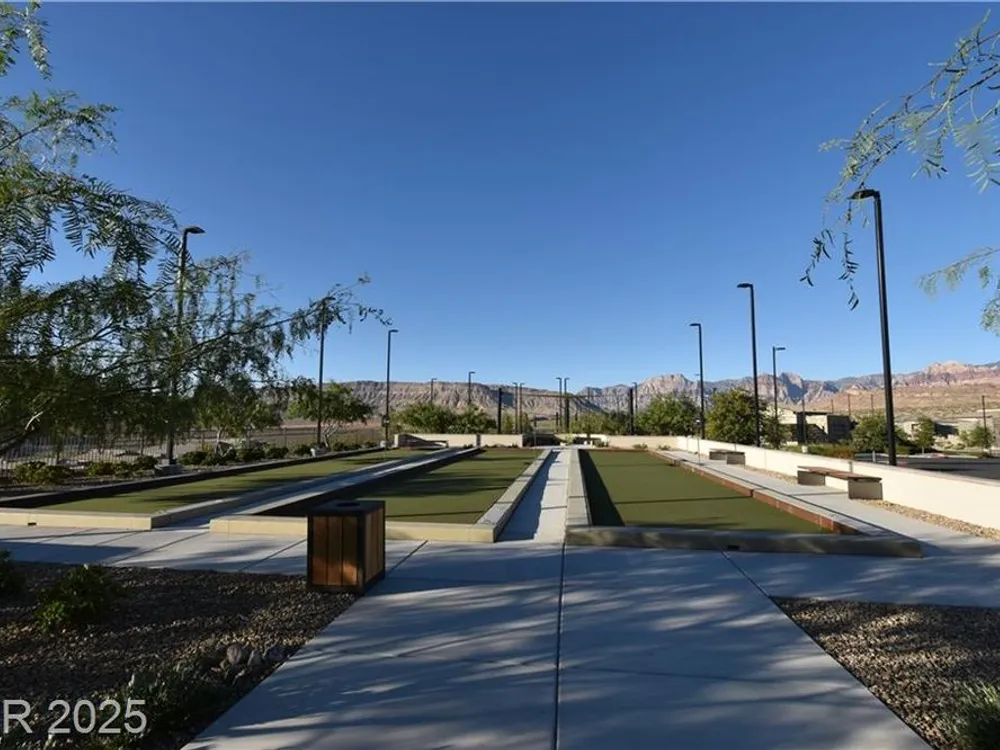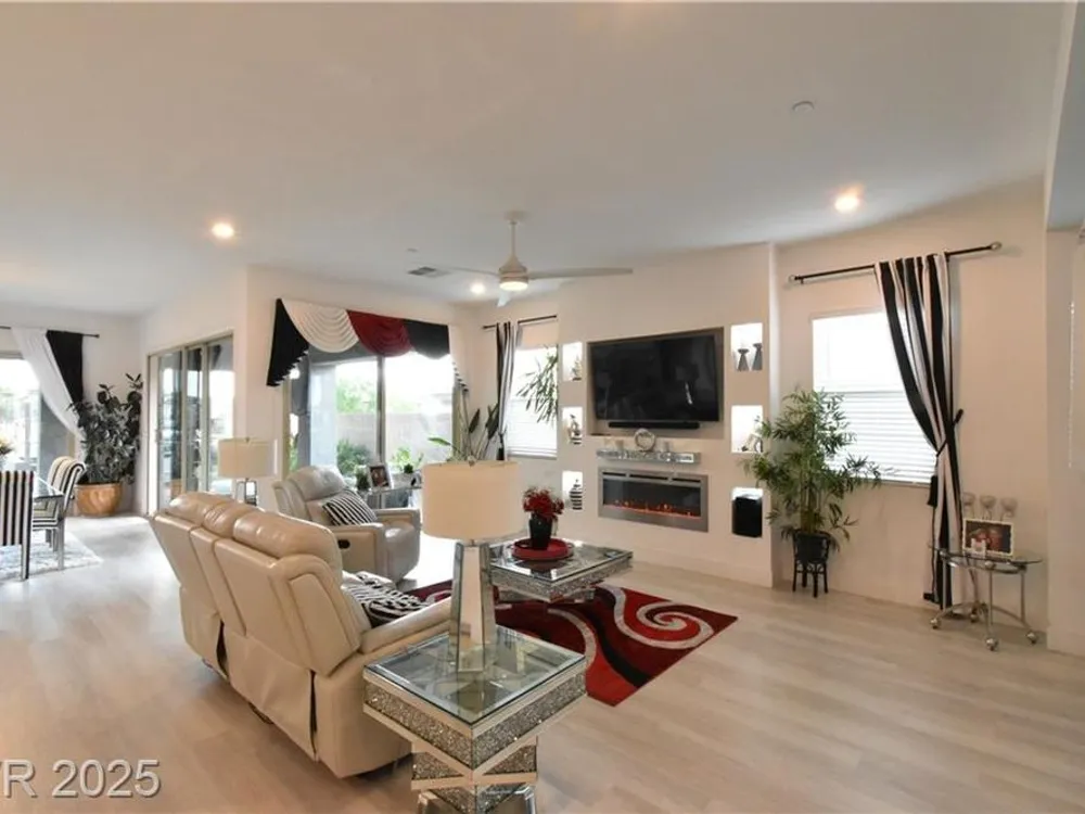 Experience resort style living with stunning views of Red Rock Canyon. This impeccable home is located in Heritage at Stonebridge a 55+ guard gated community in Summerlin. Beautiful home, interior neutral color scheme. "Z" design with (3) sliding doors to the covered patio with (1) dual opening to the patio. Entry wall designer feature w/ cascading light fixture. Cabinets with soft close, luxury brand Monogram appliances. New carpet in the bedrooms. Backyard has a Rose flower garden and lighting on the firepit platform. BBQ island w/ built-in wine cooler and stainless drawers. Gourmet kitchen with quartz counters, large island w/ seating, and walk-in pantry. Primary bath w/ quartz counters & large stall shower with seat. Primary bedroom has a French door to the patio. Great room with an amazing electric fireplace & office area. 2nd bedroom has ceiling fan. Laundry room has cabinets & quartz counters. Enjoy Bocci Ball courts, walking trails, pickle ball court, and community pool & spa.