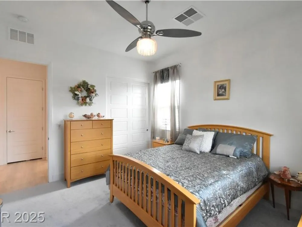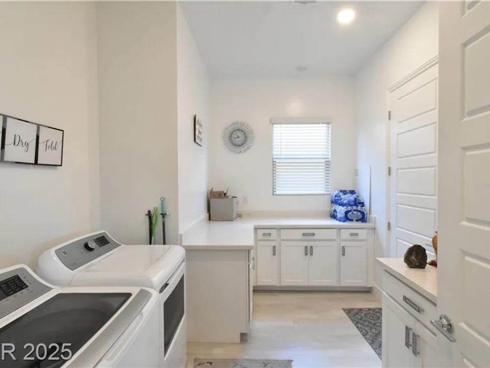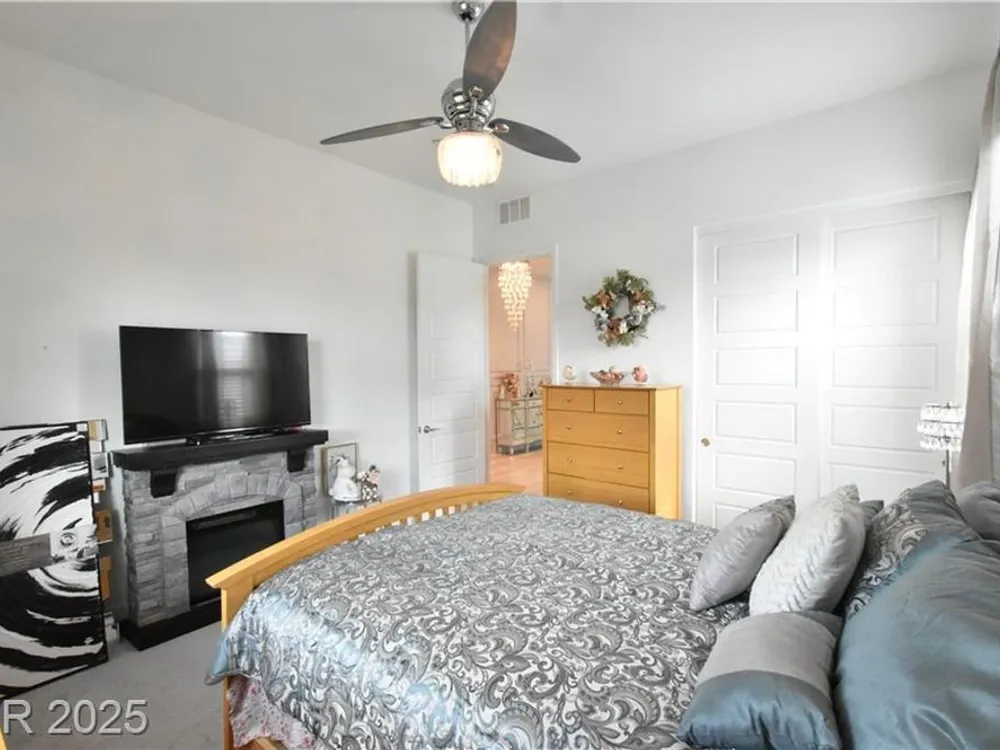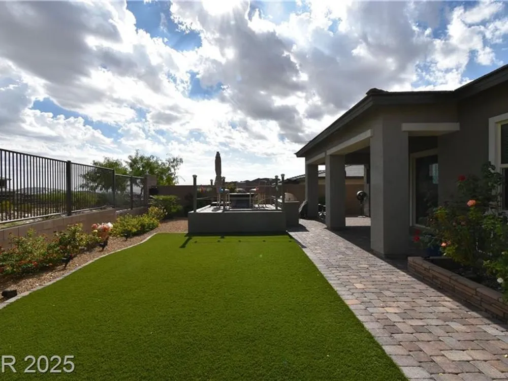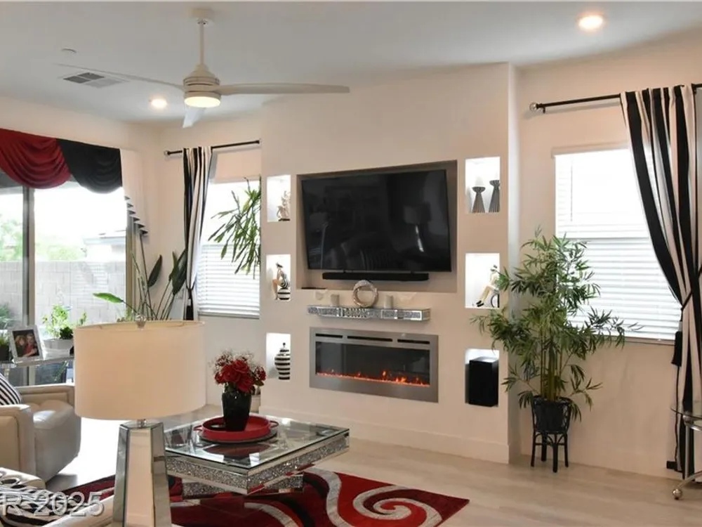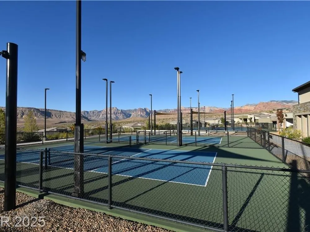 Experience resort style living with stunning views of Red Rock Canyon. This impeccable home is located in Heritage at Stonebridge a 55+ guard gated community in Summerlin. Beautiful home, interior neutral color scheme. "Z" design with (3) sliding doors to the covered patio with (1) dual opening to the patio. Entry wall designer feature w/ cascading light fixture. Cabinets with soft close, luxury brand Monogram appliances. New carpet in the bedrooms. Backyard has a Rose flower garden and lighting on the firepit platform. BBQ island w/ built-in wine cooler and stainless drawers. Gourmet kitchen with quartz counters, large island w/ seating, and walk-in pantry. Primary bath w/ quartz counters & large stall shower with seat. Primary bedroom has a French door to the patio. Great room with an amazing electric fireplace & office area. 2nd bedroom has ceiling fan. Laundry room has cabinets & quartz counters. Enjoy Bocci Ball courts, walking trails, pickle ball court, and community pool & spa.