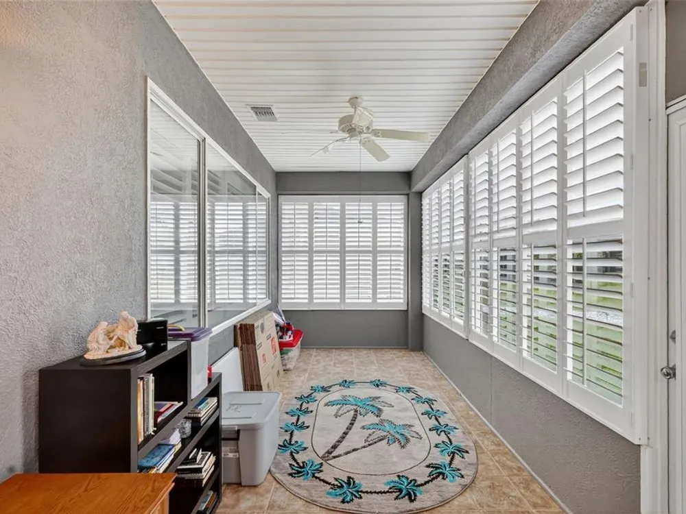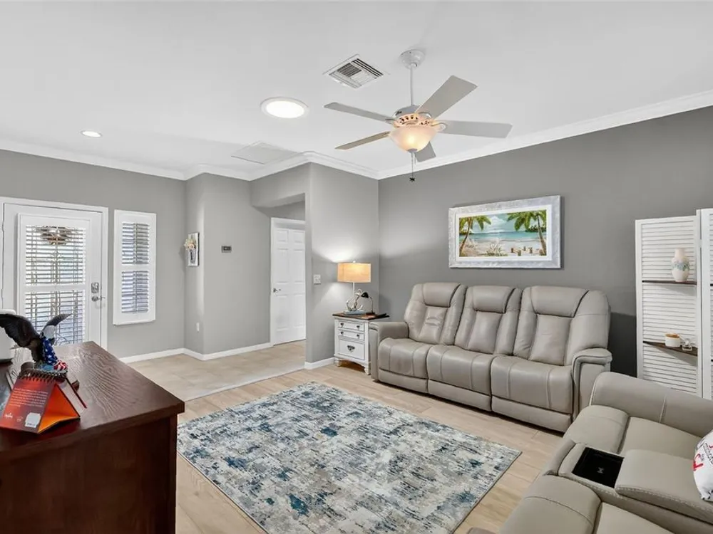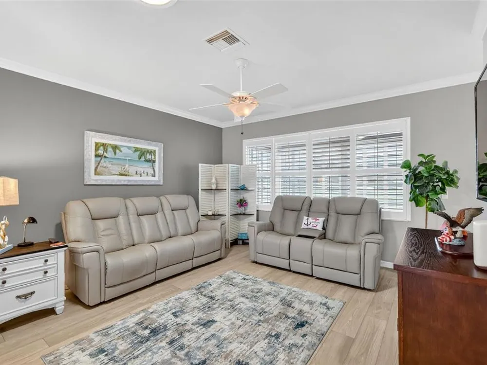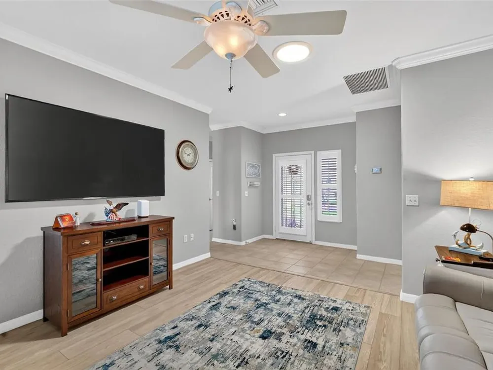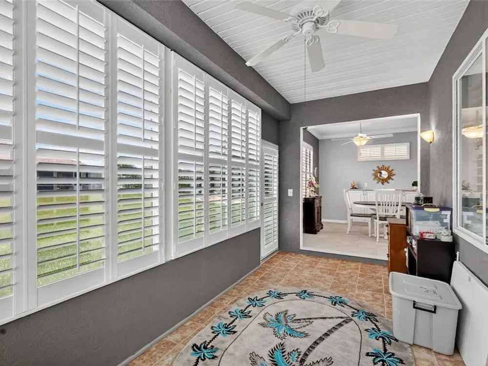 This TURNKEY updated, furnished 2-bedroom, 2-bathroom home is truly inviting. As you approach the residence, you will appreciate the mature landscaping, epoxy driveway and walkway, as well as the landscape curbing complemented by rock beds. Upon entering the home, you will be captivated by its modern charm, highlighted by the glass front door leading to a tiled entryway. The living room is filled with natural light from the windows, a solar tube, and a fan/light combination, connecting to the updated kitchen. This kitchen boasts granite countertops, newer stainless-steel appliances, recessed cabinets, and a pantry. The dining area provides an excellent space for entertaining guests. The owner's suite is a welcoming retreat featuring LVP flooring, a walk-in closet, and an ensuite bathroom equipped with custom mirrors, double sinks, and glass doors leading to a step-in shower with a seat. The guest bedroom also offers a spacious layout with LVP flooring and a fan/light combination with convenient access to updated guest bathroom. The glass enclosed lanai, complete with air conditioning, serves as a versatile space for various uses. The backyard is equally impressive, featuring a pavered sitting area adorned with an umbrella and outdoor furniture, creating an ideal setting for relaxation and enjoyment. Several additional enhancements have been made, including crown molding, plantation shutters, an upgraded air conditioning controller, a new irrigation system that provides control over the B Hive sprinkler, and the installation of more economical sprinkler heads. Del Webb Spruce Creek is a gated 55+ community offering an active lifestyle. Community offers clubhouse with recreation including a swimming pool, fitness room, billiards, pickleball courts, softball clubs, and more. Whether you’re looking for a winter retreat or a home to enjoy year-round, this could be the perfect fit! Quick close possible—ask how to make this home yours today!