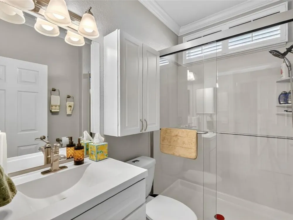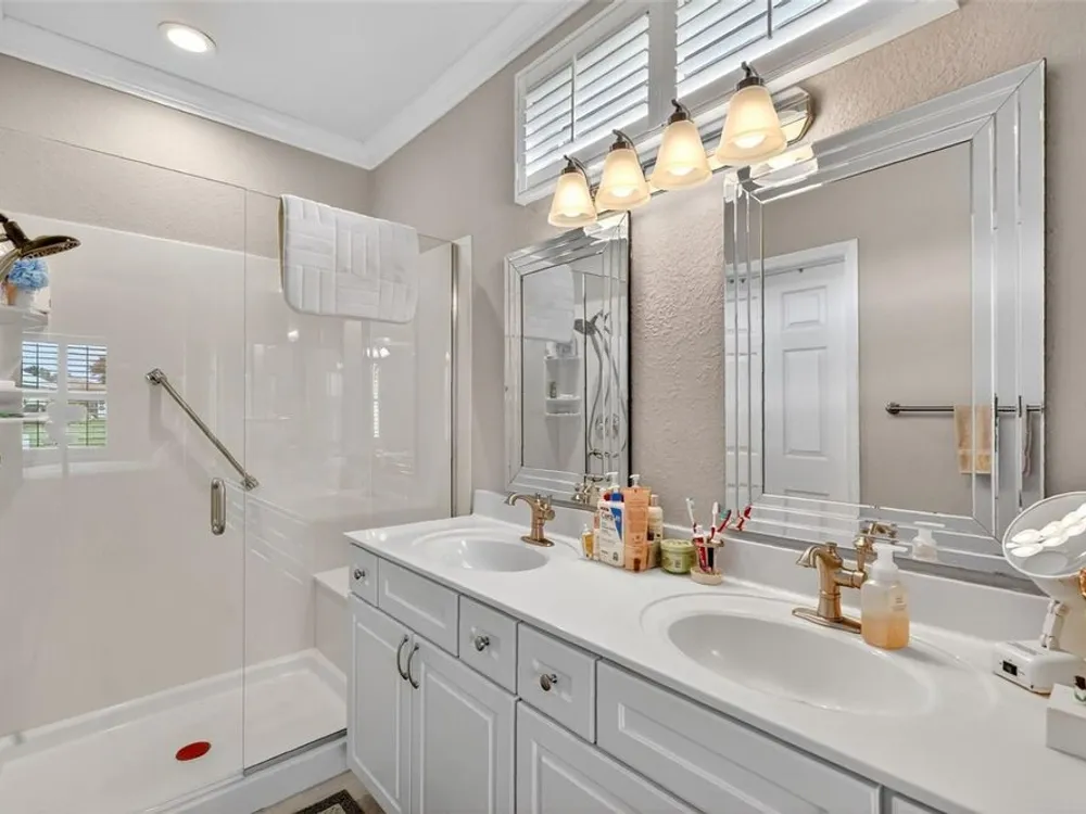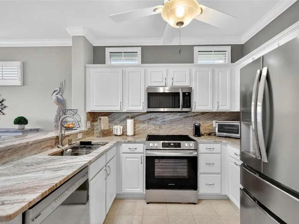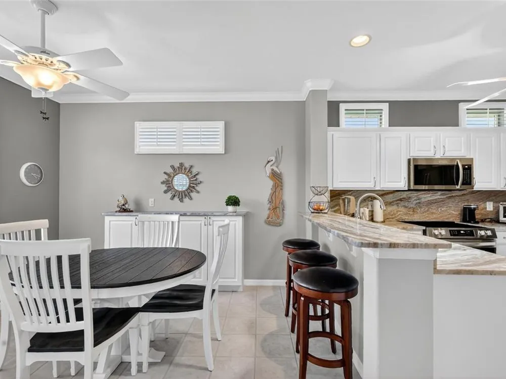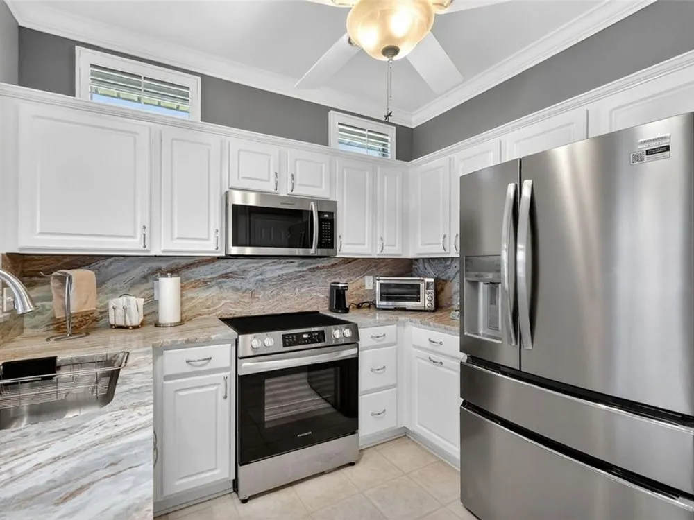 - Ceiling Fan(s), Crown Molding, Main Level Primary, Split Bedrooms, Stone Counters, Thermostat