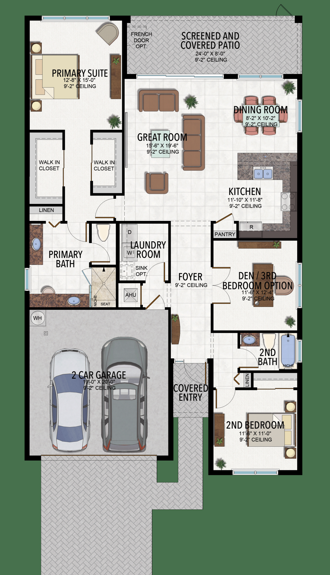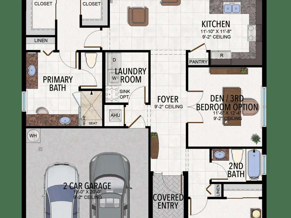 - Built-in Shelving, Closet Cabinetry, Entrance Foyer, Kitchen Island, Split Bedrooms, High Ceilings, Walk-In Closet(s), Home Office, Great Room, Living/Dining Room, Snack Bar, Blinds, Impact Glass, Dual Sinks, Separate Shower