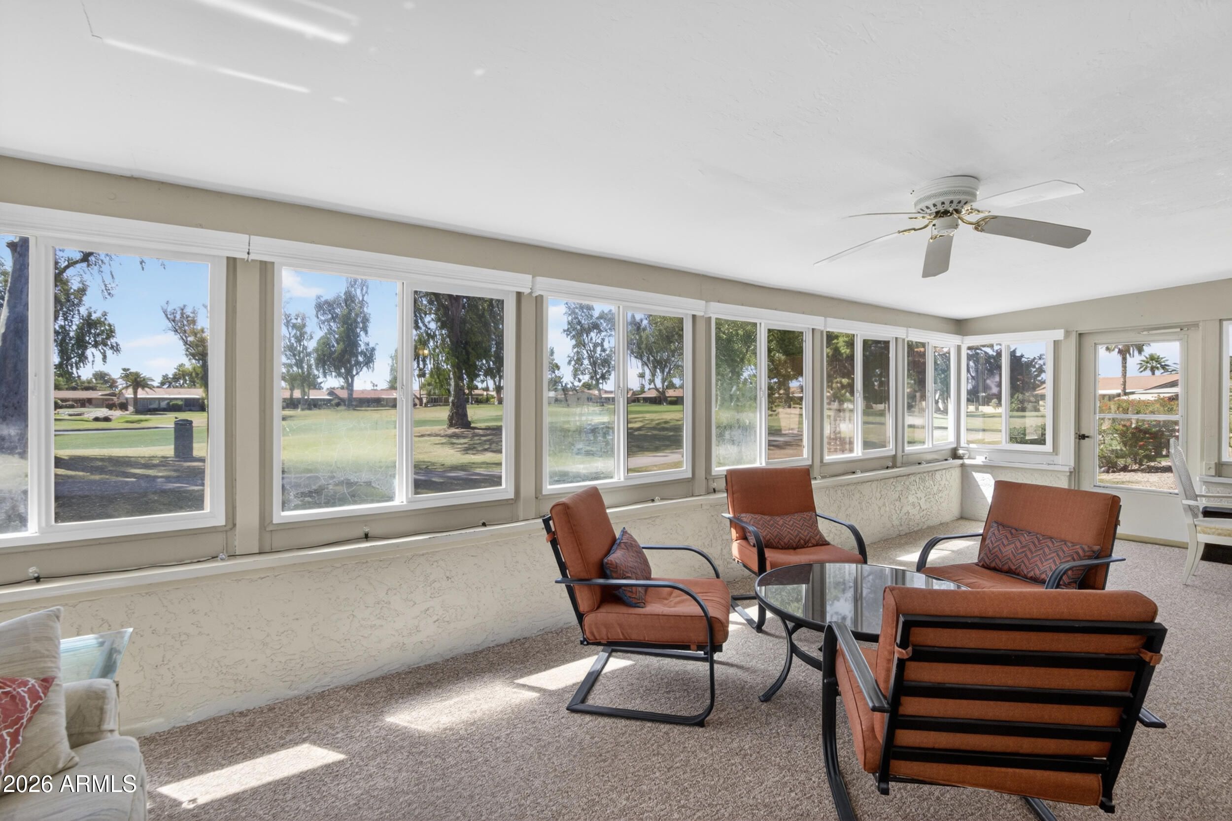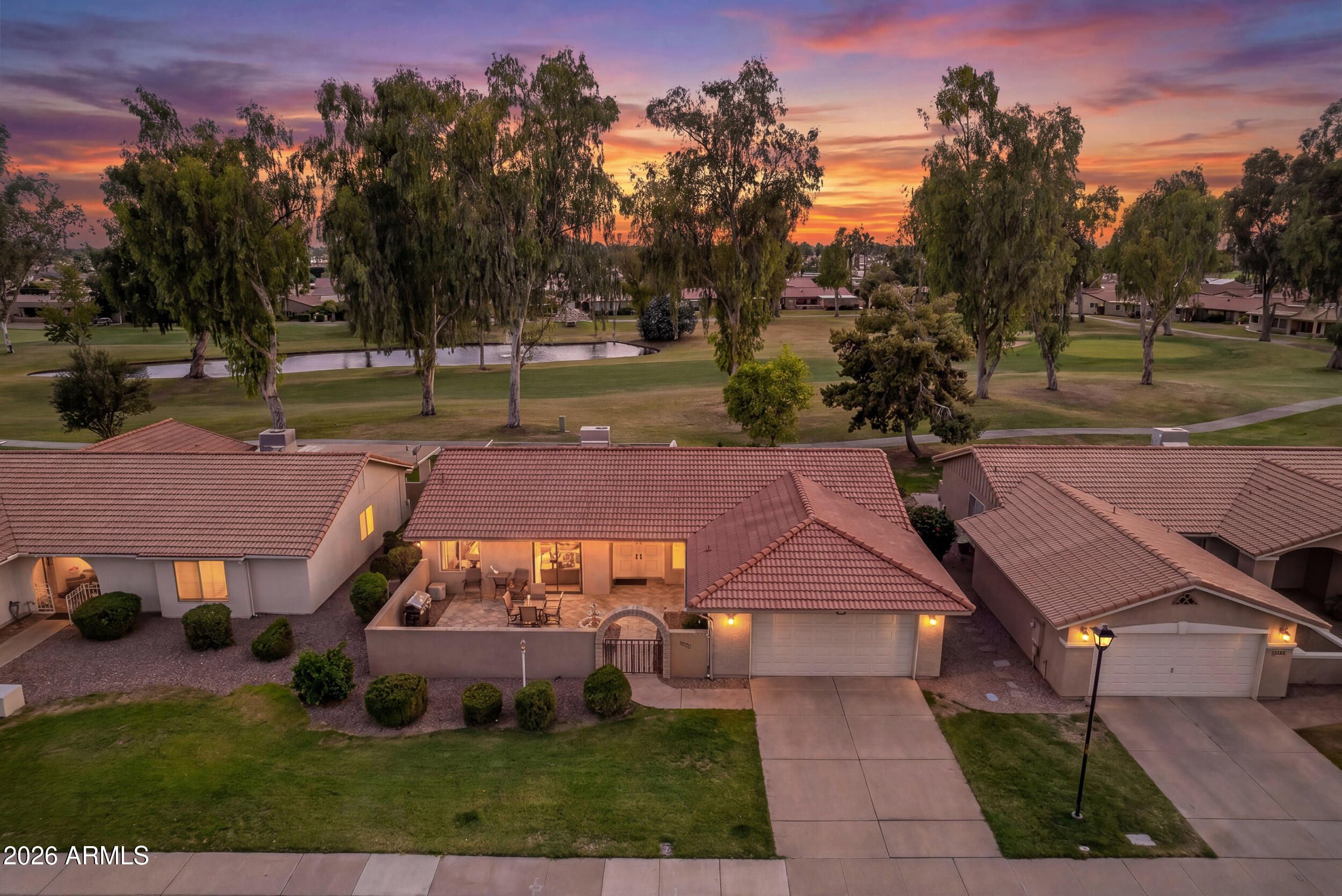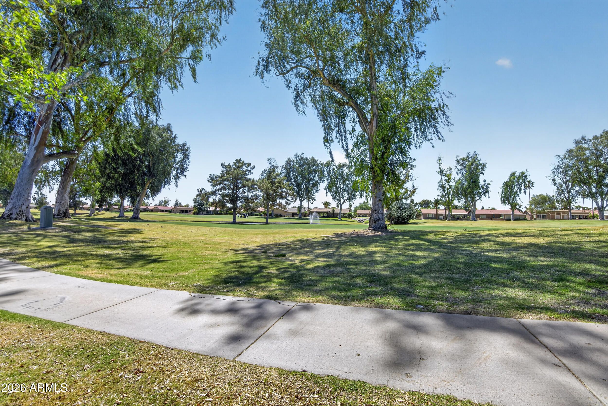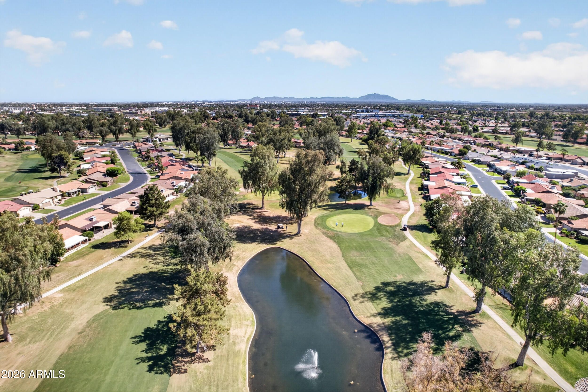 WELCOME TO THIS 2 BEDROOM, 2 BATH GOLF COURSE LOT HOME IN THE 55+ COMMUNITY OF LEISURE WORLD. Set along the 2ND HOLE of LEISURE WORLD COUNTRY CLUB, the backyard opens to sweeping golf course views and a quiet setting that is hard to find. The home offers SPACIOUS LIVING AREAS and a LARGE PRIMARY SUITE with great natural light, a WALK IN CLOSET, dual granite vanity, and walk in shower. The AIR CONDITIONED ARIZONA ROOM provides additional space to unwind, read, or gather with friends while enjoying the view. Out front, a WELCOMING COURTYARD with a WATER FEATURE creates a charming entry. The TWO CAR GARAGE includes built in cabinets for extra storage. Located near Banner Baywood Medical Center, shopping, dining, parks, and convenient access to the US 60 and Loop 202.