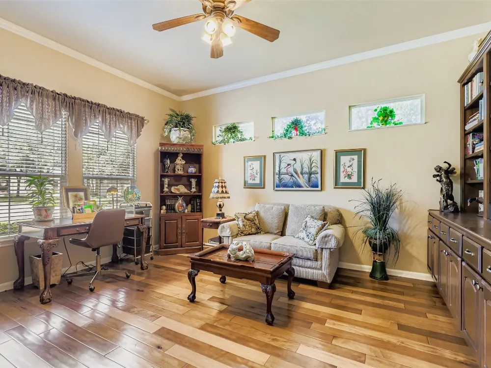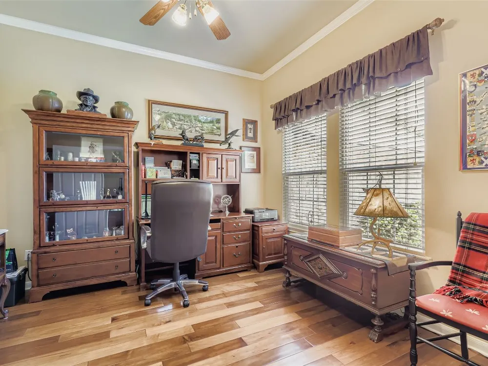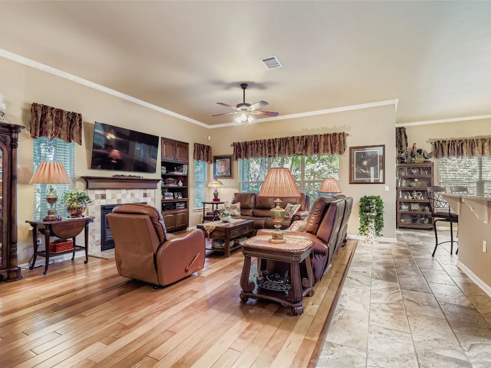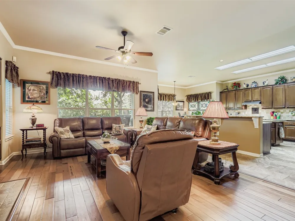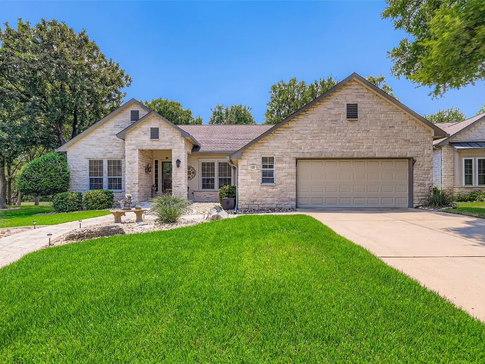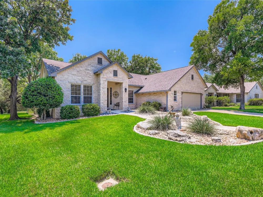 An extraordinary opportunity to make this stunning residence your personal sanctuary! Nestled in the highly sought-after Sun City community, this remarkable residence offers an opportunity to unwind amidst breathtaking golf course views, framed by lush, mature landscaping. This home is equipped with a durable hail-resistant roof installed in September 2025.The exquisite Pedernales floor plan creates an atmosphere of tranquility that will make you feel at home from the moment you enter. As you walk through the front door, you’re greeted by a stylish office space which is easily adaptable into a third bedroom if needed. The expansive living room is adorned with built-in cabinetry, providing a stunning backdrop for your cherished memories. Gather in the inviting family room, where a cozy fireplace serves as the heart of the home. The kitchen features sleek granite countertops and high-end stainless-steel appliances. This space beautifully combines functionality with elegance, making it the perfect setting for entertaining guests or whipping up your favorite meals. Retreat to your spacious master suite, designed to be your private oasis. Enjoy the serene views from the bay window and indulge in the remodeled master bath, boasting a spa-like walk-in shower, abundant storage, and a stylish vanity that perfectly balances comfort and sophistication. With dual ensuite bedrooms, this home ensures comfort and privacy for family and guests alike. Bask in the warmth of rich hardwood and durable tile flooring, beautifully complemented by plush carpeting in the bedrooms. Step outside onto the expansive back patio, crafted with low-maintenance Trex composite decking—the ideal space to enjoy your morning coffee or evening gatherings while soaking in the stunning vistas. For your convenience, a negotiable washer, dryer, and refrigerator are included, making this home truly move-in ready! With a spacious 2.5-car garage, you'll have plenty of storage for all your adventures.