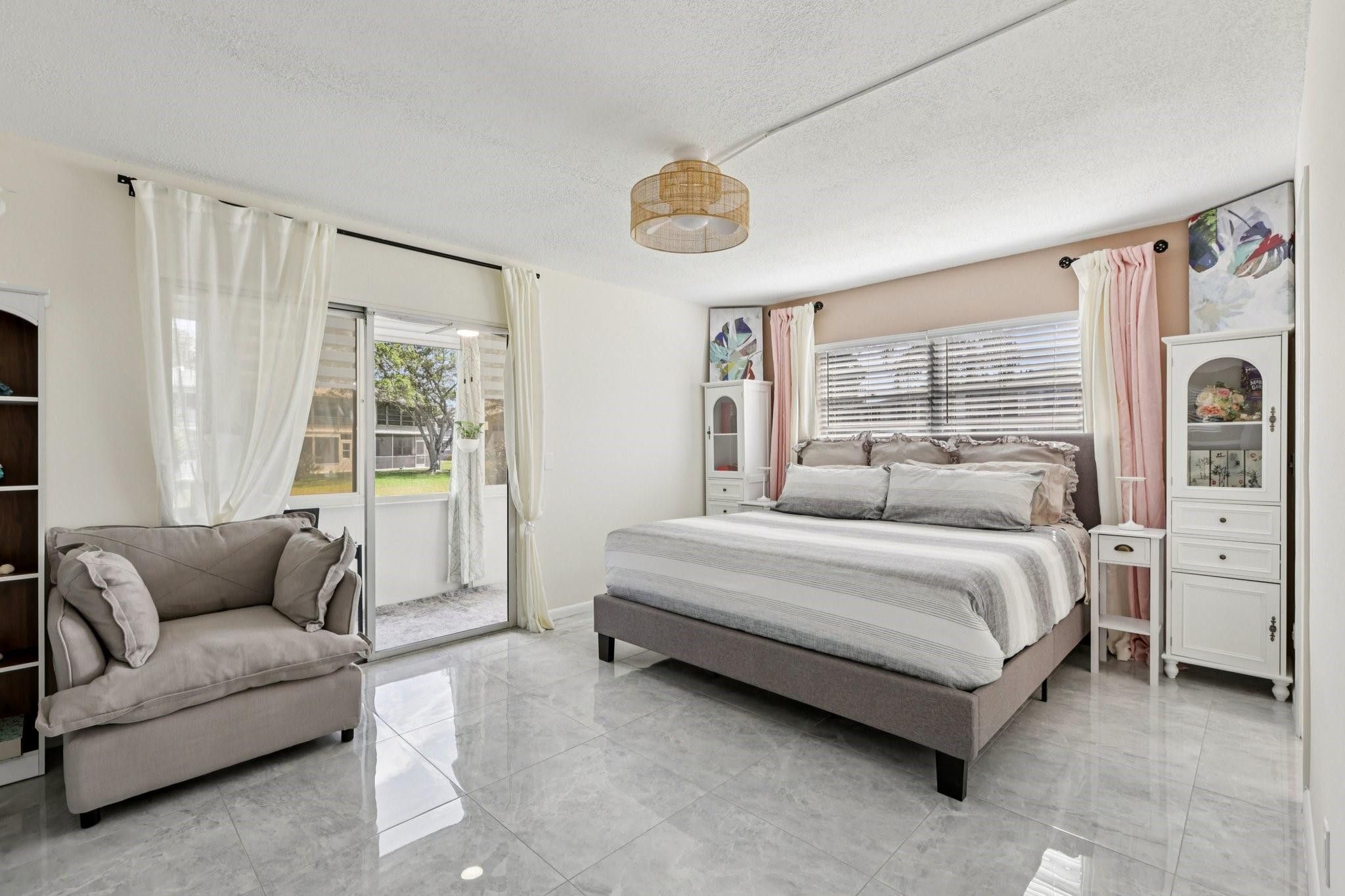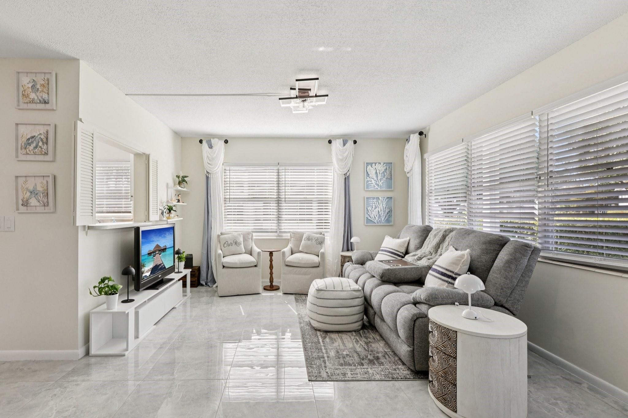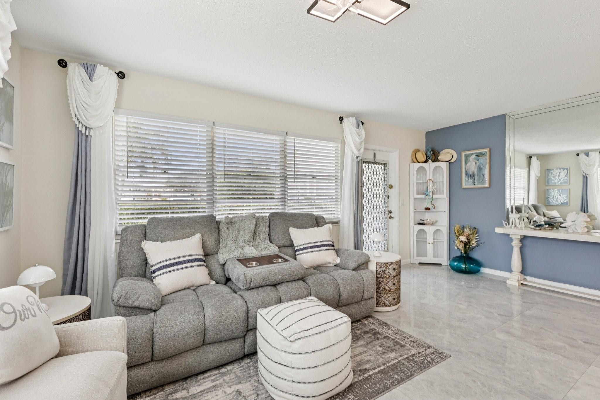 Beautifully updated 1-bedroom, 1.5-bath first-floor corner unit in highly desirable Century Village. This light-filled residence features gorgeous tile flooring throughout, new light fixtures, custom closet organizers, and updated doors designed for improved accessibility and everyday comfort. Enjoy the convenience of a screened patio perfect for relaxed indoor-outdoor living in this quaint garden apartment. The ground-level location offers easy access and added appeal, all set within a quiet, well-maintained community. Beautiful grounds, convenient parking, and access to Century Village amenities including clubhouse, pools, fitness center, and social activities create an easy, low-maintenance lifestyle in a sought-after 55+ setting.