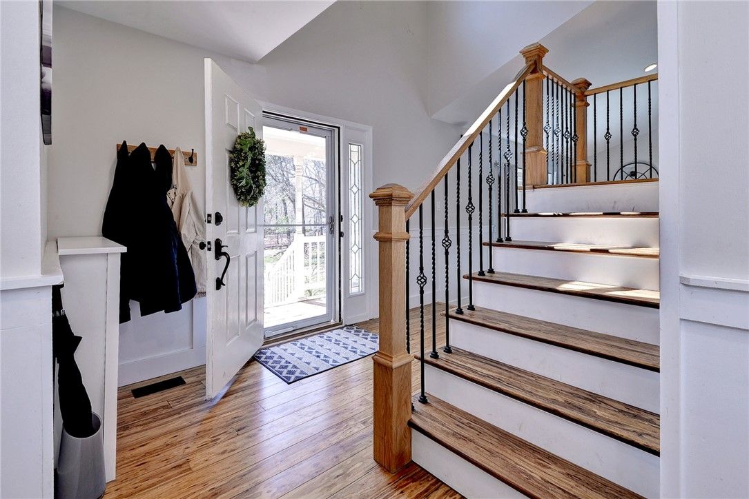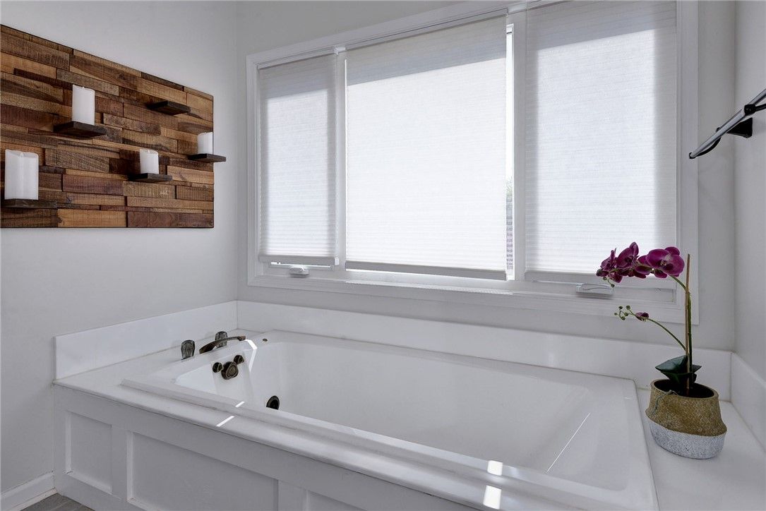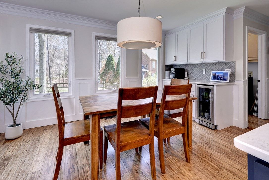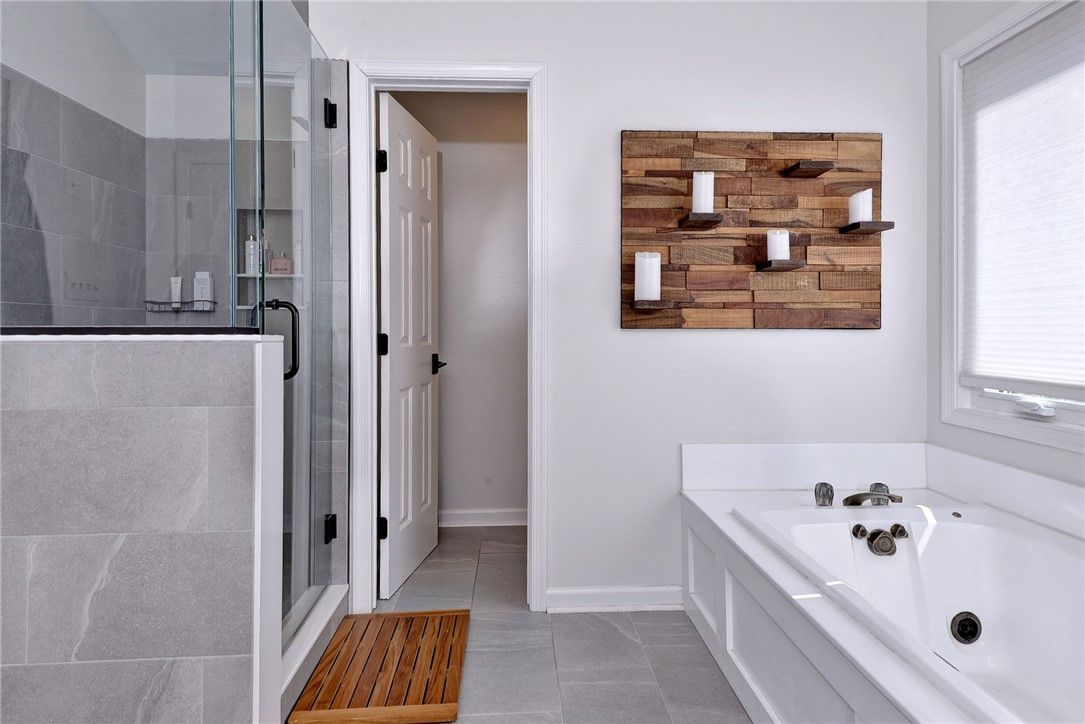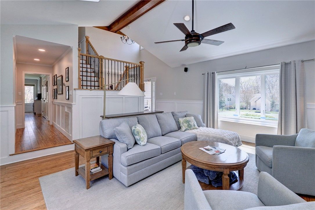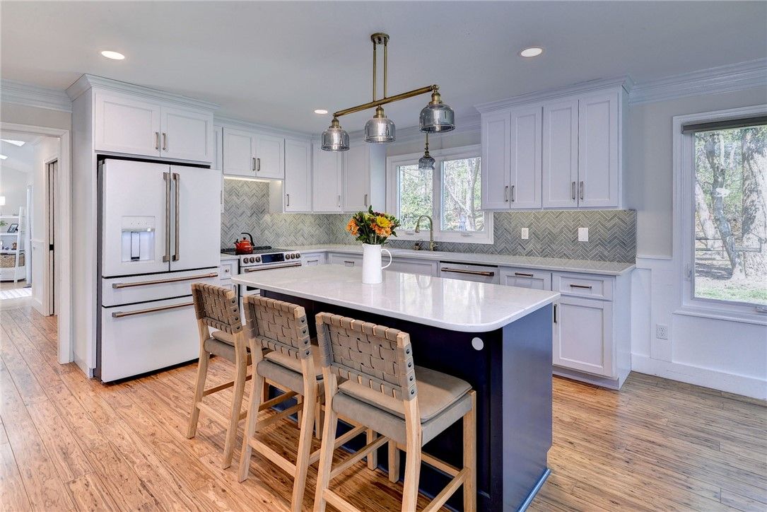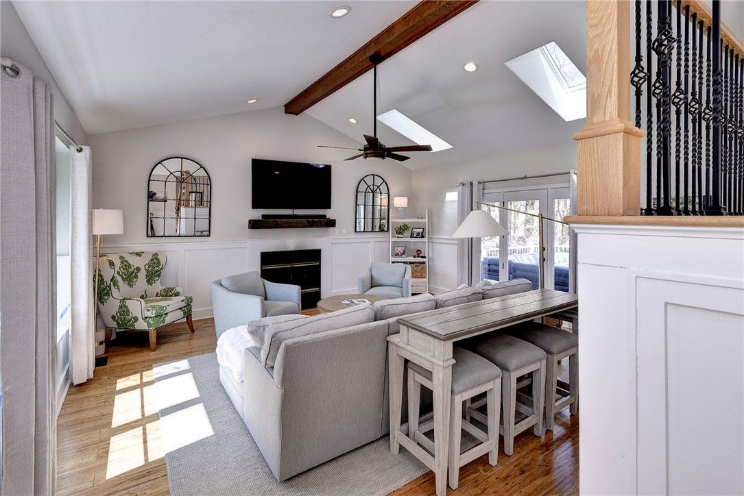 Set on a beautiful lightly wooded lot in Kingsmill this freshly updated home blends contemporary style with classic colonial character creating both a welcoming approach and strong curb appeal. Inside, hardwood plank flooring runs throughout the main living areas, tying the home together with seamless continuity. The staircase makes an immediate impression with wrought iron pickets, a wood handrail, and classic colonial-style posts—perfectly capturing the home’s mix of modern and traditional design. The living room is bright and inviting, featuring a classic fireplace with a floating wood beam accent,, recessed lighting, and skylights that fill the space with natural light. The open layout flows into a fully updated kitchen designed with both style and function. Within it you have white shaker cabinetry, quartz countertops, a large island accented with navy cabinets, chevron tile backsplash, and a full suite of white Café appliances. A breakfast nook, built-in pantry cabinets, and coffee bar with beverage fridge add everyday convenience and flexibility. The primary suite offers a true retreat with an oversized tile shower with inset nooks and a semi frameless glass door, double sink vanity with quartz top, a low sitting soaking tub and a spacious walk-in closet. Two additional bedrooms and a well-appointed hall bath with double vanity provide comfortable accommodations for family or guests. Step outside to a Trex deck with black pickets and white vinyl railing overlooking a large, fenced backyard. Below, an expansive stone paver patio creates the perfect setup for entertaining, with space for a firepit, grill, and multiple seating areas. The yard itself is private, usable, and framed by mature trees all while adding convenient access to Kingsmill walking path. A two-car garage with excellent storage rounds out the practical features that make this home truly stand out. 125 Peter Lyall delivers the kind of high-end remodeling buyers are looking for, while also offering the important updates a home of this caliber should have. Beyond the cosmetic finishes, features like brand new ProVia windows add real value in efficiency and long-term performance. Combined with a detailed trim package including board and batten wainscoting, the home strikes the right balance between style and substance. All of this set within the Kingsmill community; this home offers a rare combination of style, function, and setting.