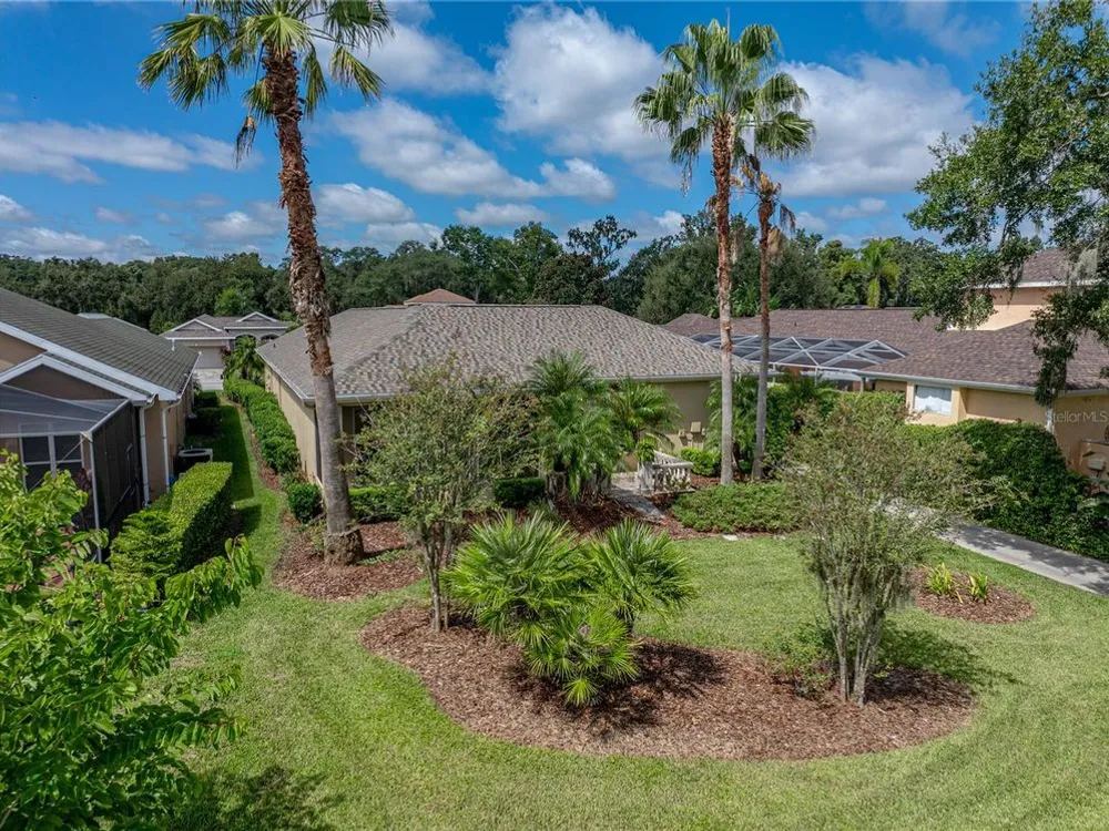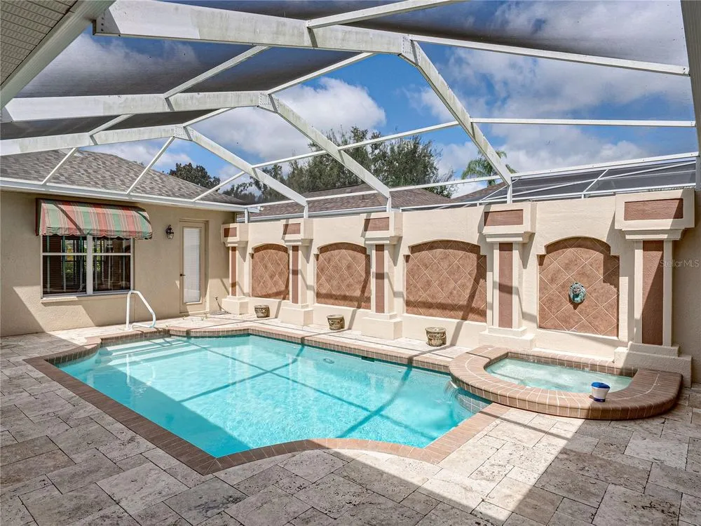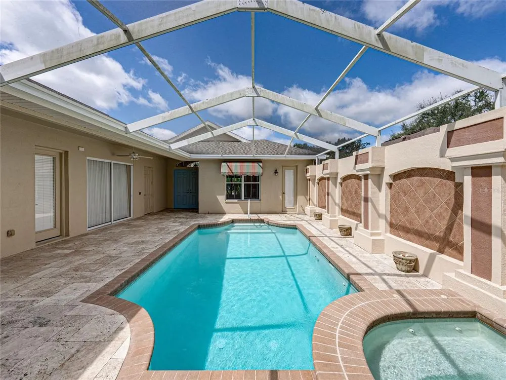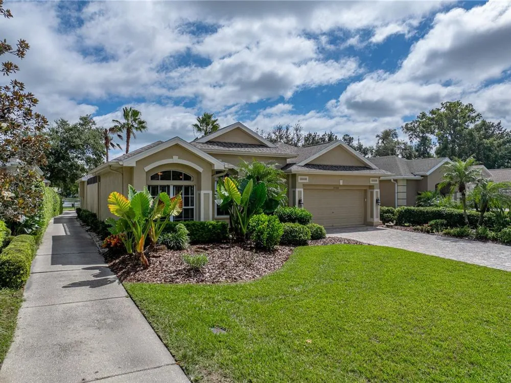 Tropical beauty and resort-style living come together in this Lake Jovita cabana home, with a new Roof, AC, and water heater, all perfectly set on a 1/4-acre lot with sweeping golf and pond views. Known and loved for its unique layout, this residence wraps around a sparkling heated pool and spa, creating a private courtyard retreat you’ll never want to leave. Arrive to lush landscaping, a paver driveway, and a gated front entryway that sets the tone for the serene oasis beyond. Through double doors, the travertine-tiled courtyard opens to both the 2 bedroom, 2 bath main home and the 1 bedroom, 1 bath guest cabana, offering an ideal setup for visitors, multigenerational living, or a private home office. Inside the main home, thoughtful design details include coffered ceilings, crown molding, built-in shelving, a split-bedroom layout, and quadruple sliding doors that seamlessly extend the living space to the screened porch and present stunning views of Lake Jovita’s 13th South Tee Box. Prepare your everyday meals with ease- this eat-in kitchen is nicely equipped and has plenty of dining space! It features Corian countertops, breakfast bar seating, an eat-in dinette with pool views, stainless steel appliances, and an oversized walk-in pantry. The primary suite is privately tucked away, offering direct pool access, a generous walk-in closet, and a spacious ensuite with dual sinks, a soaking tub, walk-in shower, and water closet. The guest bedroom is across the home positioned near the second full bath with pool access and the laundry room. Outdoors, the screened porch and travertine grilling patio provide plenty of space to relax and entertain while enjoying beautiful Florida sunsets and uninterrupted golf course and pond views. A tranquil paradise set within the gates of the desirable gated Lake Jovita community offering high speed Blue Stream internet, a playground, pickleball court, basketball court, dog park, and walking trails. Optional amenity packages are available at the Lake Jovita Golf and Country Club including access to two 18-hole champion golf courses, a restaurant, swimming pool, tennis courts, and more! Don’t miss the chance to experience cabana living in one of Tampa Bay’s premier golf course communities, schedule your private showing today!