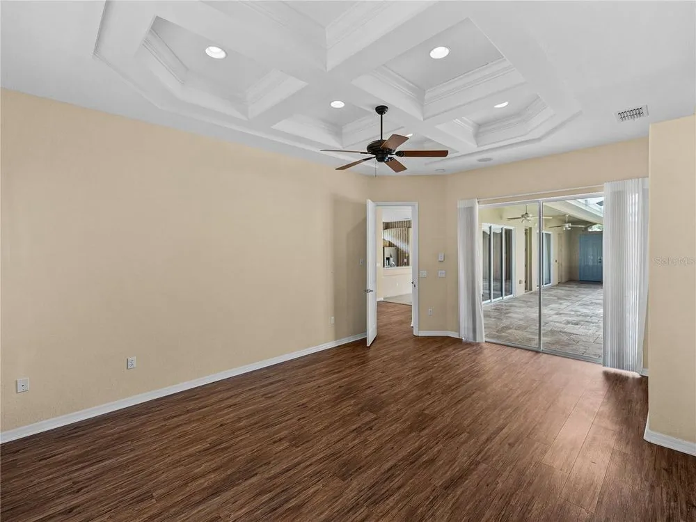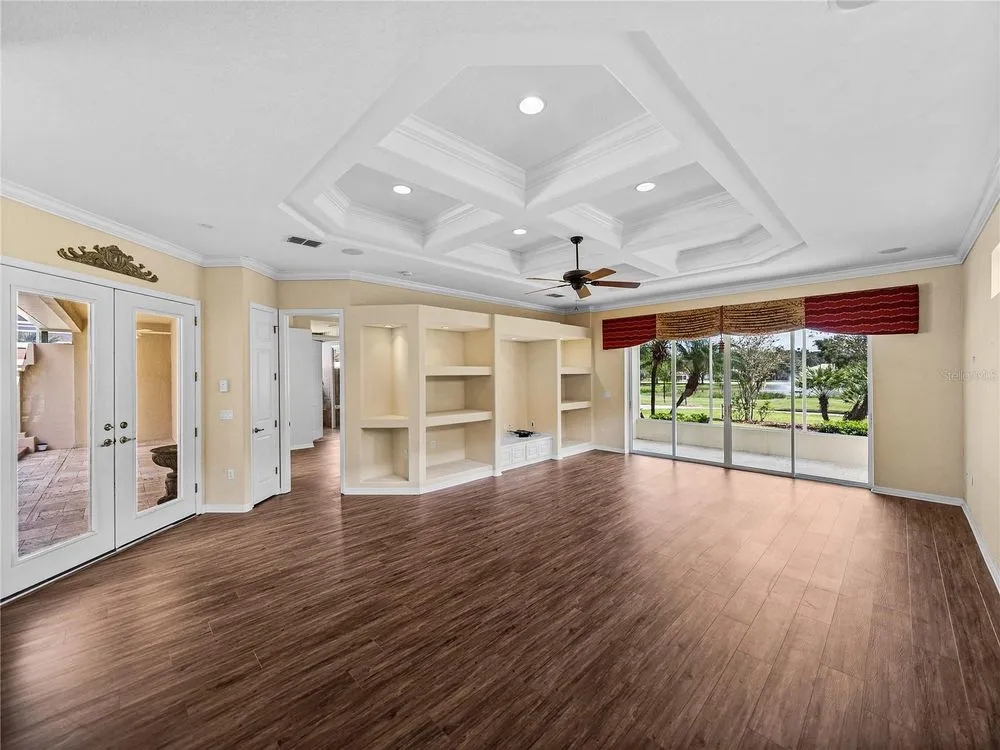 - Built-in Features, Ceiling Fan(s), Coffered Ceiling(s), Crown Molding, Eat-in Kitchen, High Ceilings, Living/Dining Room, Main Level Primary, Solid Surface Counters, Split Bedrooms, Walk-In Closet(s)